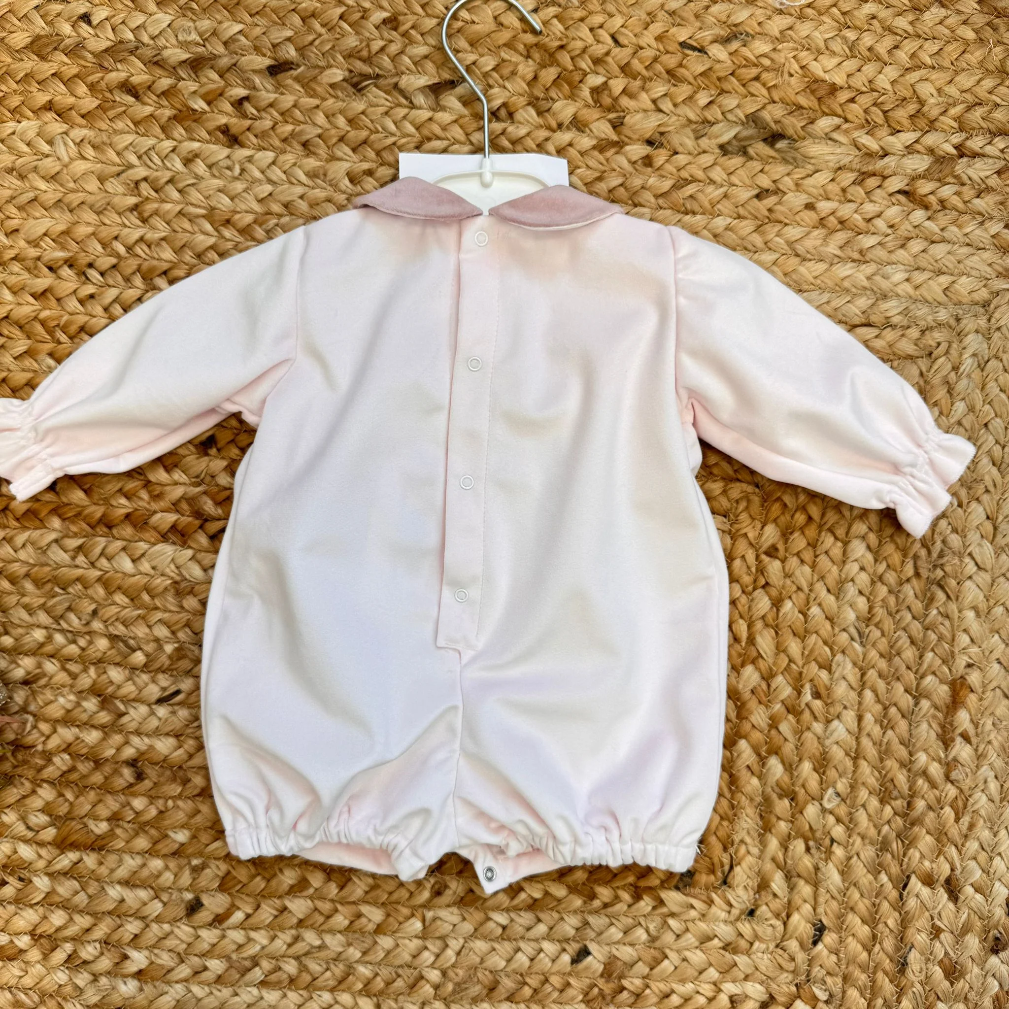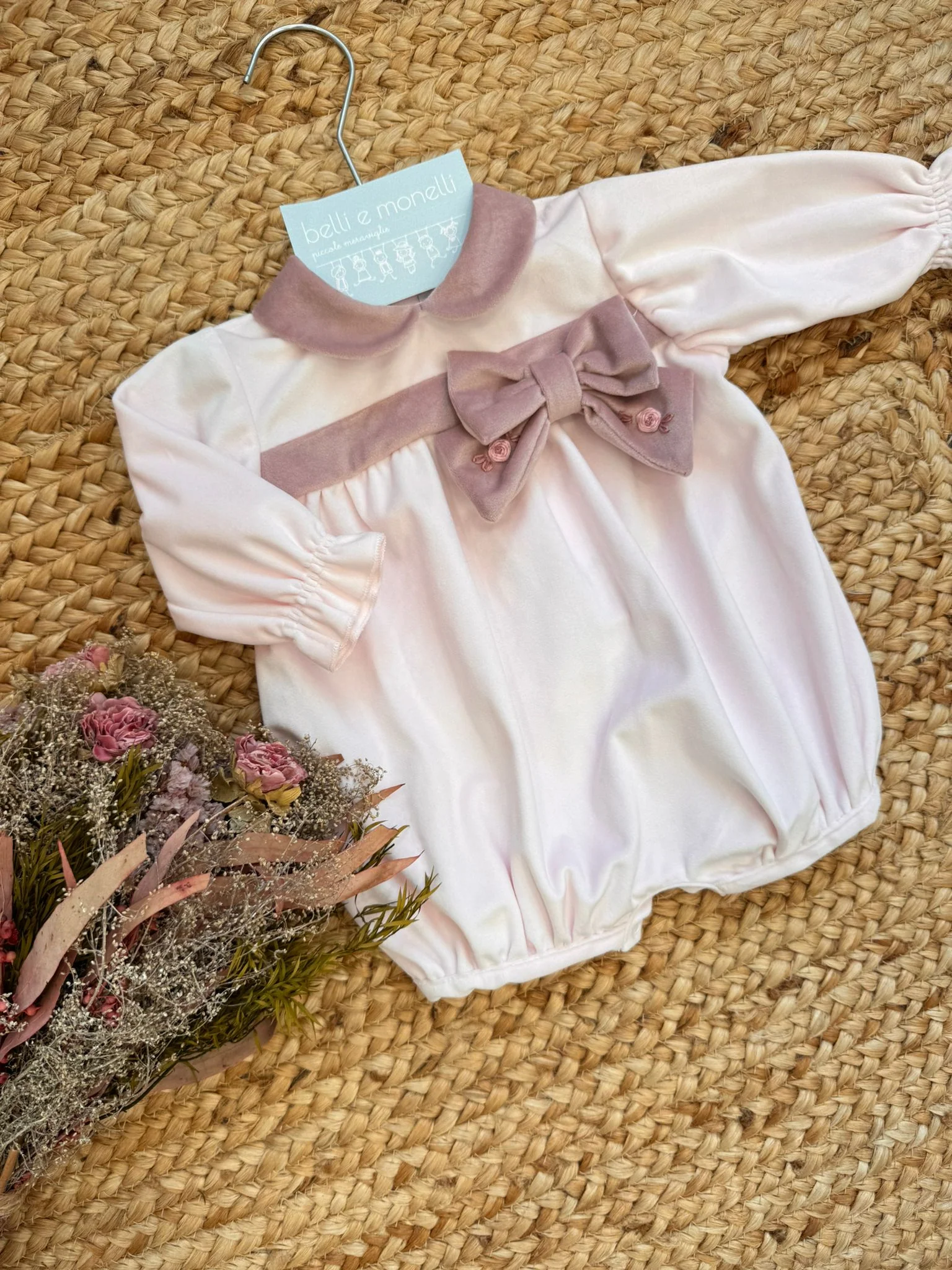 Pagliaccetto neonata velluto rosa con fiocco ricamato