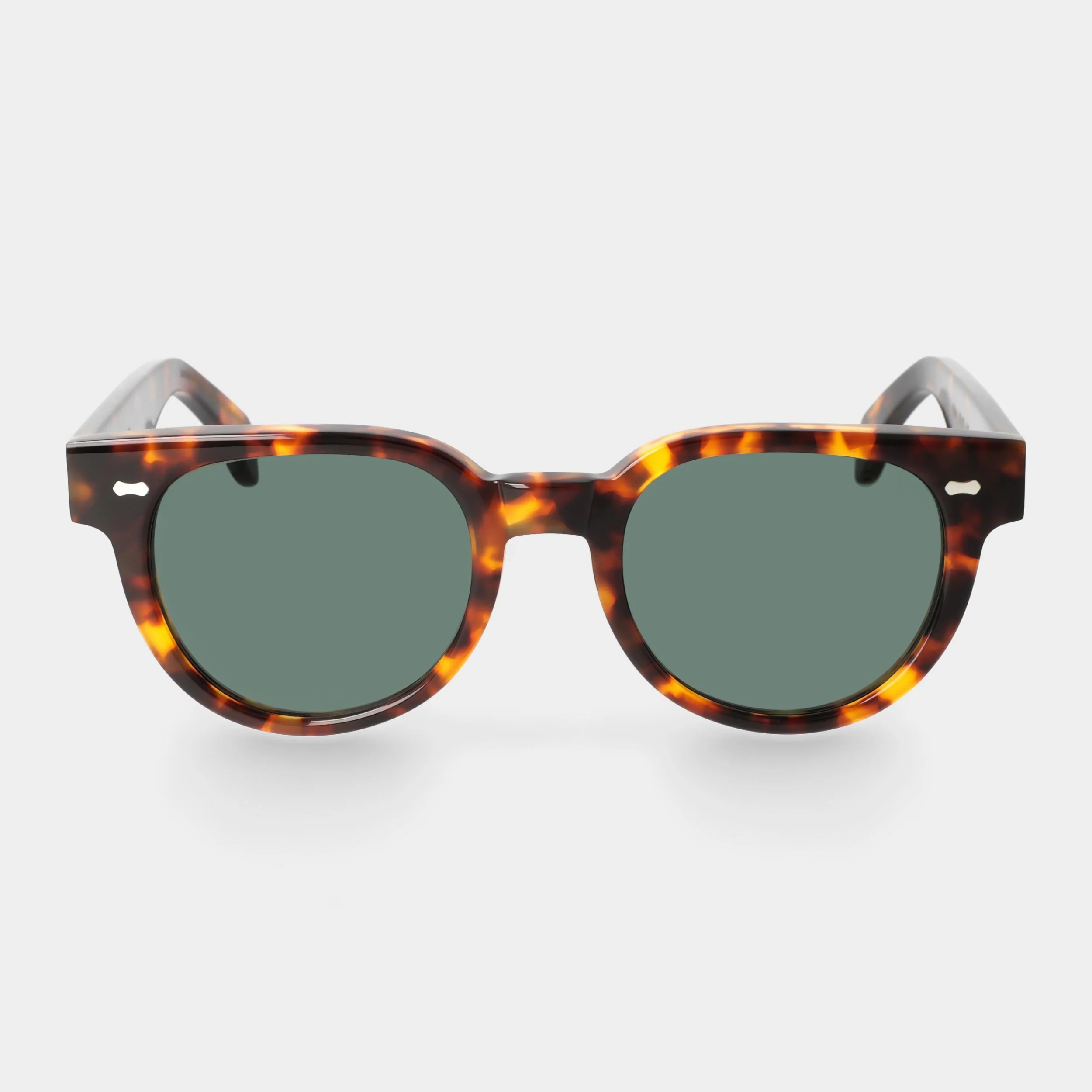 Questi occhiali da sole rotondi tartarugati con angoli smussati sono interpretati con stile e raffinatezza in questa combinazione di colori. Fatti a mano in Italia con lenti bio-based, perfetti per i visi quadrati.