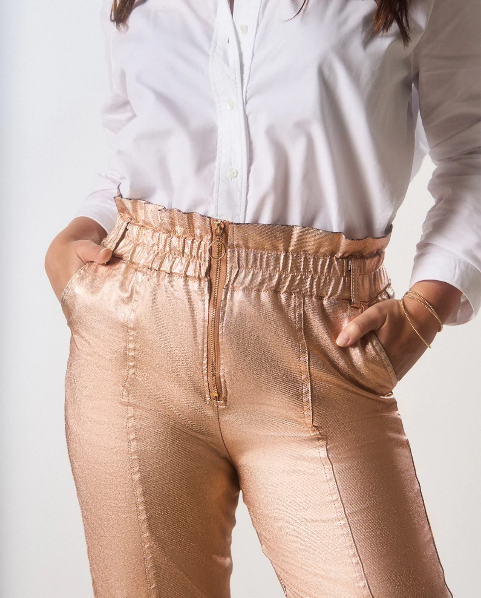 • Jean enduit avec taille élastique• Ouverture zippée au milieu devant• 2 poches italiennes devant• 2 découpes verticales devant et dos