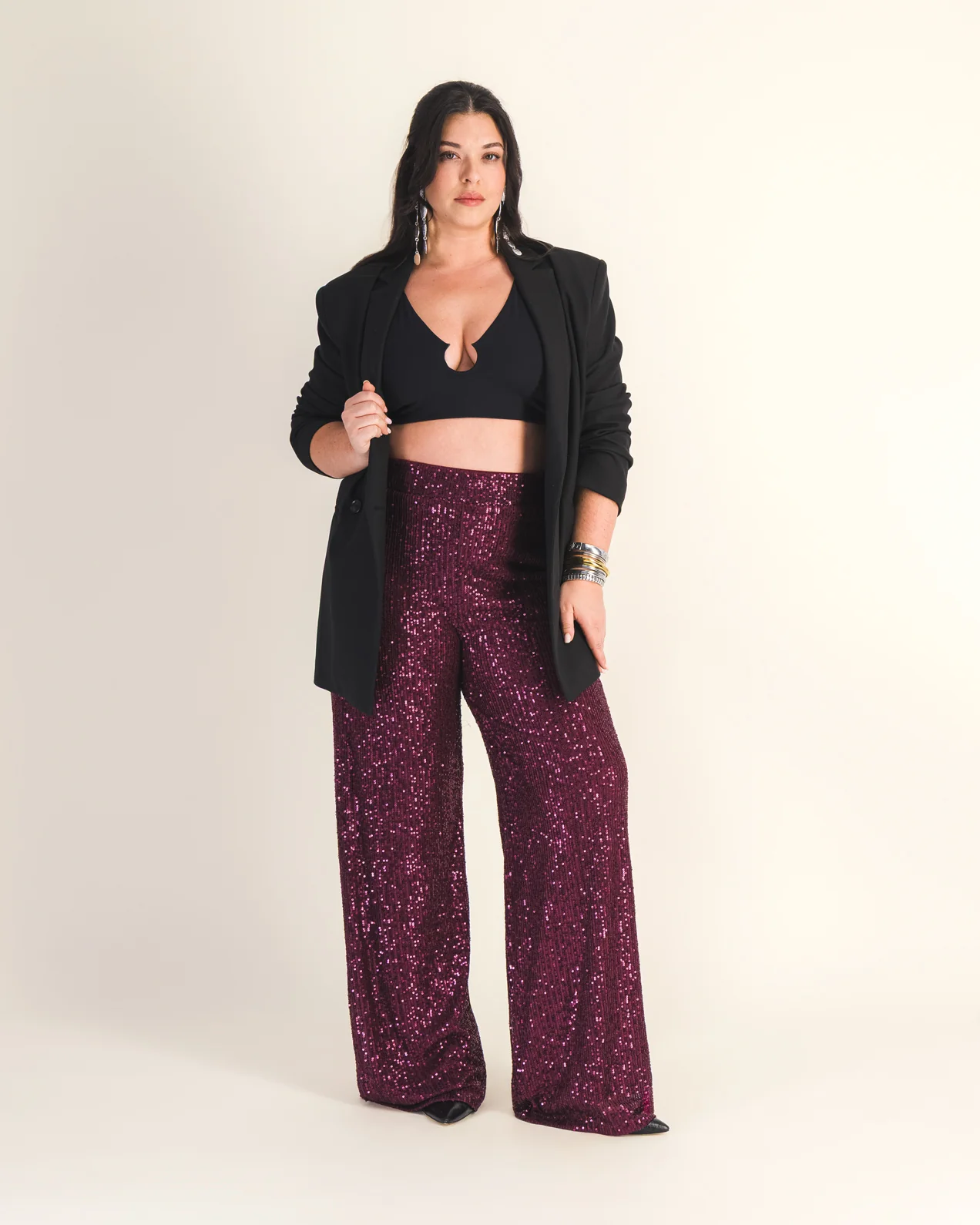 • Pantalon large palazzo• Matière sequins• Taille élastiquée• Entièrement doublé