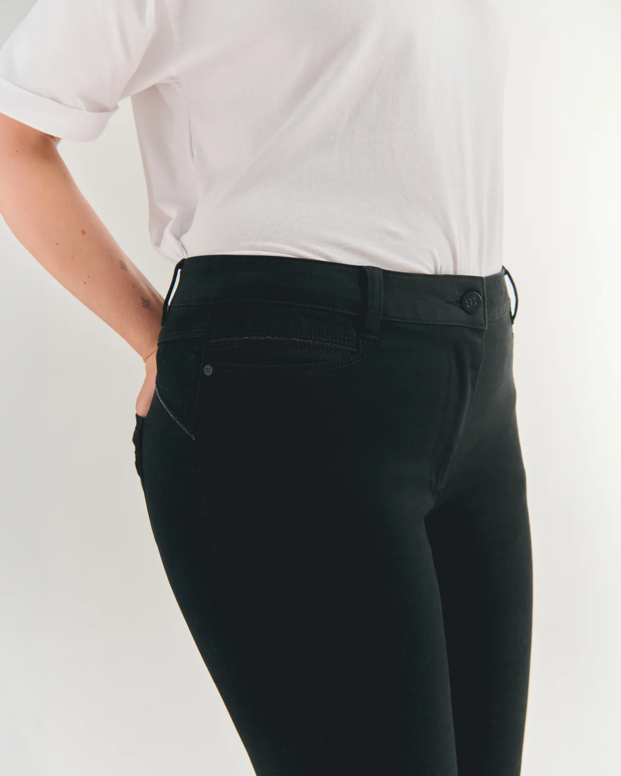 • Fermeture braguette et bouton gravé du logo Almé