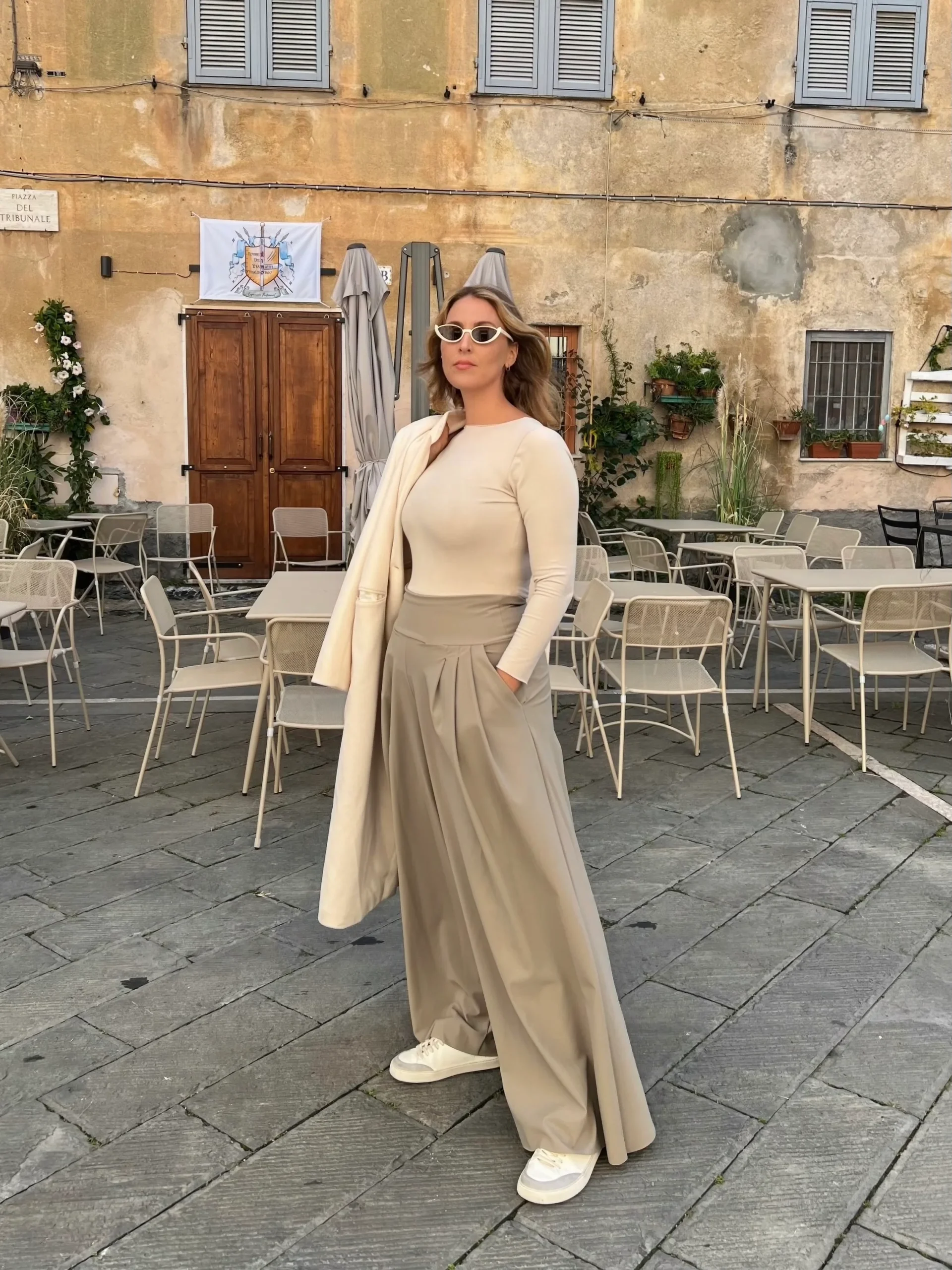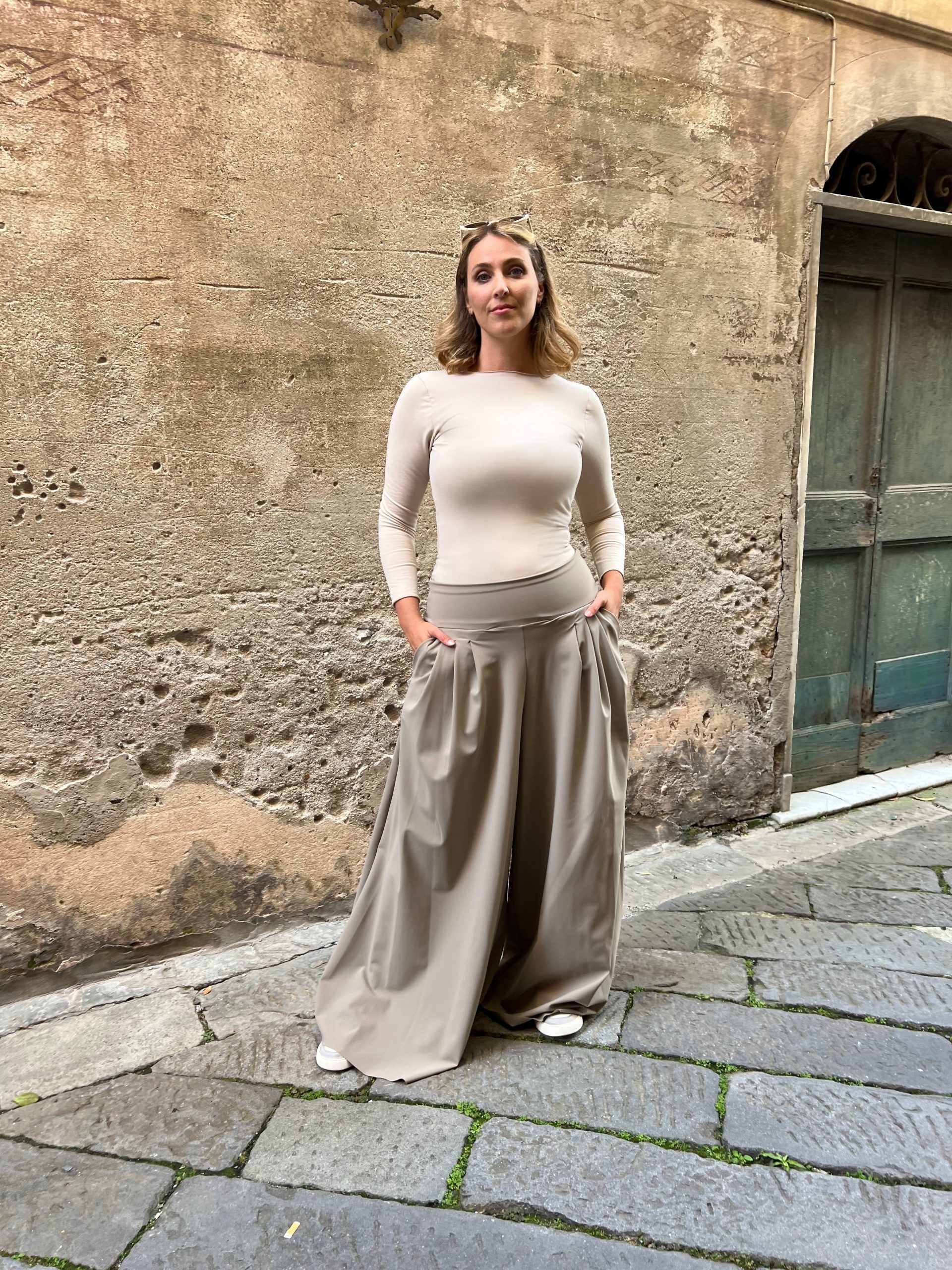 La gamba ampia e svasata crea un meraviglioso effetto gonna pantalone che dona a ogni corpo, senza mai aprirsi. Le baschine morbide e doppiate, prive di parti rigide, seguono le forme con delicatezza e possono essere risvoltate per adattare l’altezza in vita secondo il tuo comfort.
