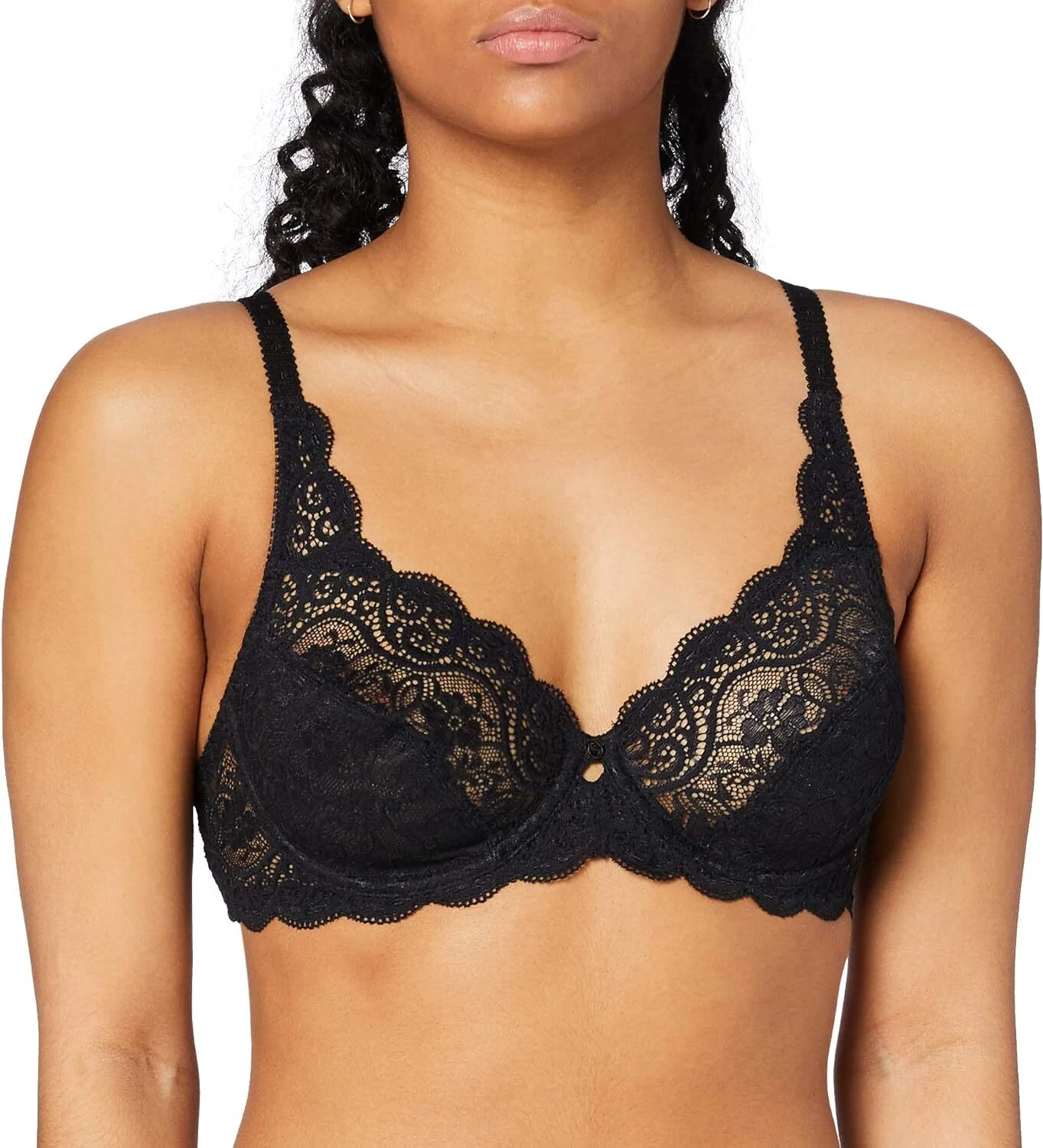 Reggiseno Triumph Amourette 300 W con ferretto della linea Amourette 300, in pizzo semitrasparente seducente. Coppe semitrasparenti che sostengono in pizzo elastico non imbottite, con ferretto leggero ma stabile per un sostegno eccezionale. Fascia sottoseno elastica in morbido pizzo floreale filigranato con decorazione elegante per un sostegno sicuro.