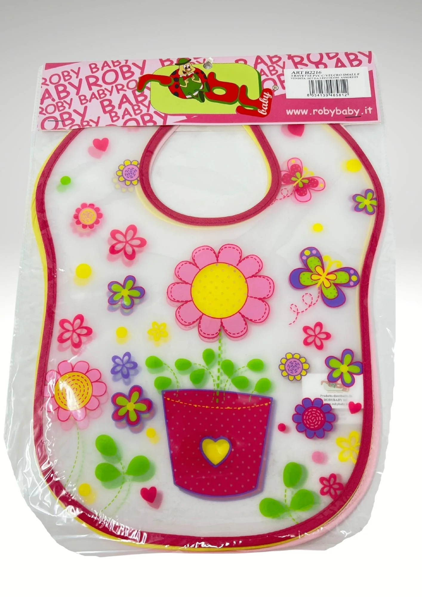 B2216 – Roby Set 3pezzi Bavette In Pvc Con Velcro Stampato Colori Assortiti Femminuccia