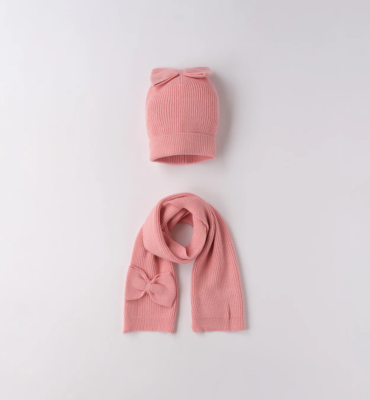 Set in maglia per bambina composto da cappello rosa con fiocco applicato e sciarpa coordinata con lo stesso dettaglio. Morbido e caldo, è l’accessorio perfetto per proteggere la tua bambina dal freddo con un tocco chic e raffinato.