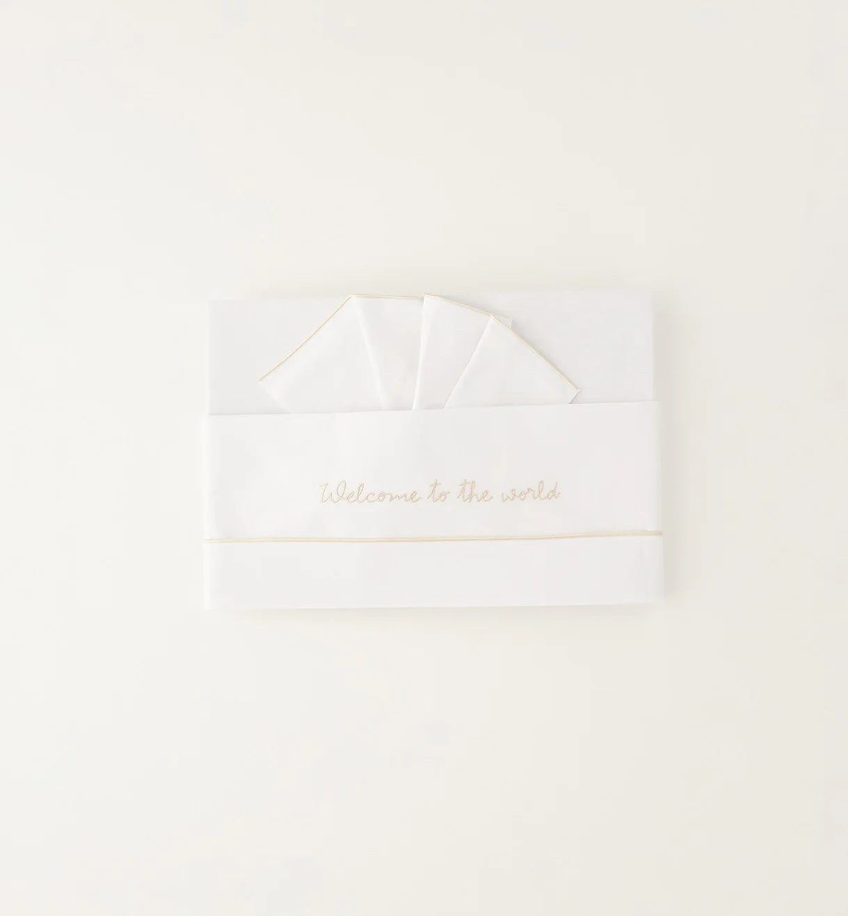 Realizzato in 100% cotone, è morbido, traspirante e ideale per la pelle sensibile fin dai primi giorni. Il design essenziale in bianco, impreziosito dalla scritta ricamata “Welcome to the world” e dal profilo delicato a contrasto, lo rende perfetto sia per neonata che per neonato.