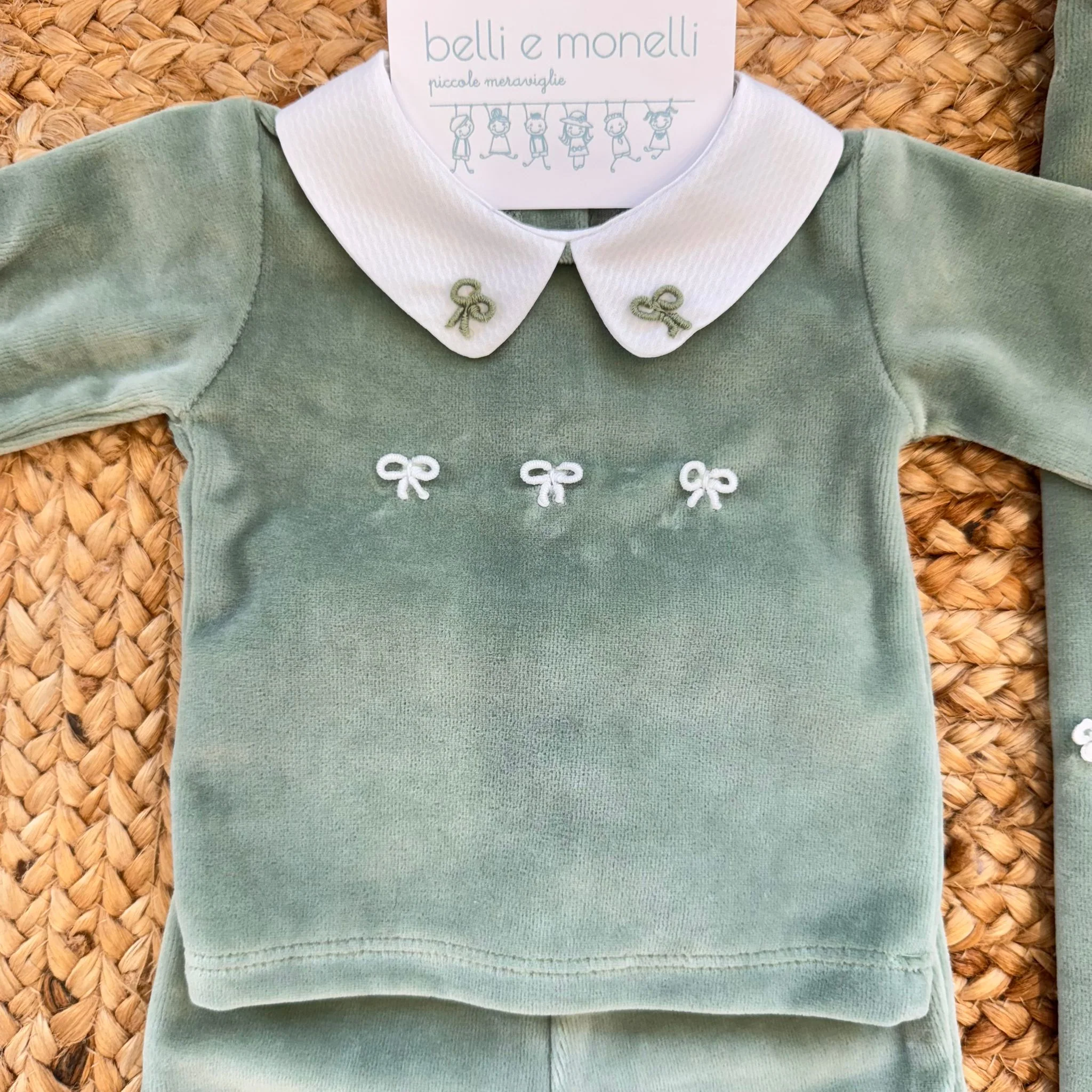 Raffinata uscita clinica in ciniglia verde salvia per neonata, composta da tutina due pezzi, copertina, lenzuolini, cappellino e bavetta coordinati. Il colletto bianco e i delicati fiocchi ricamati impreziosiscono l’insieme, pensato come set nascita esclusivo. Un corredino elegante e confortevole, ideale per accogliere la tua bambina con dolcezza e stile.