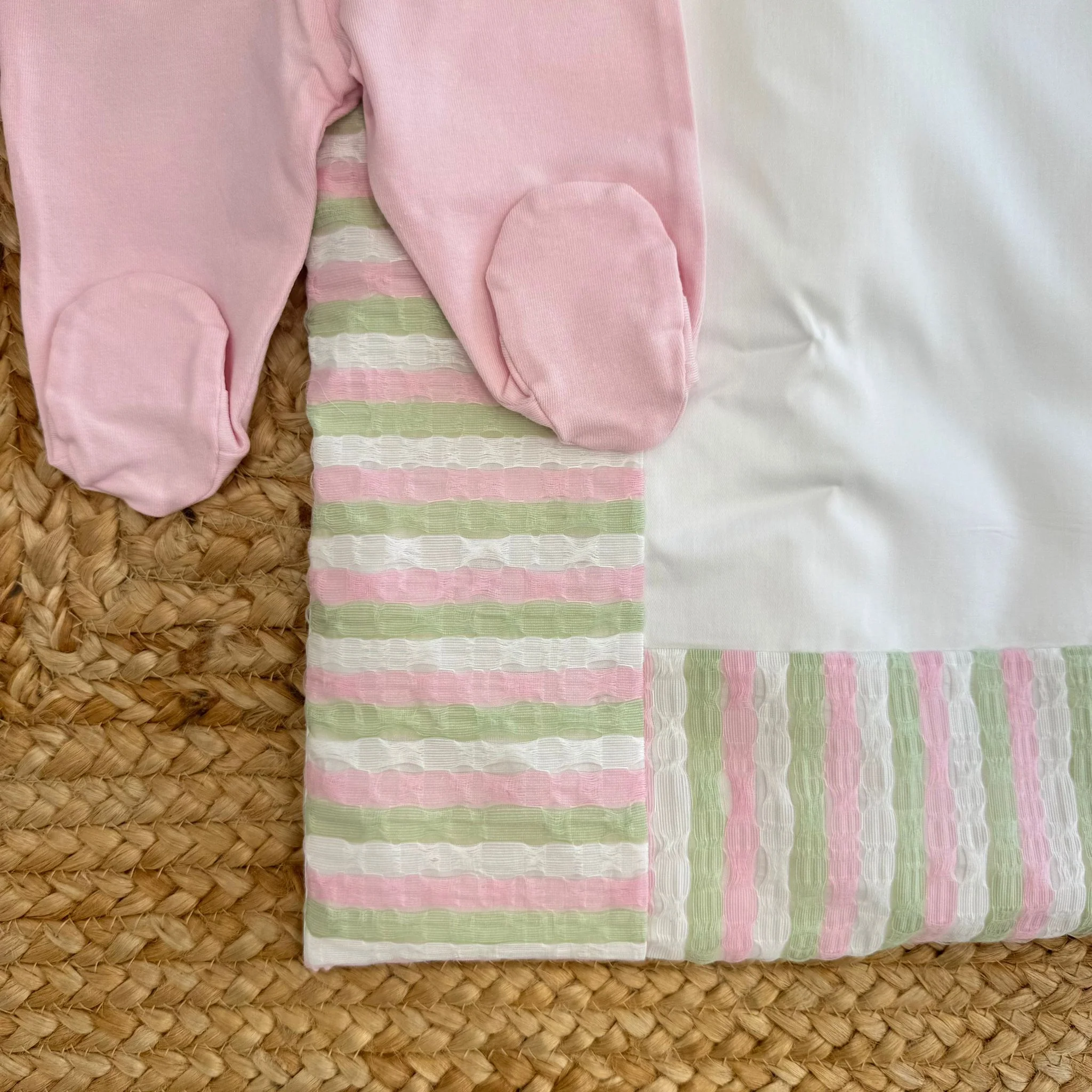 I primi giorni della sua vita meritano dolcezza, armonia e dettagli che parlano d’amore. Questo set nascita neonata è pensato per accompagnarla nell’uscita clinica con eleganza delicata: un coordinato completo, curato nei particolari, perfetto per accogliere la tua bambina con stile e qualità.