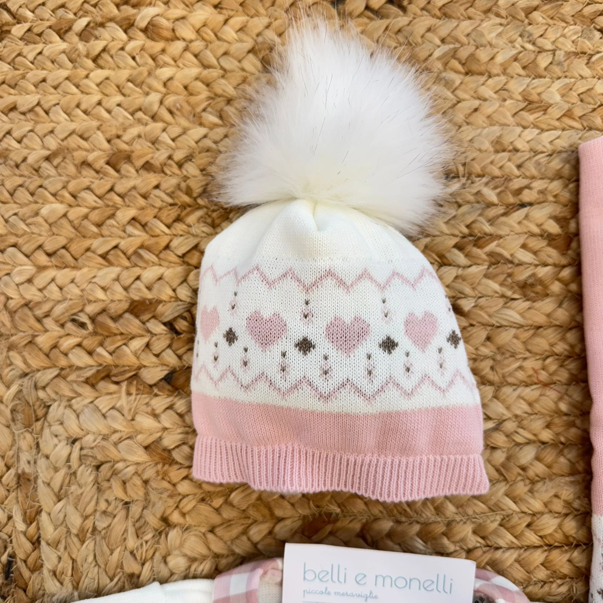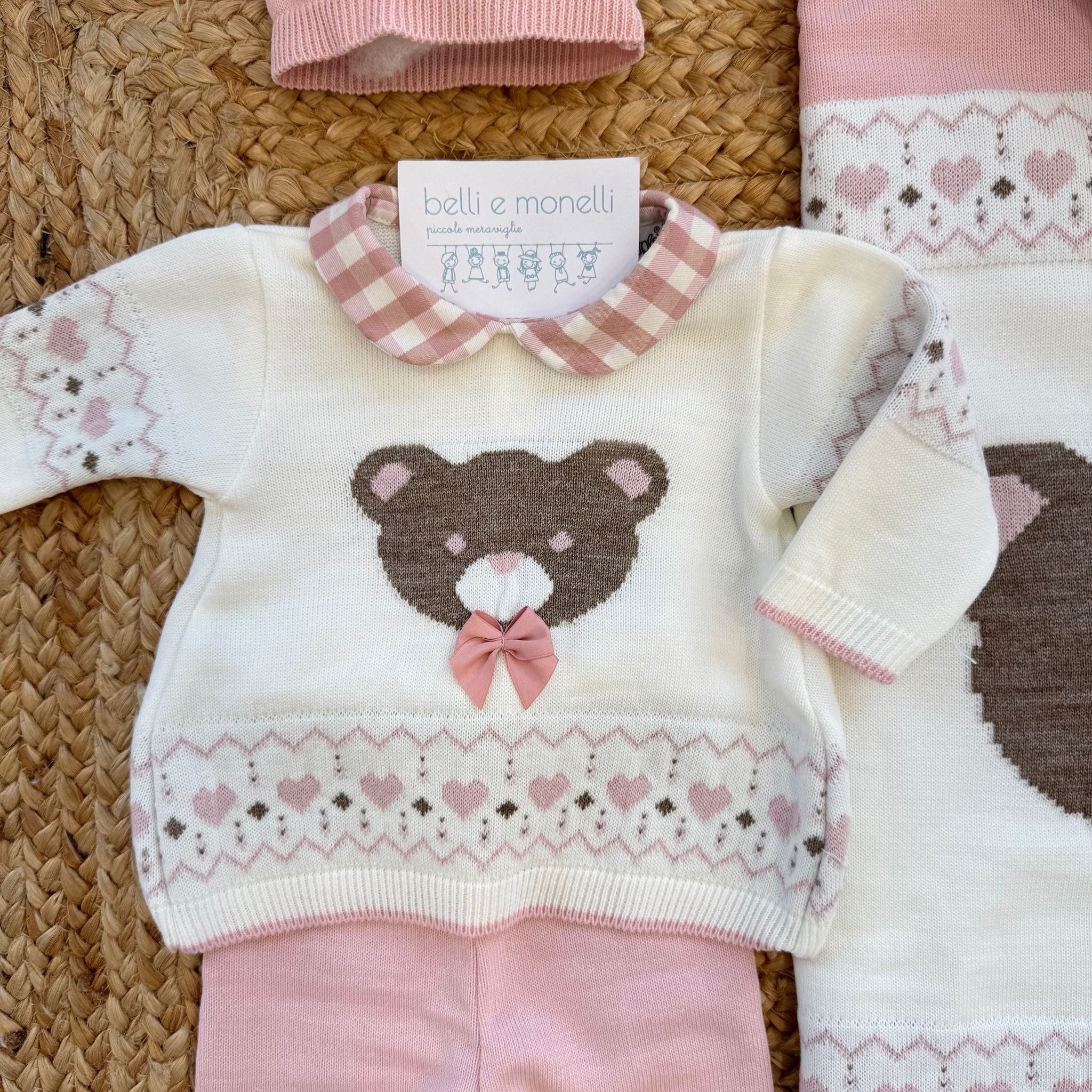 Raffinato coordinato uscita clinica per neonata composto da tutina due pezzi con maglia e pantalone, copertina abbinata, lenzuola ricamate, cappellino con pompon, bavetta e scarpine. Il dolce orsetto centrale con fiocco rosa e i motivi a cuori rendono questo set nascita unico e prezioso, perfetto come primo corredino elegante. 50% lana 50% acrilico