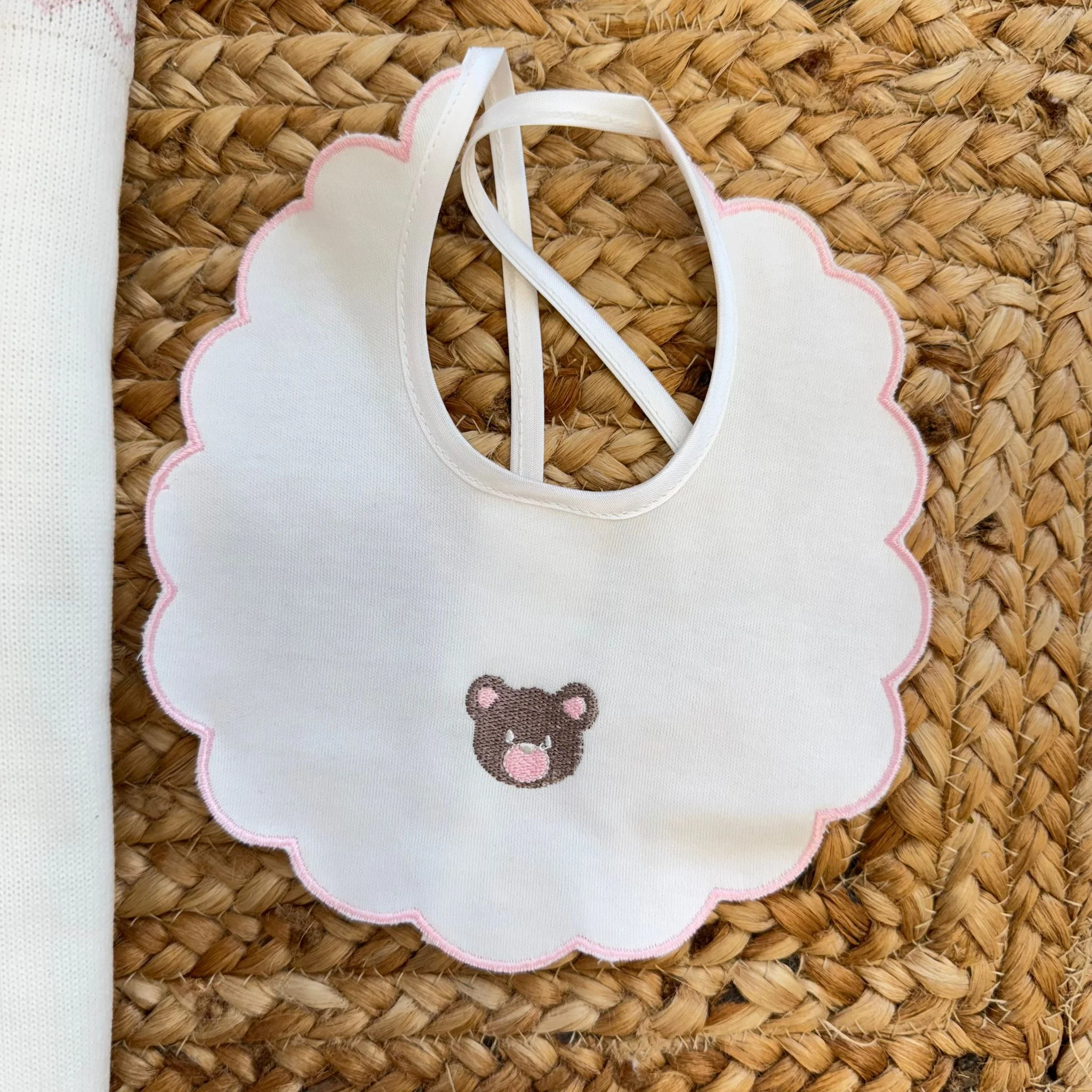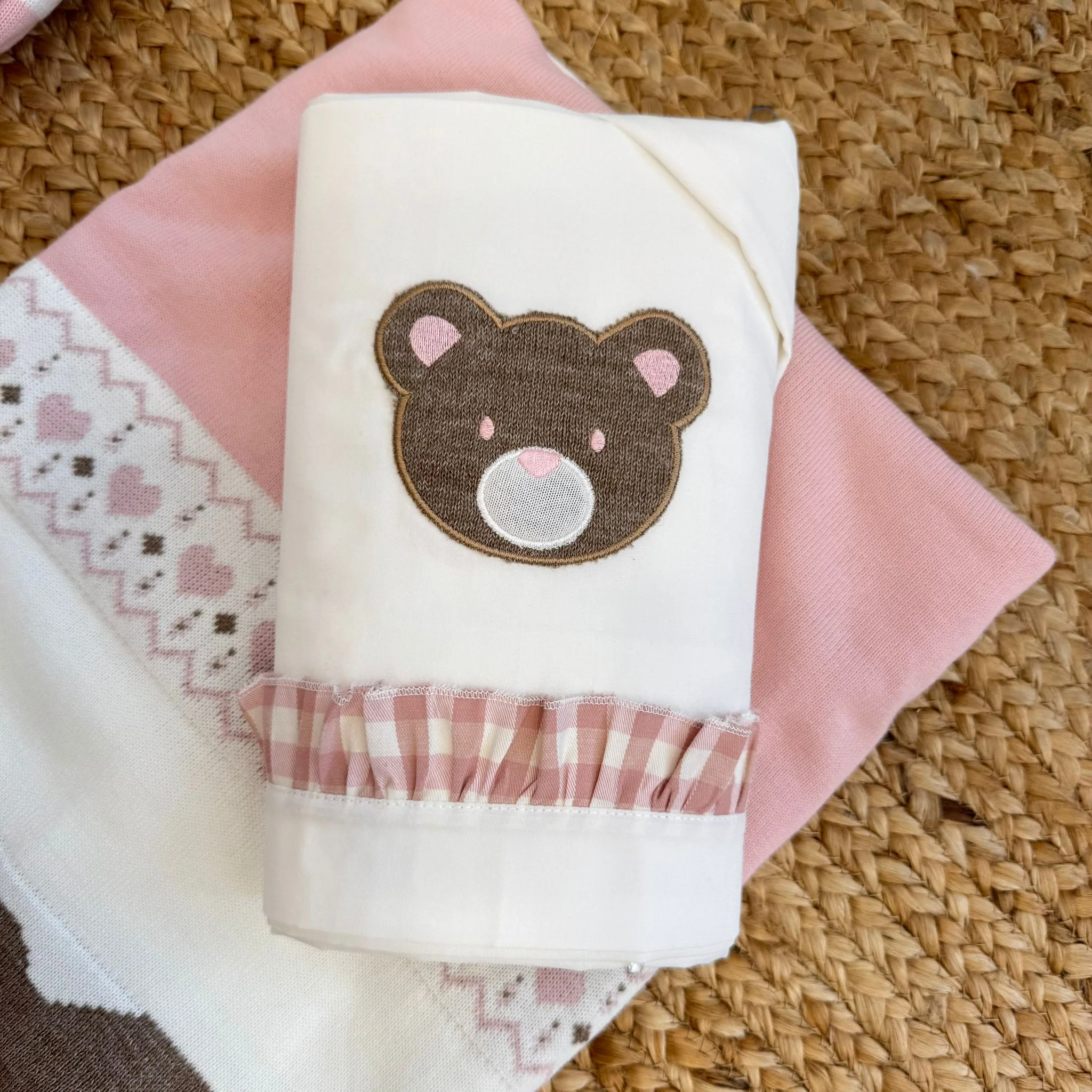 Raffinato coordinato uscita clinica per neonata composto da tutina due pezzi con maglia e pantalone, copertina abbinata, lenzuola ricamate, cappellino con pompon, bavetta e scarpine. Il dolce orsetto centrale con fiocco rosa e i motivi a cuori rendono questo set nascita unico e prezioso, perfetto come primo corredino elegante.