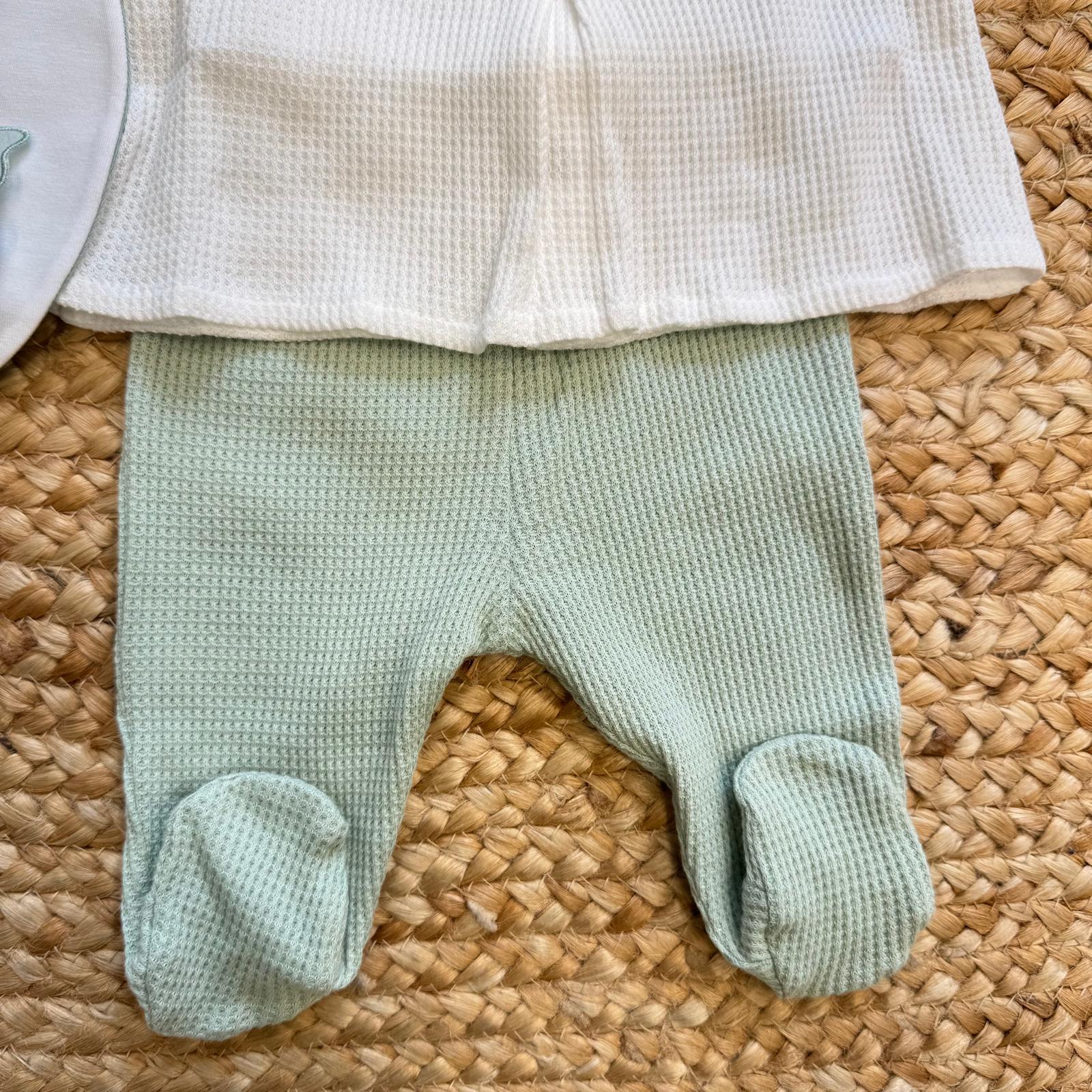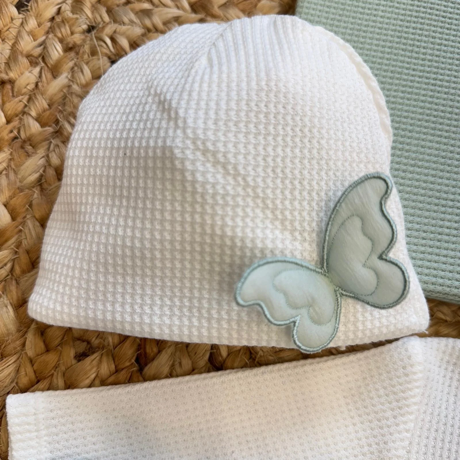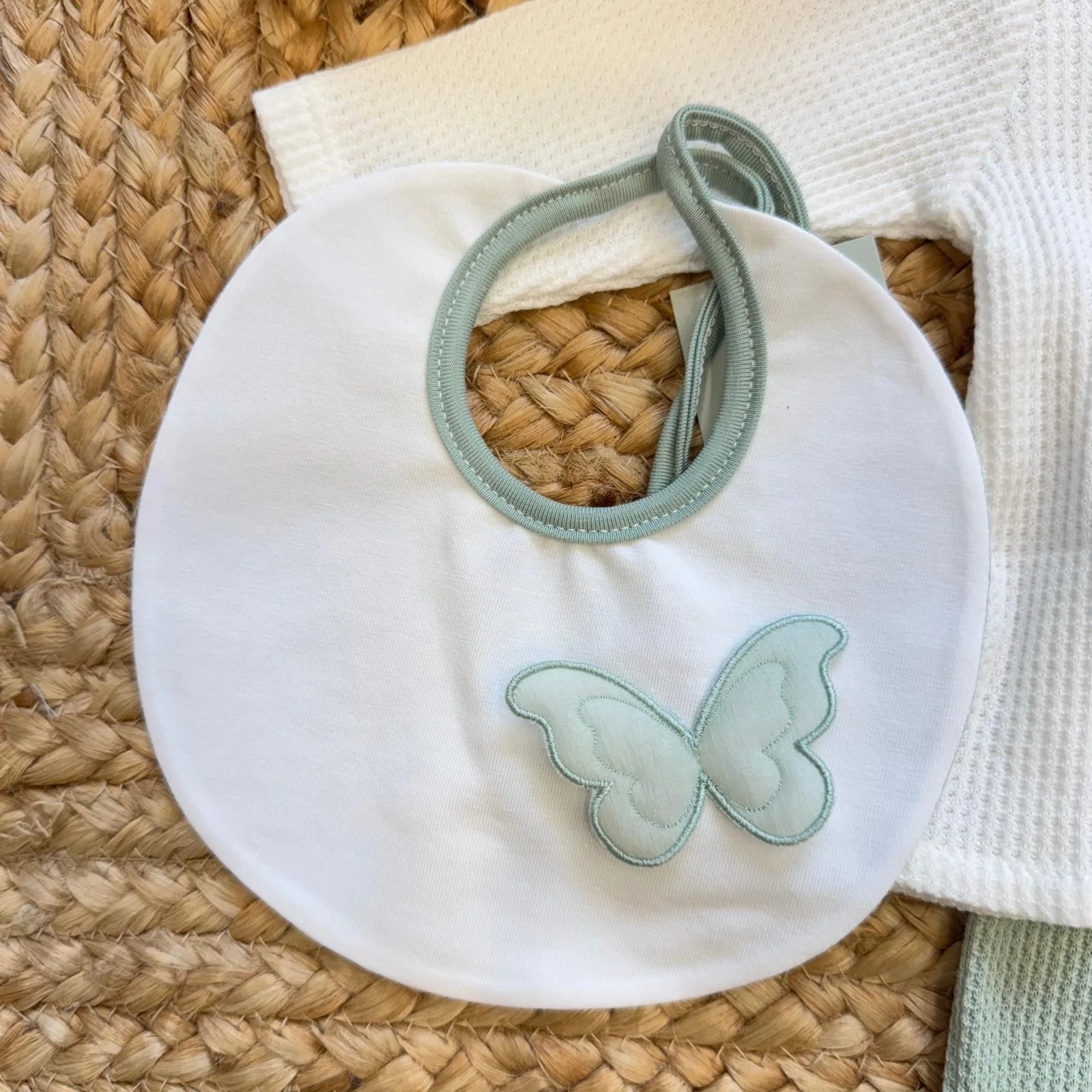 Un corredino nascita raffinato e moderno, pensato per accogliere la tua bambina con eleganza e armonia nel suo primo giorno speciale. Il bianco puro si unisce al verde salvia in una combinazione delicata e sofisticata, impreziosita dalla farfalla applicata che dona un tocco romantico e distintivo.