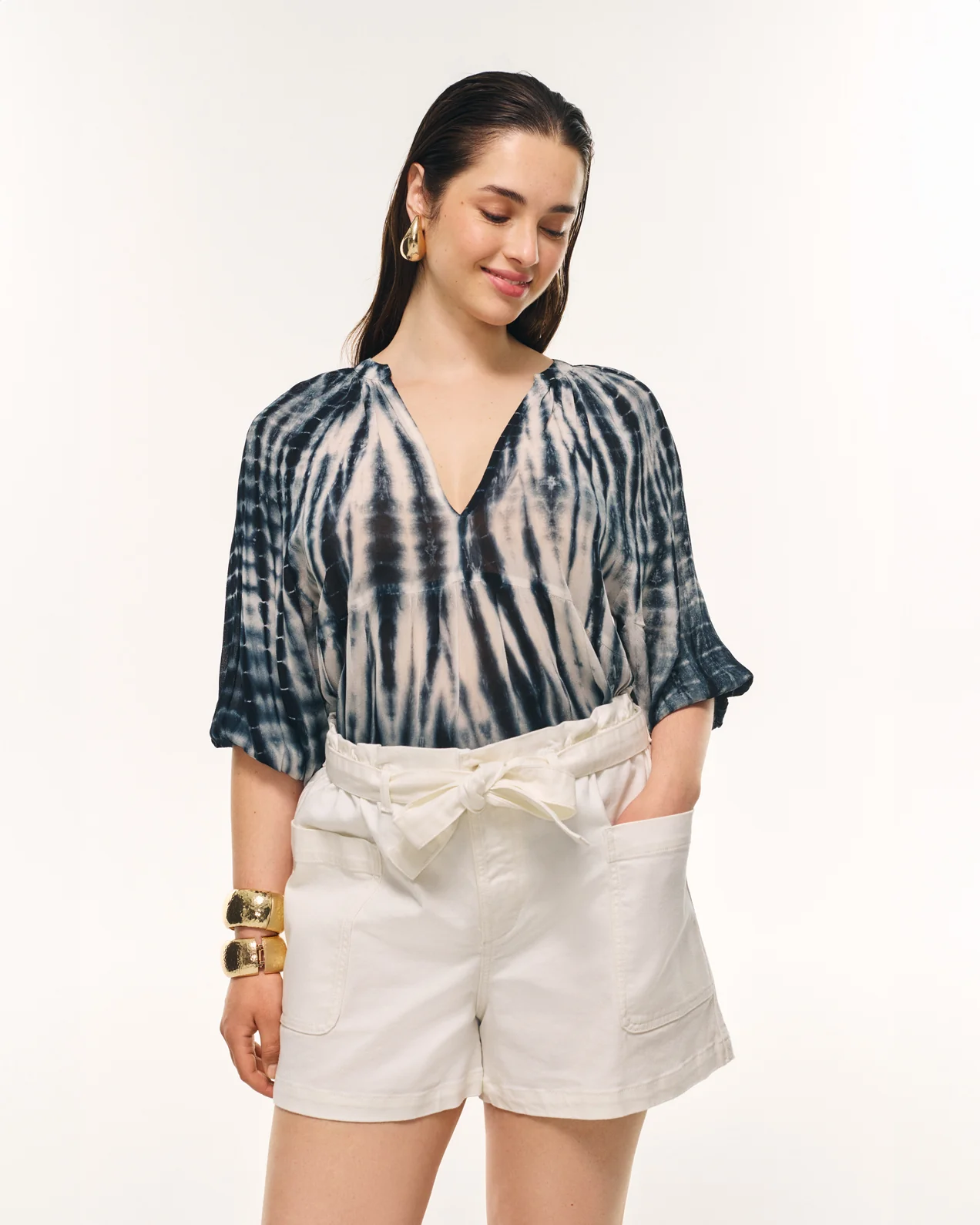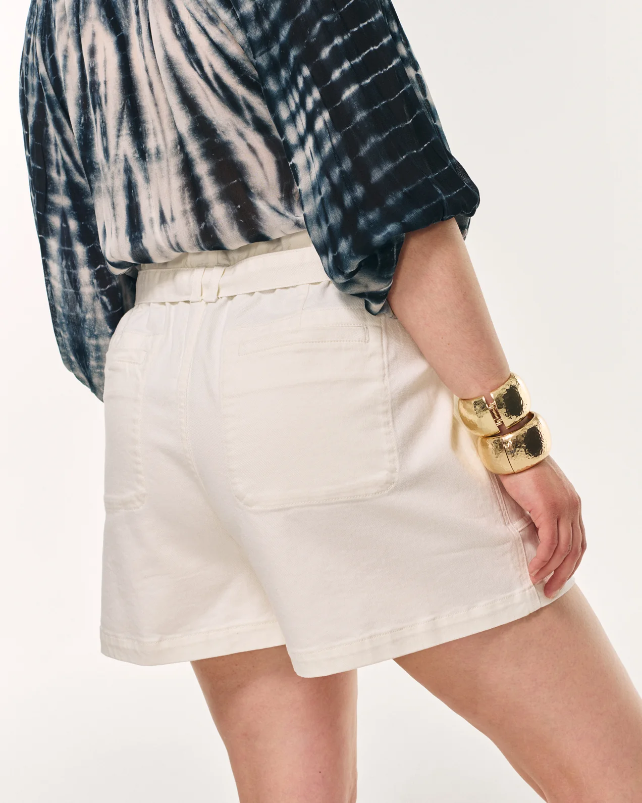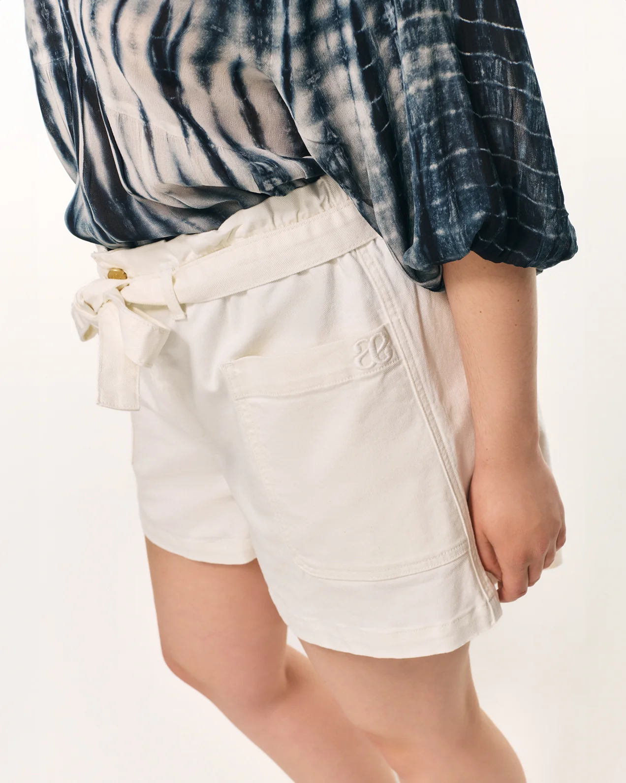 • Short en jean taille haute• Taille élastiquée• Poches plaquées devant• Poches passepoilées dos• Fermeture par une braguette et un bouton• Passants ceinture à la taille• Ceinture en denim à nouer amovible