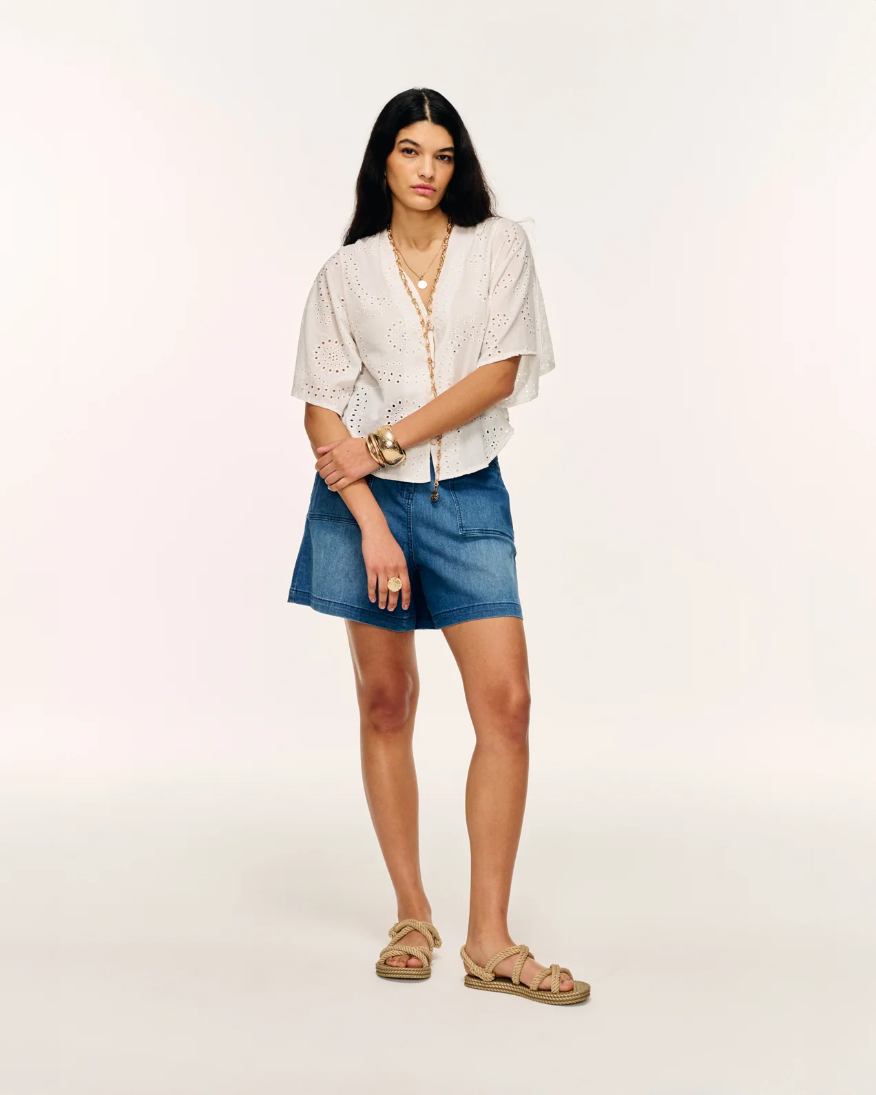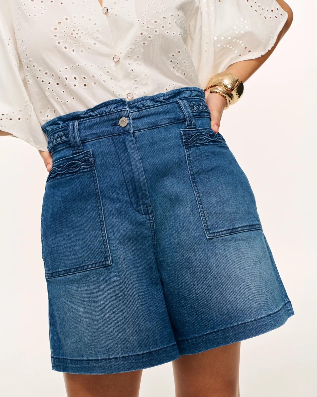 • Short en jean• Coupe paperbag• Ceinture tressée• Passants de ceinture• Poches côtés avec détail tressé• Poches passepoilées au dos