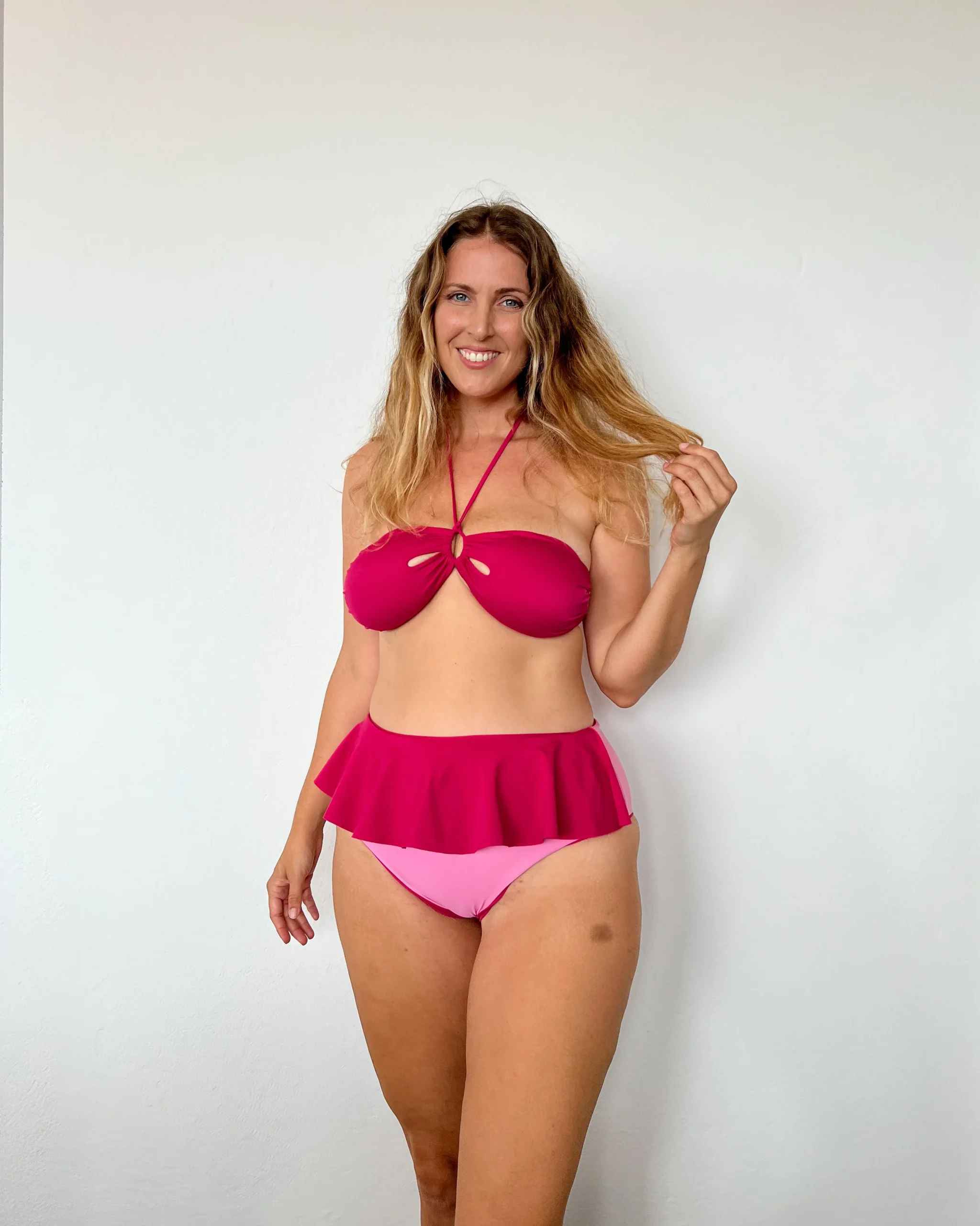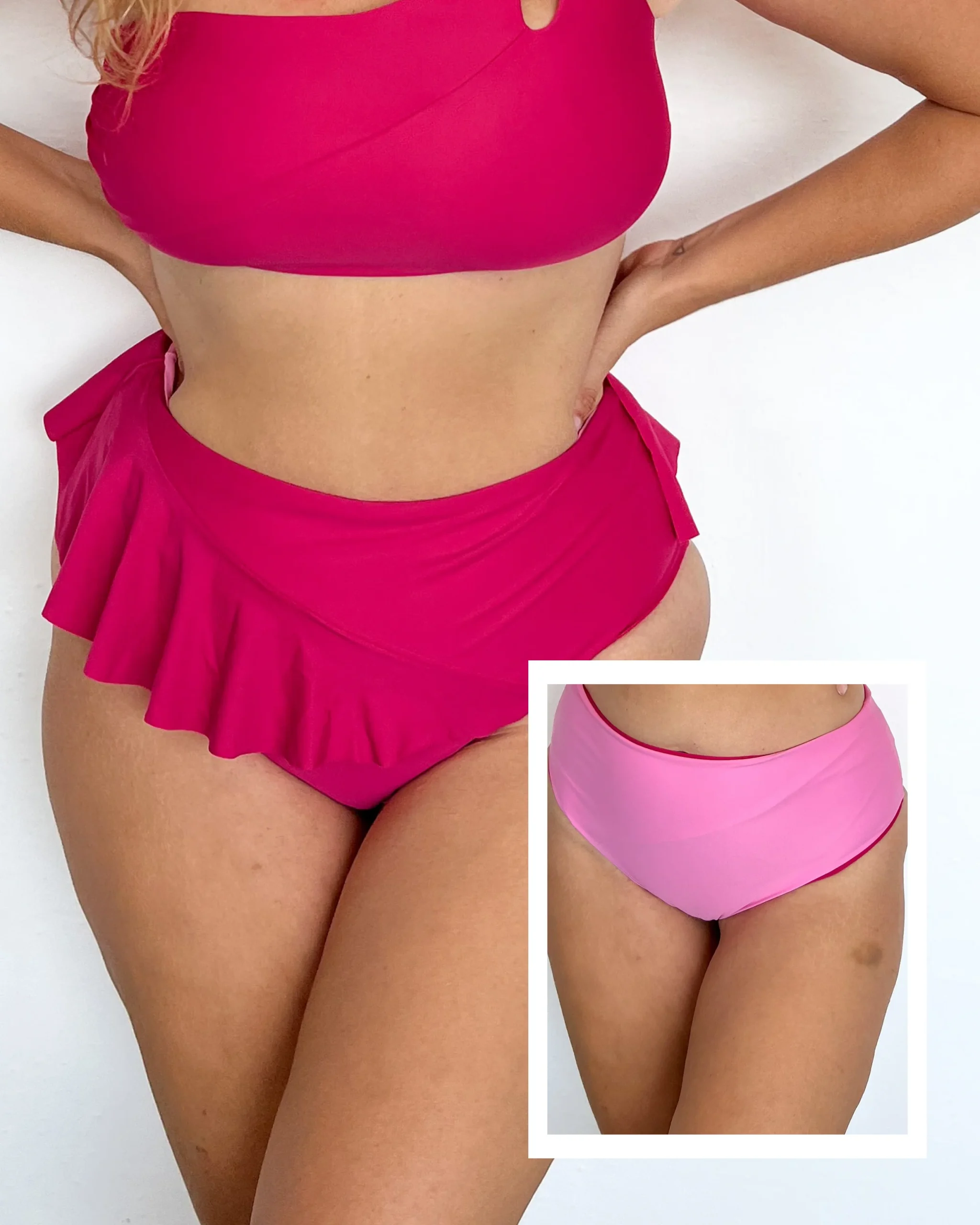 4 in 1 – Giocosa e divertente, impreziosita da un voulant che crea movimento e tridimensionalità, questo capo icona dell’estate si può utilizzare in ben quattro modi: reversibile in 2 colori e con voulant dalla parte del ventre o della schiena.