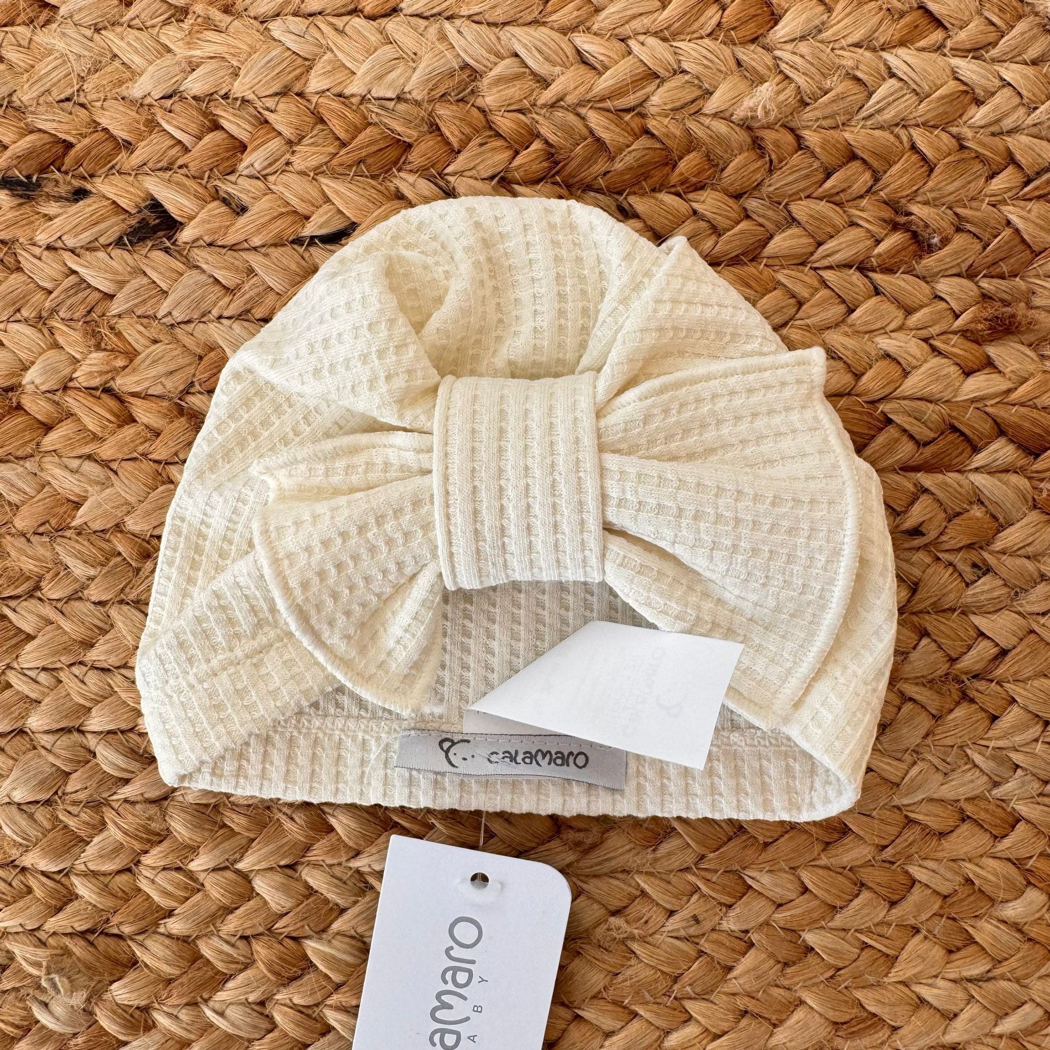 Un accessorio irresistibile per completare il look della tua piccola! Questo turbante per neonata color panna è realizzato in cotone elasticizzato con lavorazione nido d’ape, che lo rende traspirante e super confortevole anche nelle stagioni più calde.Il grande fiocco centrale applicato aggiunge un tocco di dolcezza e stile, perfetto per servizi fotografici, cerimonie o semplicemente per aggiungere charme al quotidiano. Facile da indossare e da abbinare, è l’accessorio must-have per ogni baby girl.