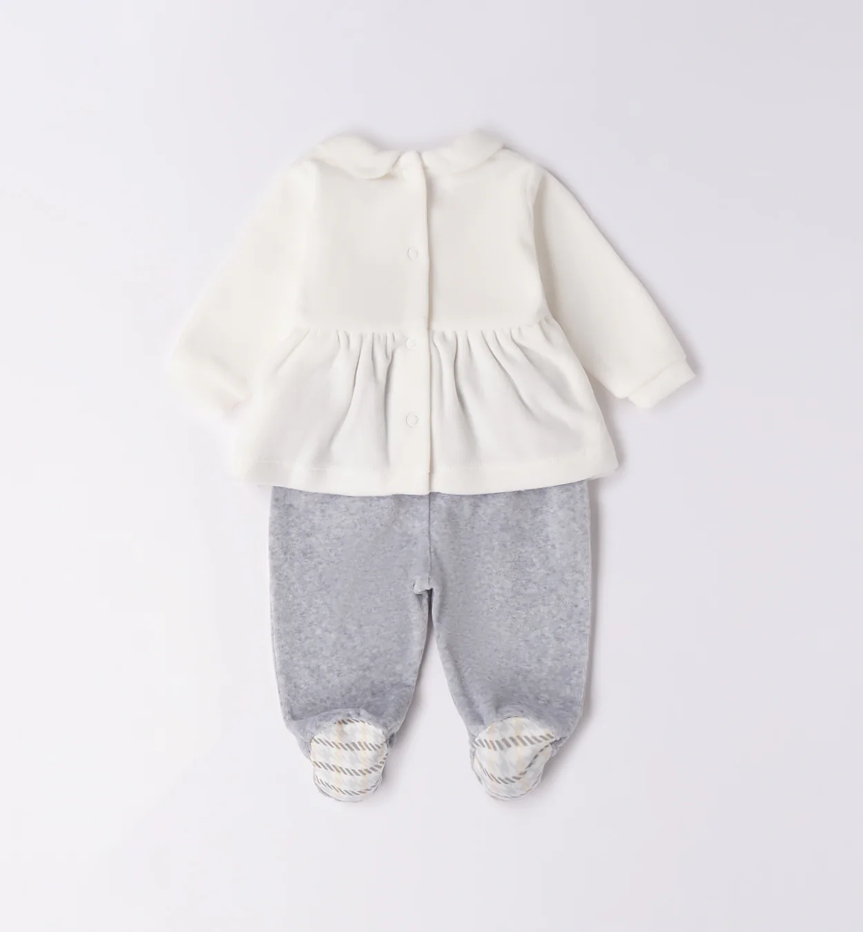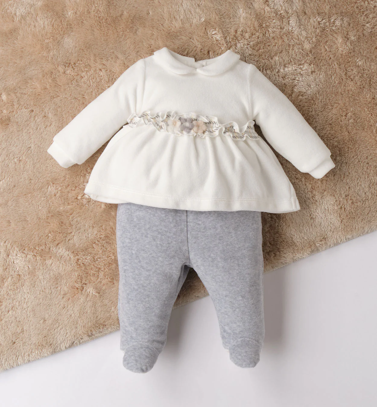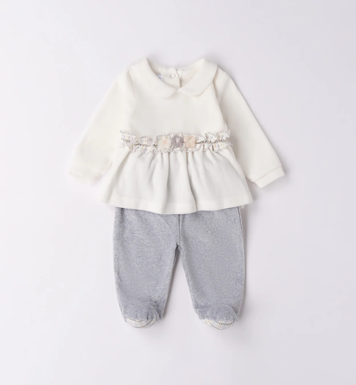 Tutina due pezzi per neonata in morbida ciniglia: maglia panna con colletto tondo e delicata fascia floreale applicata in toni neutri, abbinata a pantalone grigio con piedini. Un completo elegante e pratico, ideale come corredino, set nascita o uscita clinica. Comfort e raffinatezza per le prime coccole. Che ci crediate o no, i vostri bambini cambieranno il mondo.