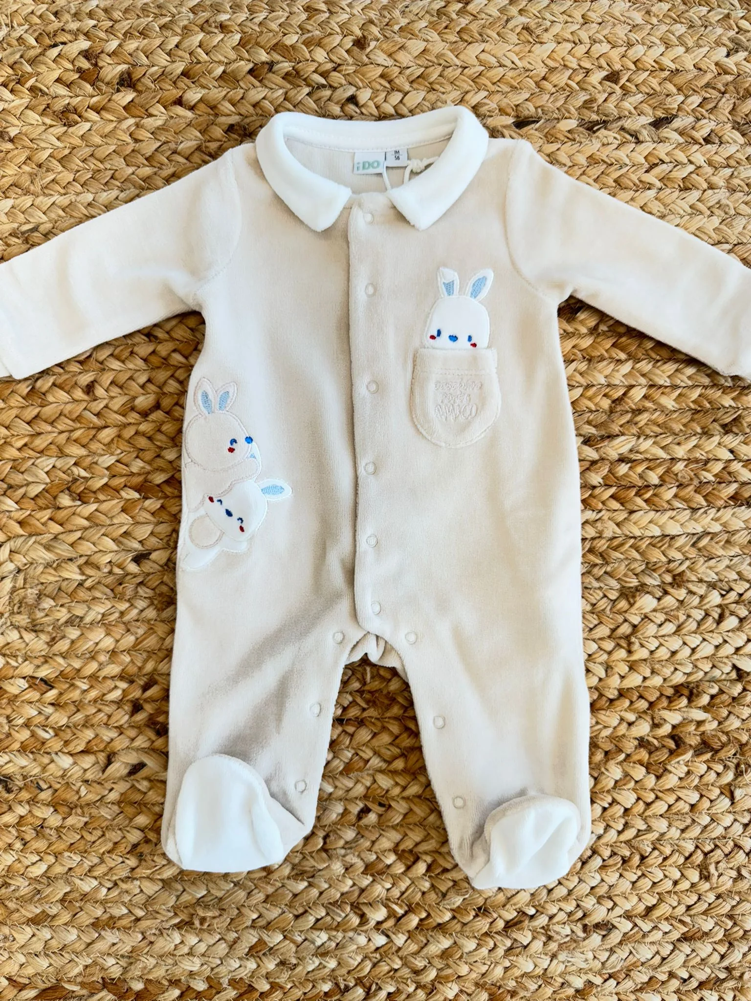Tutina in ciniglia calda con teneri coniglietti ricamati e colletto in velluto, ideale per il primo cambio ospedale. Un completino morbido e coccoloso, perfetto per il corredino nascita invernale del tuo bimbo.