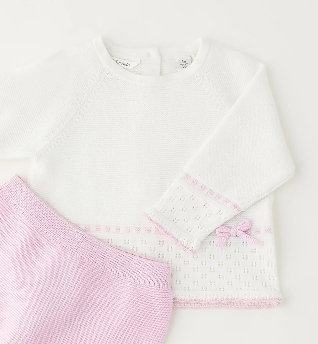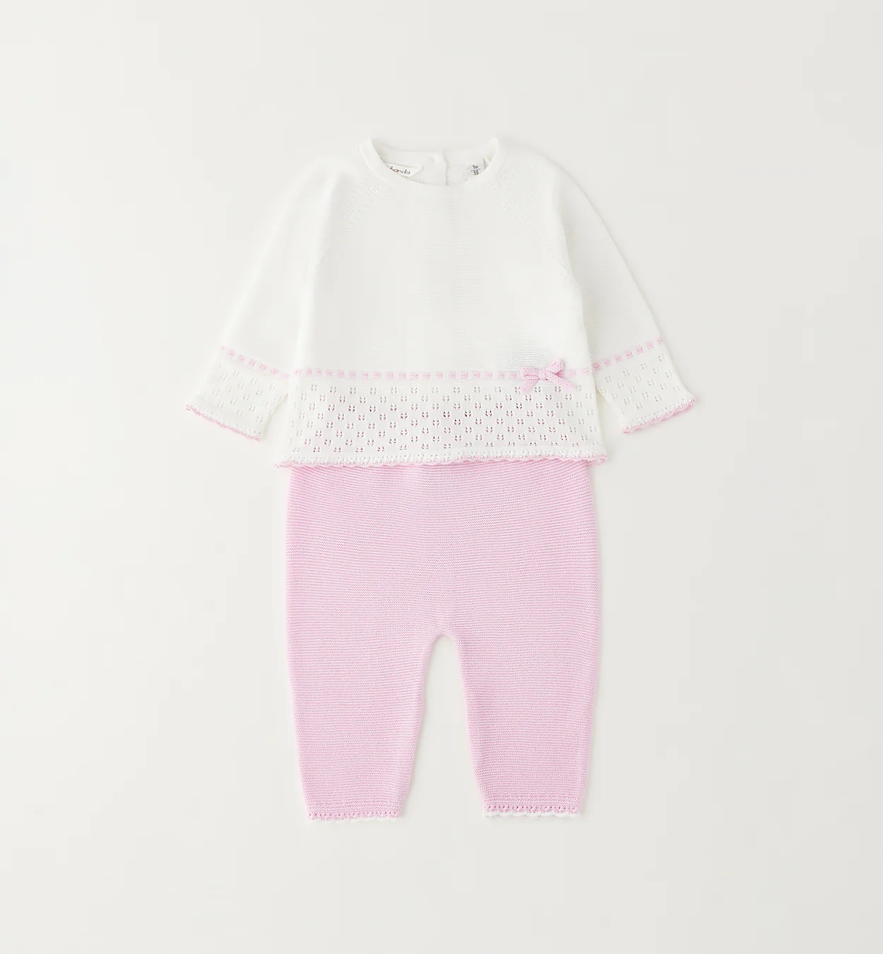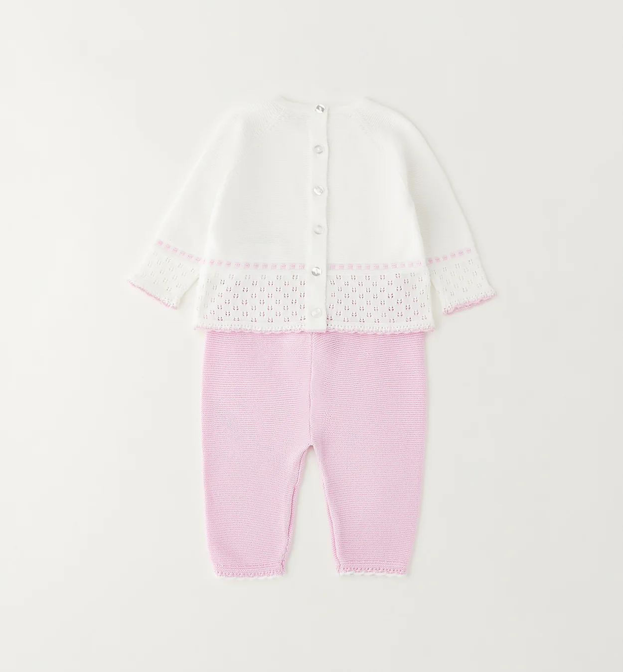 Realizzata in 100% cotone, presenta maglia bianca con lavorazione traforata e piccoli dettagli rosa coordinati. Fiocchetto applicato sul lato e pantalone rosa con finitura lavorata sul fondo.