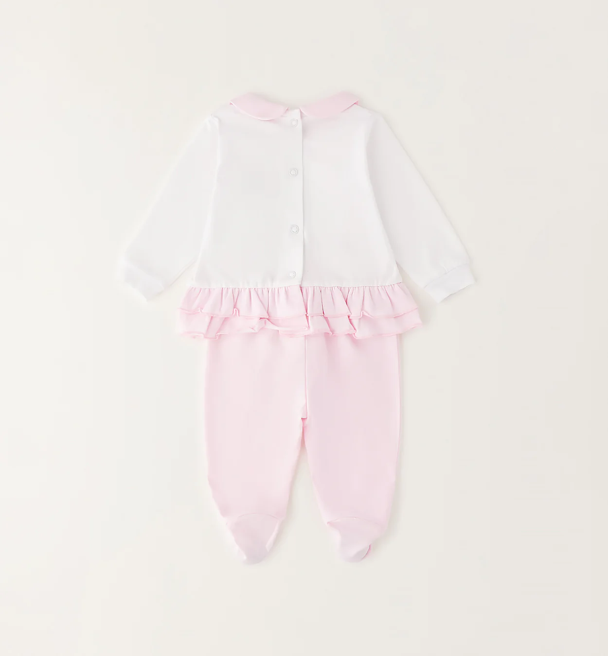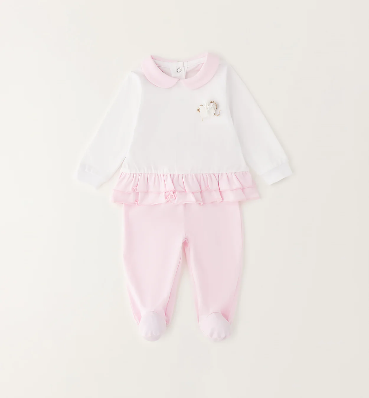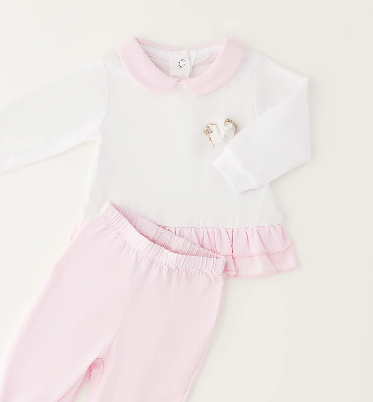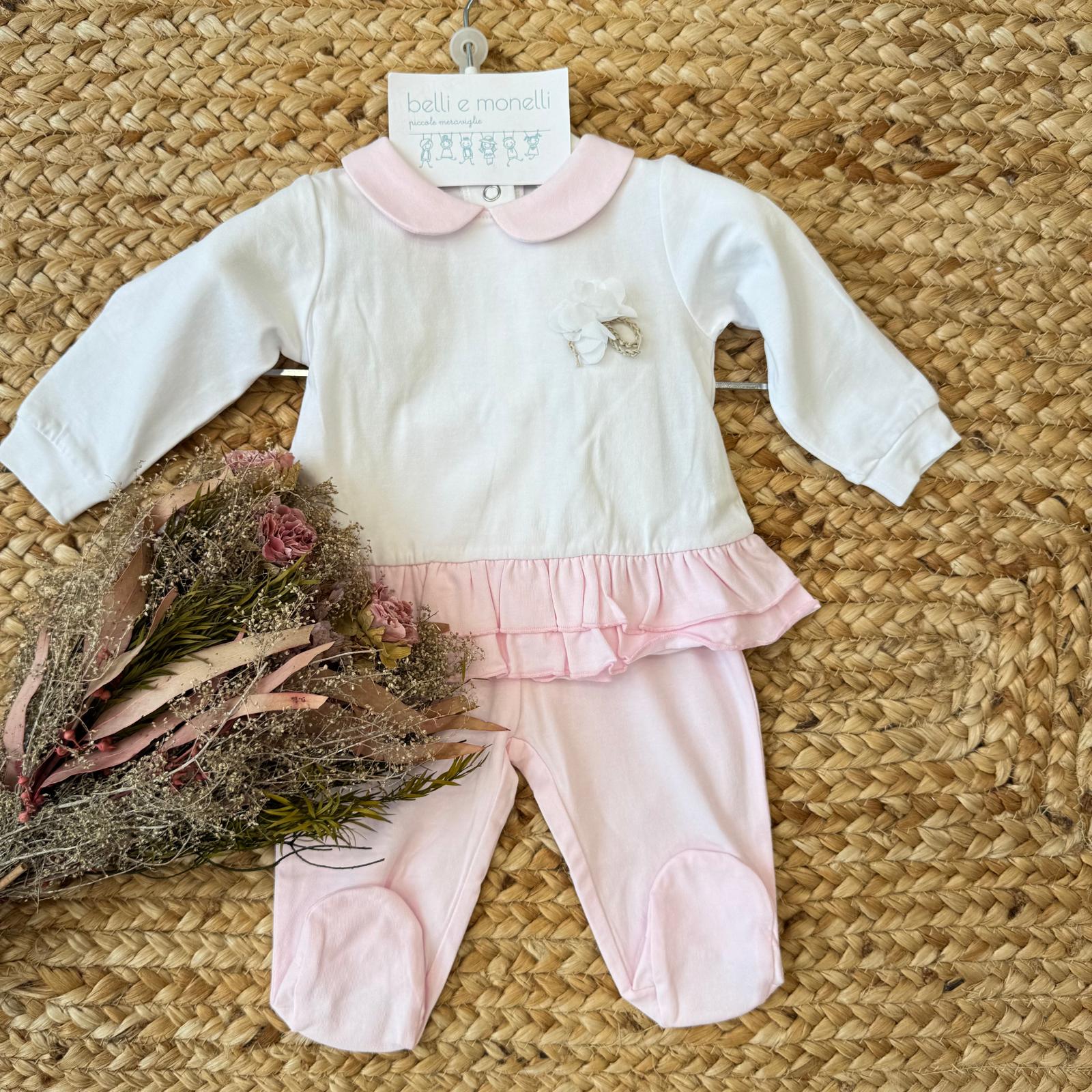 Tutina neonata in 100% cotone con maglia bianca, colletto rosa e delicato fiore applicato sul petto. Balza rosa a doppio volant e pantalone coordinato con piedini. Morbida, confortevole e perfetta per un look elegante nei primi mesi. Un capo pensato per chi desidera qualità e dettagli curati.