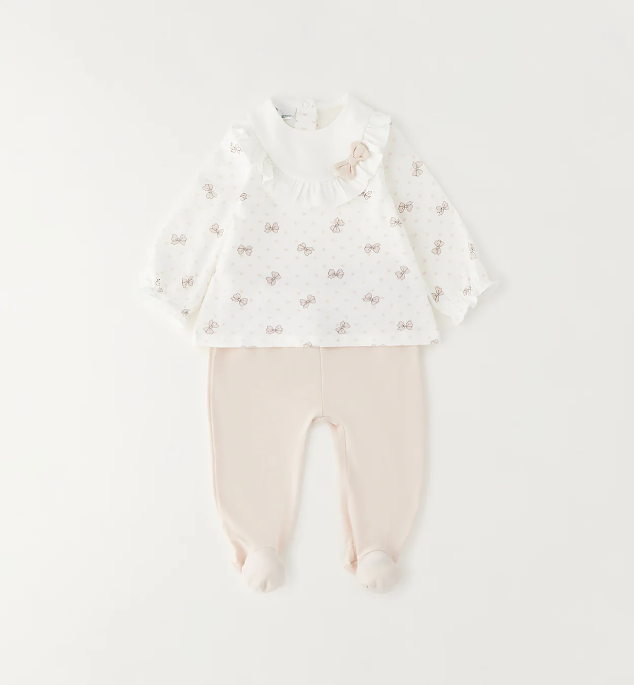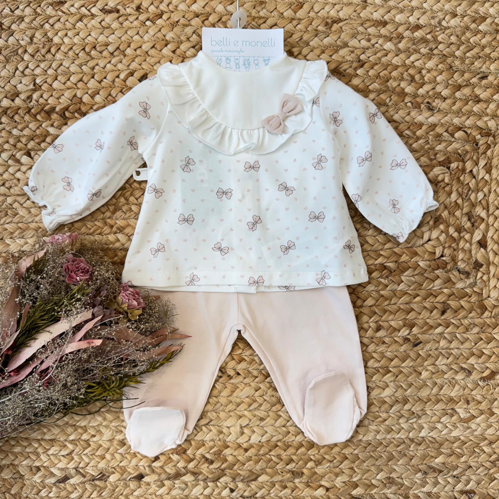 Realizzata in puro cotone, è composta da maglia con stampa fiocchetti e micro cuoricini tono su tono e ghettina coordinata color rosa cipria. Il colletto ampio con balza arricciata e fiocco applicato dona un tocco romantico ed elegante, perfetto per i primi incontri, le visite in famiglia o le foto ricordo.