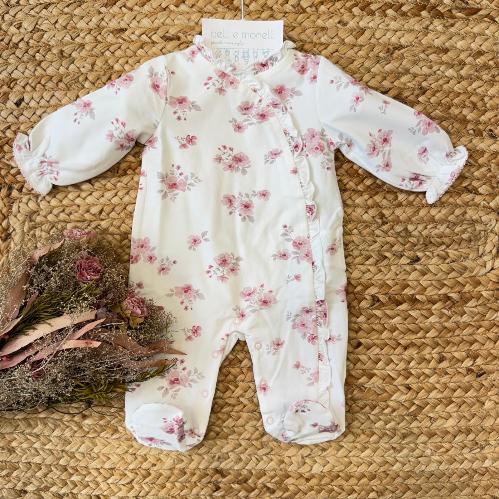 Il modello presenta chiusura incrociata frontale con profilo arricciato in ruches che accompagna tutta la linea fino ai piedini, creando movimento e armonia. Le maniche lunghe con polsino arricciato riprendono lo stesso dettaglio, per un insieme elegante e coerente. I piedini integrati assicurano comfort e praticità nei primi giorni.