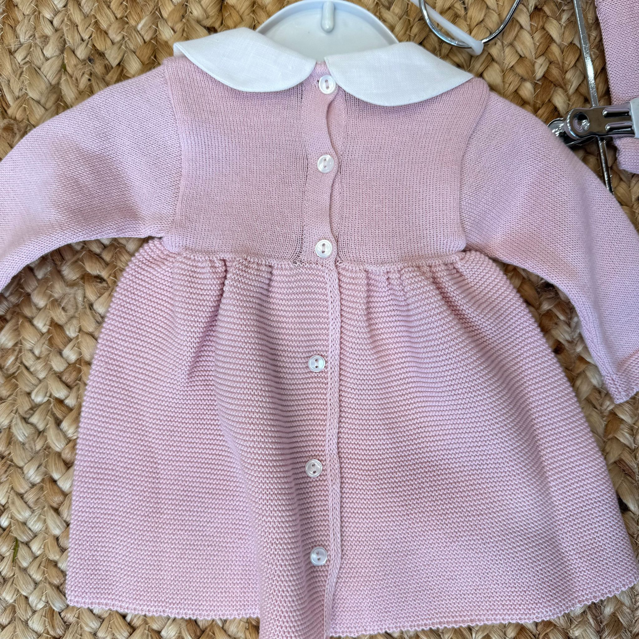 Una tutina per neonata in 100% filo di cotone, pensata per chi ama l’eleganza sobria fin dai primi giorni. Il completo due pezzi è composto da maglia rosa con colletto bianco e fiocco centrale in tessuto, abbinata a pantalone coordinato. Linee pulite, lavorazione a maglia e dettagli curati rendono questo capo ideale per un set nascita raffinato o un’uscita clinica delicata.