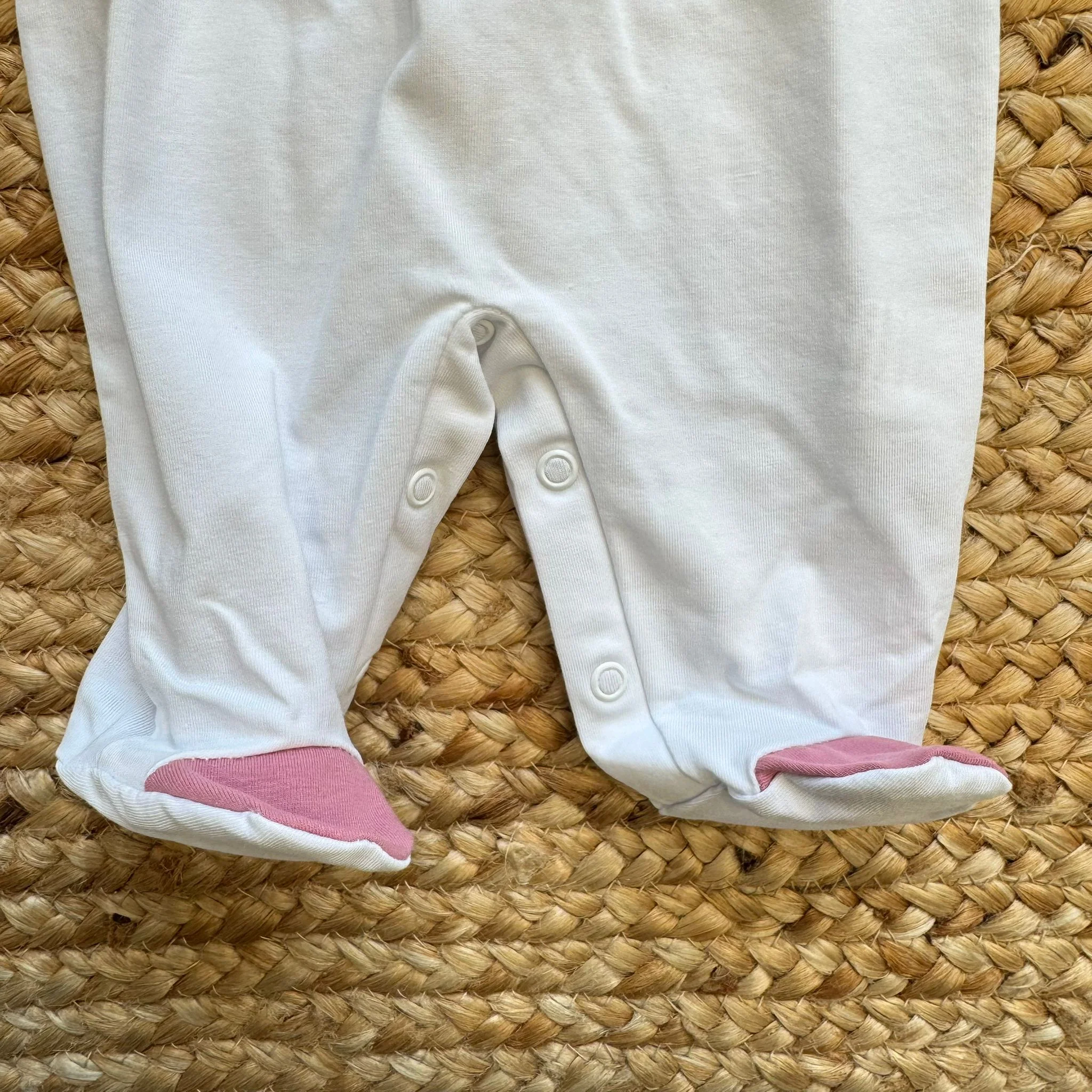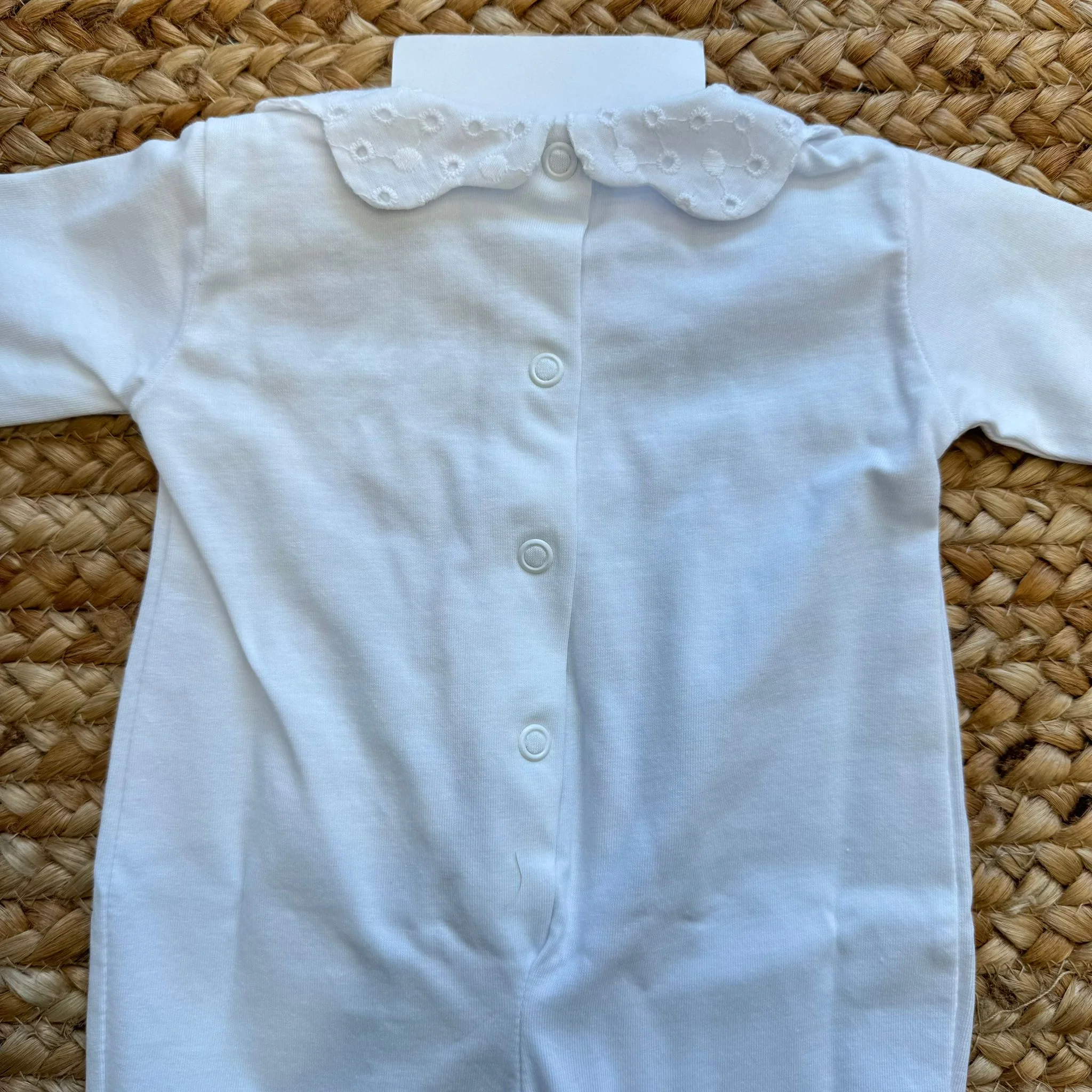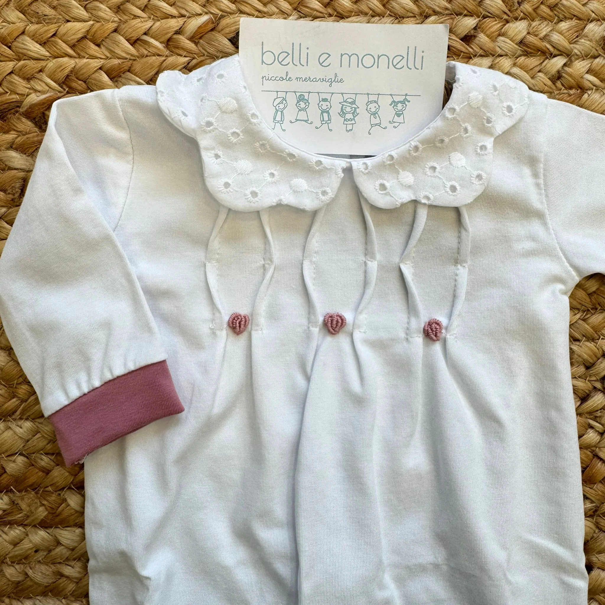 Una tutina luminosa e raffinata, pensata per le prime settimane di vita, dove ogni dettaglio racconta dolcezza e cura.