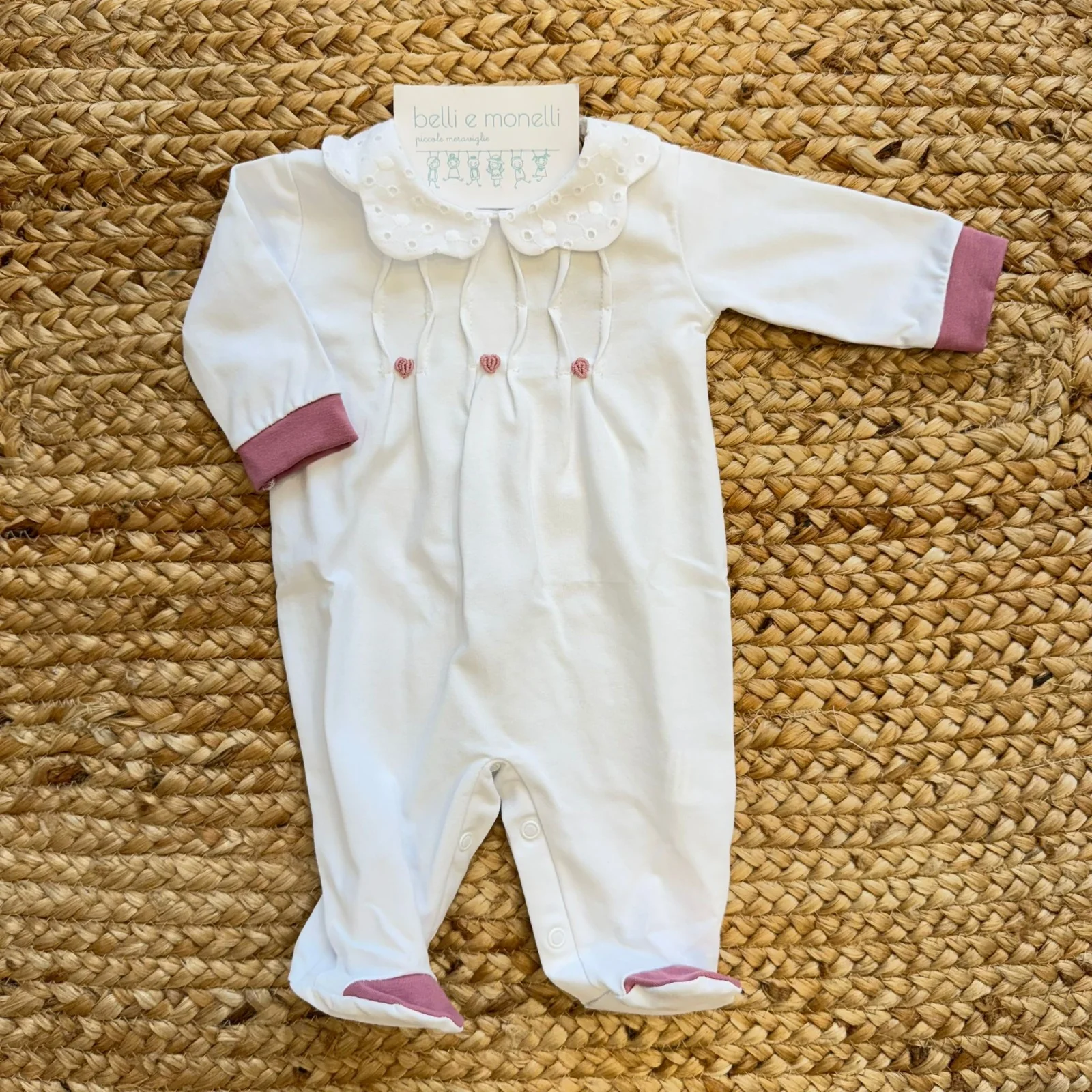 Tutina neonata in cotone panna con colletto in sangallo ricamato e tre piccoli cuori rosa applicati sul davanti. Delicati inserti verticali valorizzano la parte superiore, mentre polsini e piedini sono rifiniti in rosa antico. Chiusura posteriore e al cavallo con bottoni a pressione. Perfetta per uscita clinica e set nascita elegante. Tessuto: 90% cotone, 10% elastomero