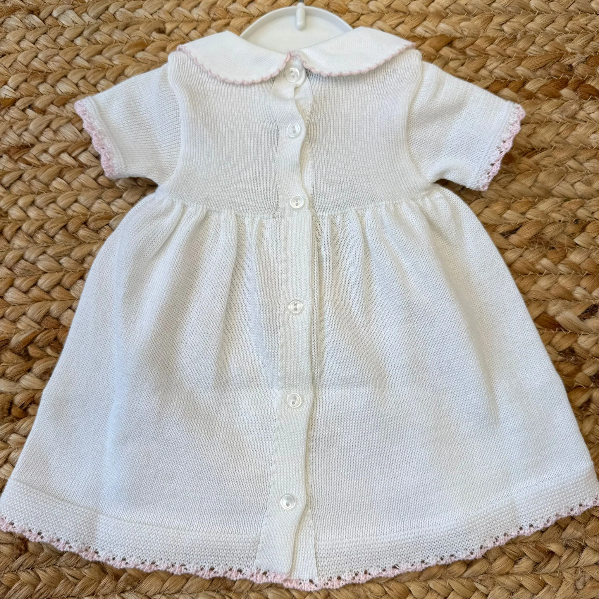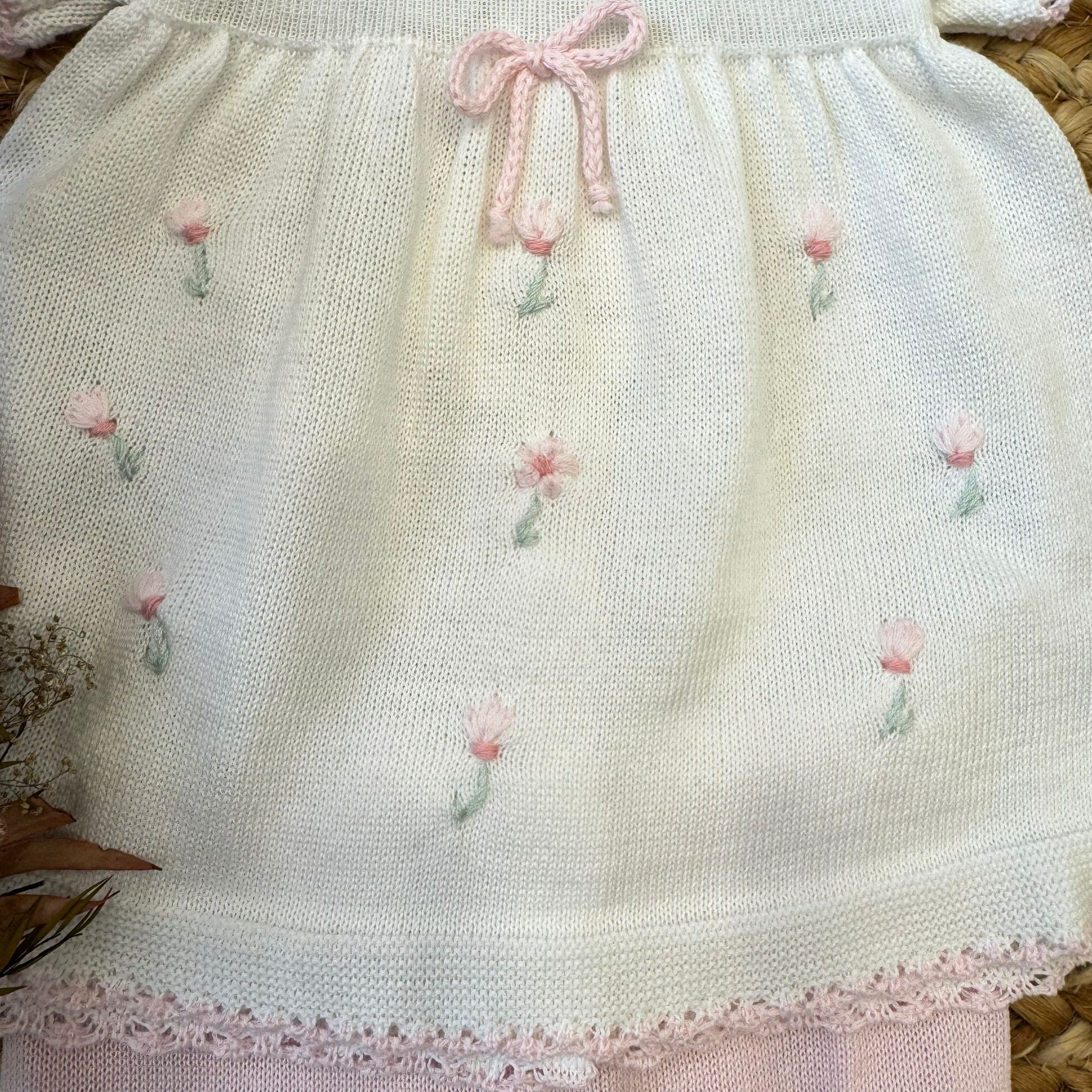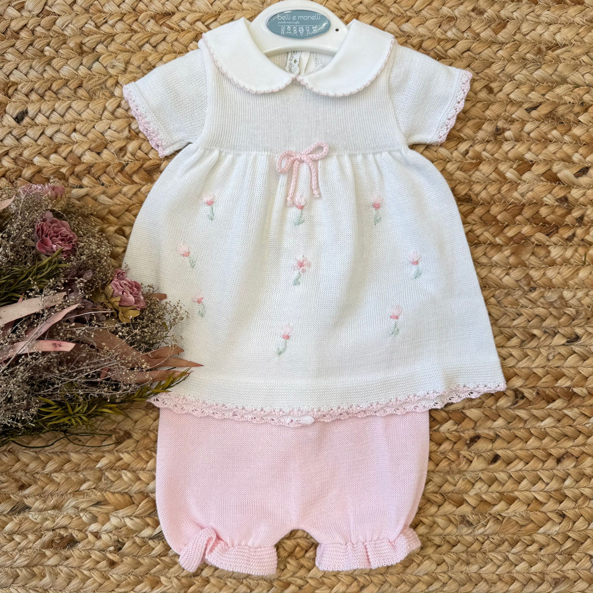 Tutina per neonata in 100% filo di cotone, composta da abito con colletto rifinito a mano e pantaloncino coordinato. I delicati tulipani ricamati a mano e il fiocco rosa centrale raccontano una femminilità elegante e senza tempo. Un completino raffinato, leggero e curato nei dettagli, pensato per le prime occasioni speciali.