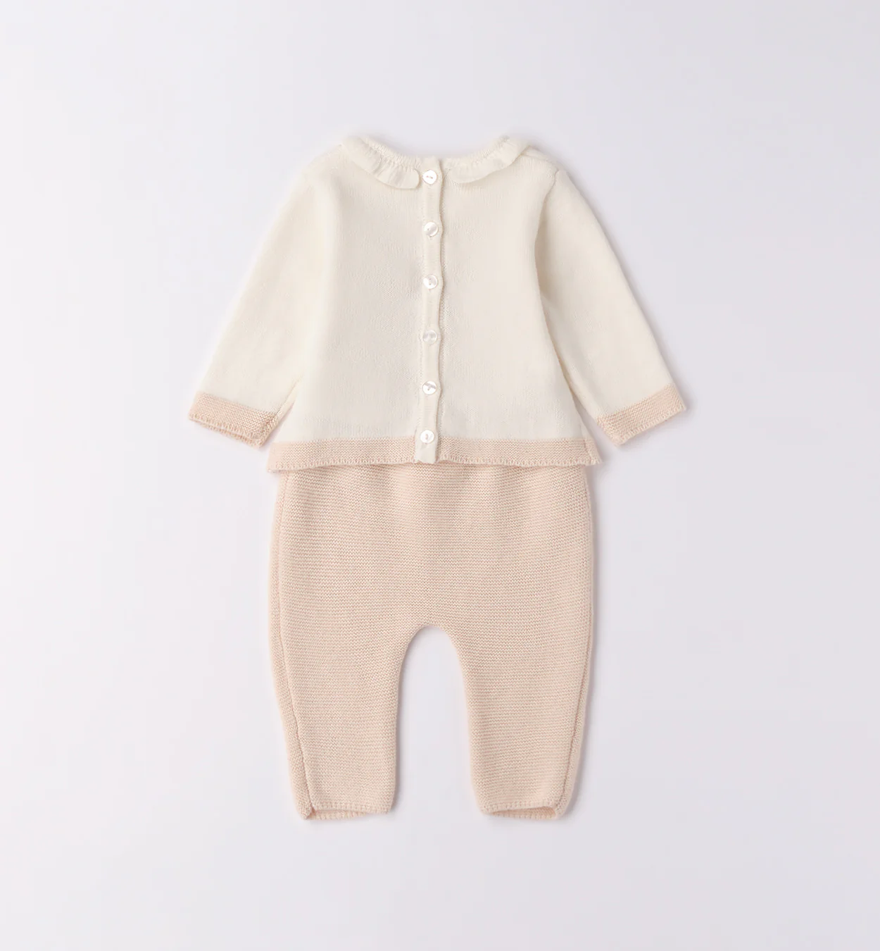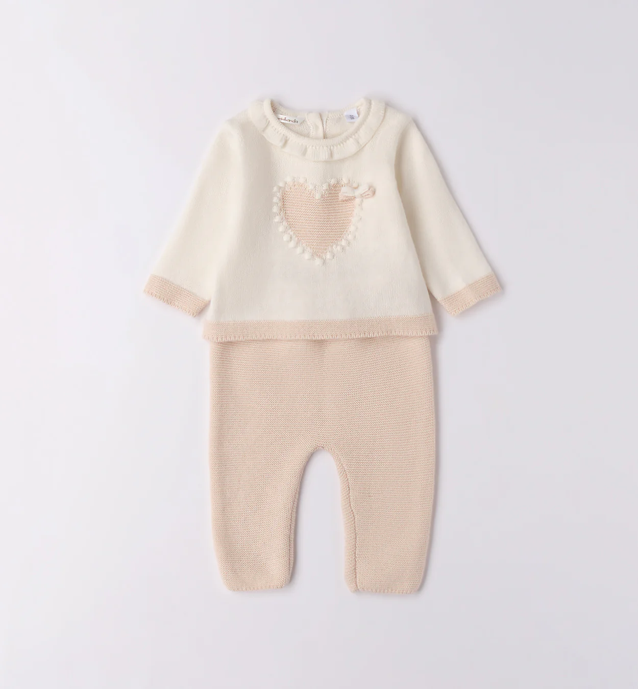 Tutina per neonata in maglia panna e beige, impreziosita da cuore centrale ricamato con fiocchetto applicato. Modello due pezzi uniti, con apertura posteriore a bottoni per una vestibilità comoda e pratica. Un capo dolce e raffinato, perfetto come idea regalo o per la prima uscita.