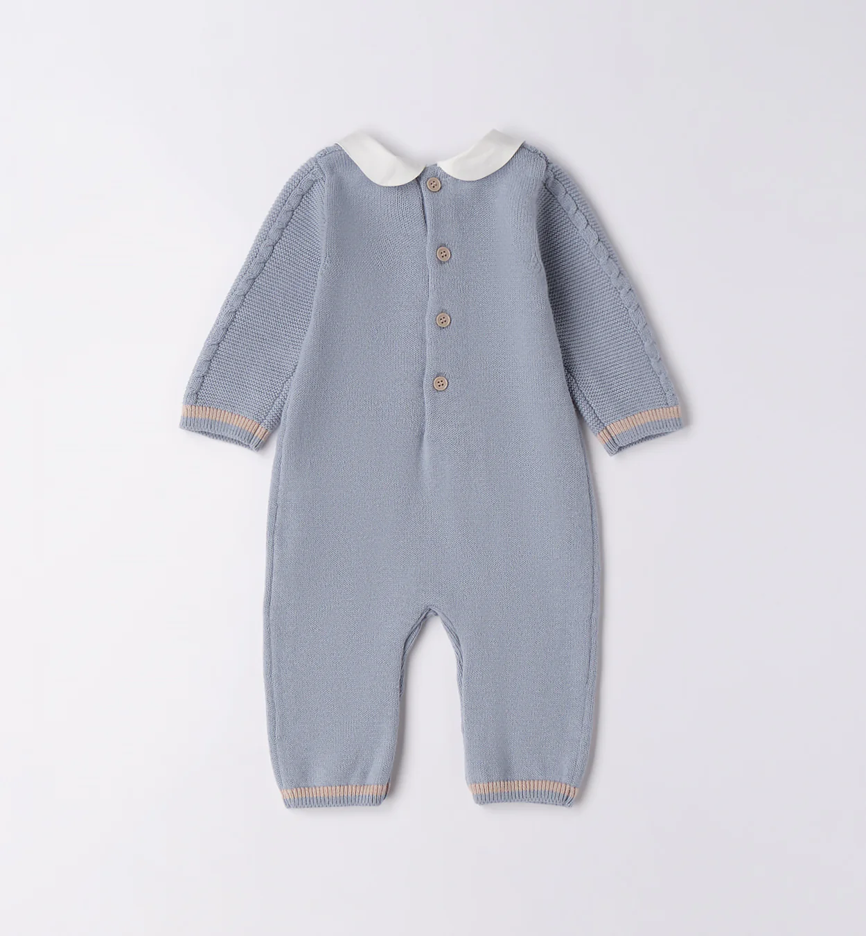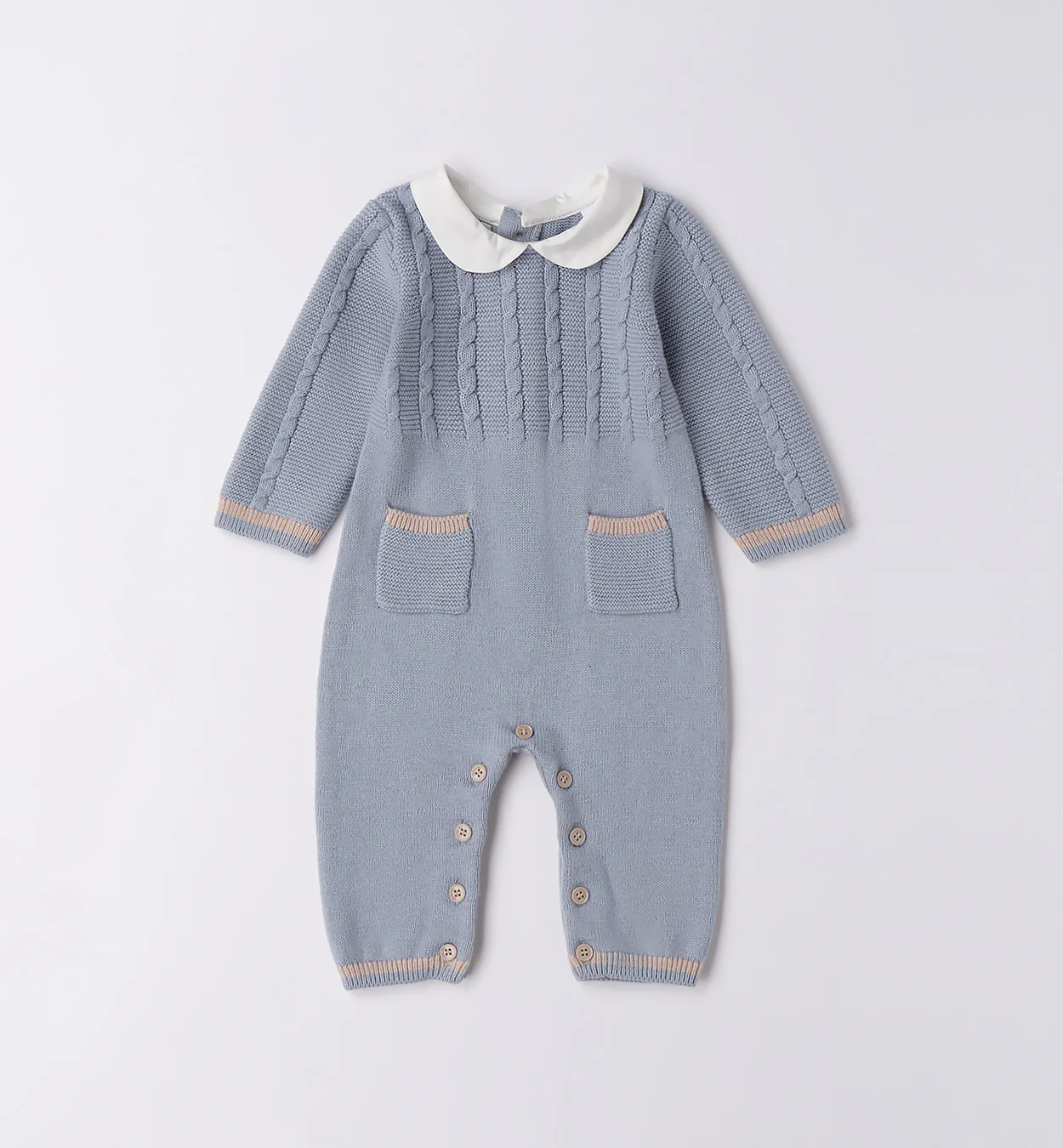 Elegante tutina per neonato azzurra con colletto bianco, realizzata in 80% cotone e 20% lana. Presenta lavorazione a trecce sul corpetto, due taschine frontali e delicati profili beige. Apertura con bottoni sul retro e sul cavallo per un cambio pratico. Morbida e raffinata, perfetta come idea regalo .