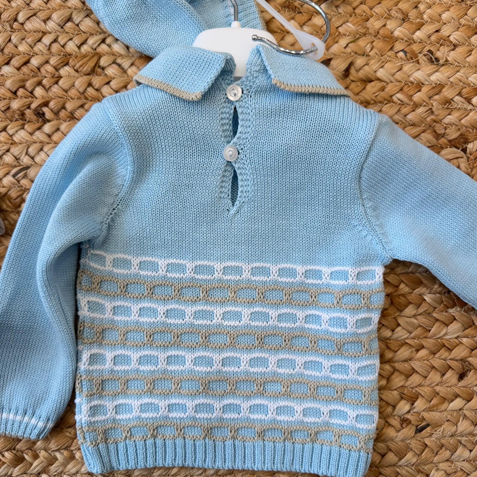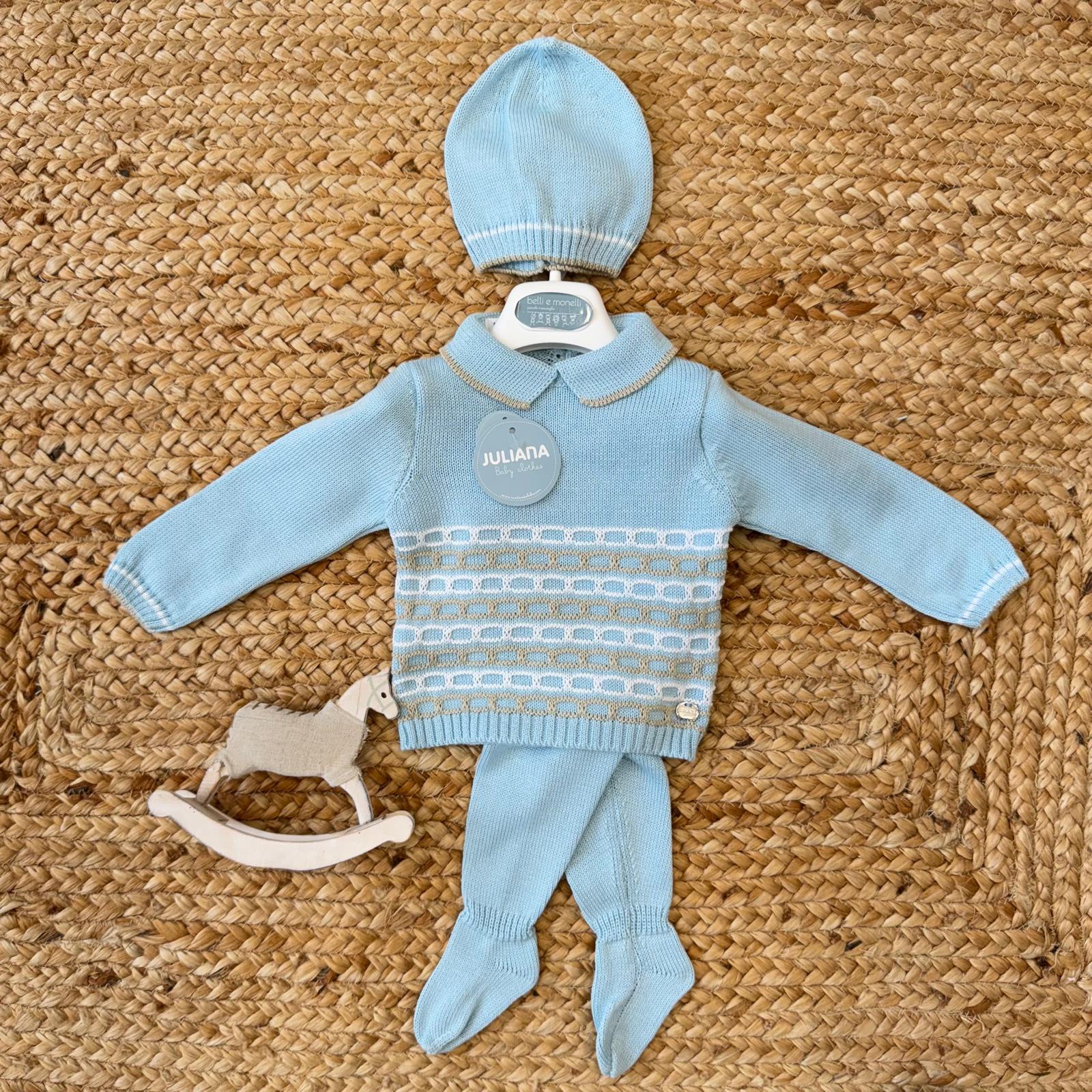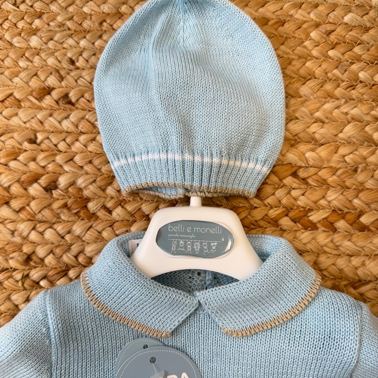 Tutina neonato in azzurro con colletto classico e lavorazione geometrica frontale nei toni bianco e tortora. Completa di ghettina coordinata e cappellino abbinato. Realizzata in 50% cotone e 50% acrilico, offre morbidezza e praticità per i primi mesi.