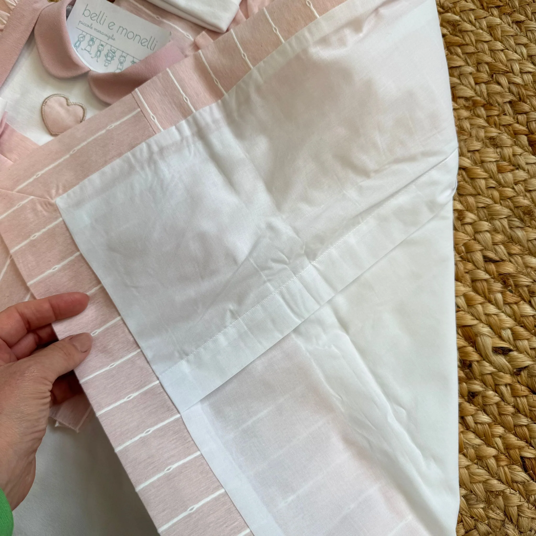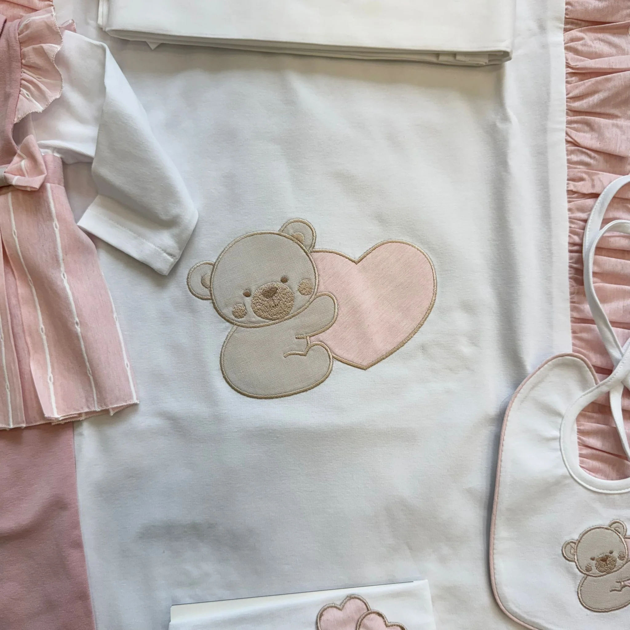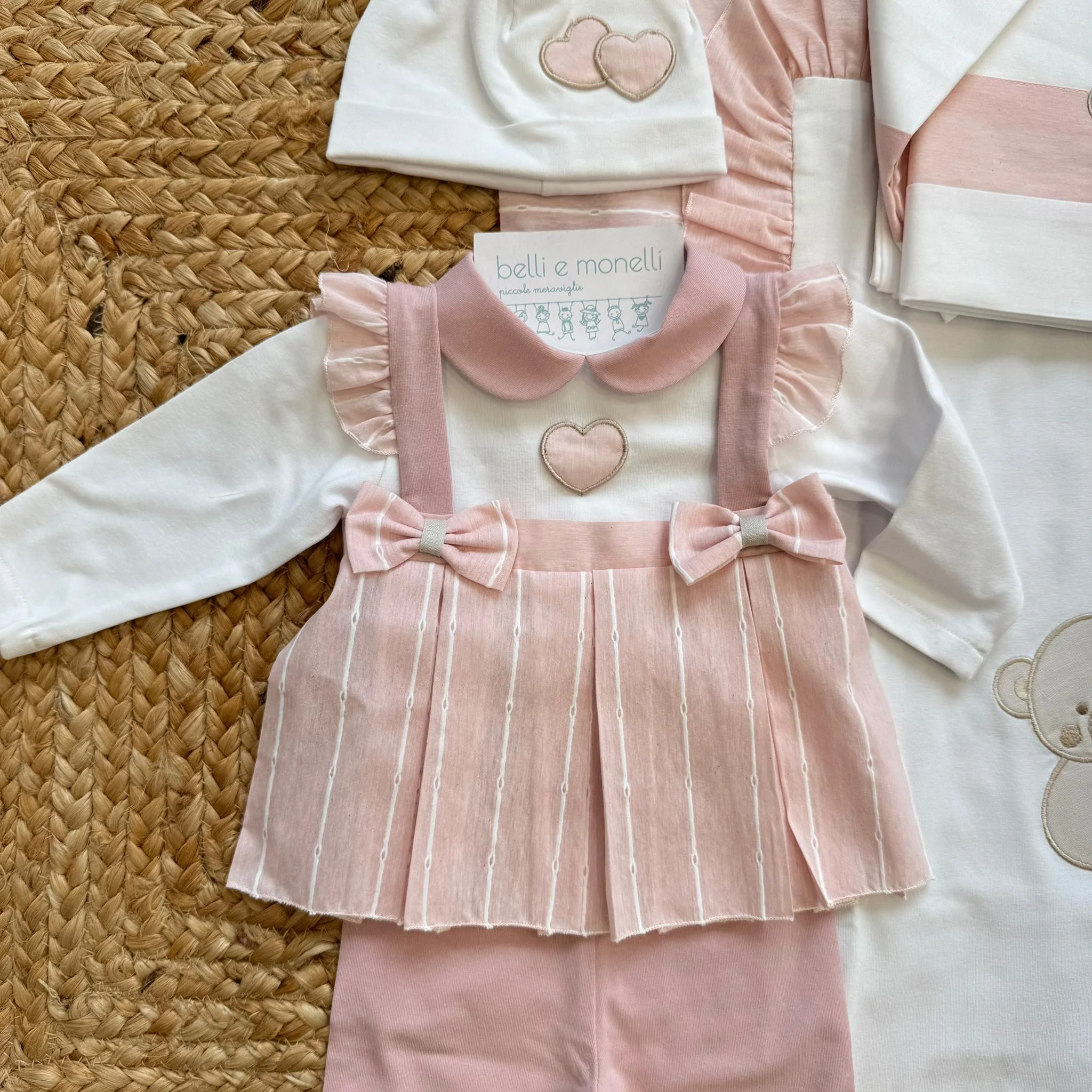 Un’uscita clinica raffinata e romantica in 100% cotone, composta da coperta sfoderabile (imbottitura non inclusa), completo due pezzi con maglia bianca e abitino rosa con fiocchi, pantalone rosa, cappellino e bavetta coordinati. Delicato ricamo orsetto con cuore rosa su coperta e accessori. Un coordinato elegante per i primi giorni speciali.