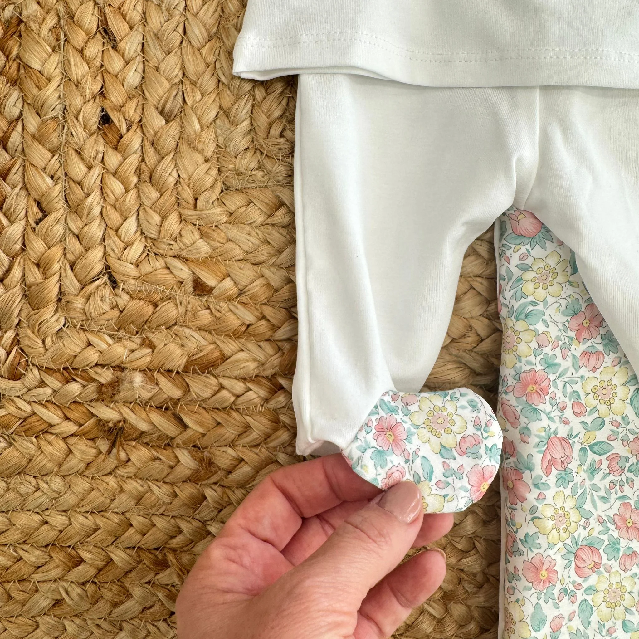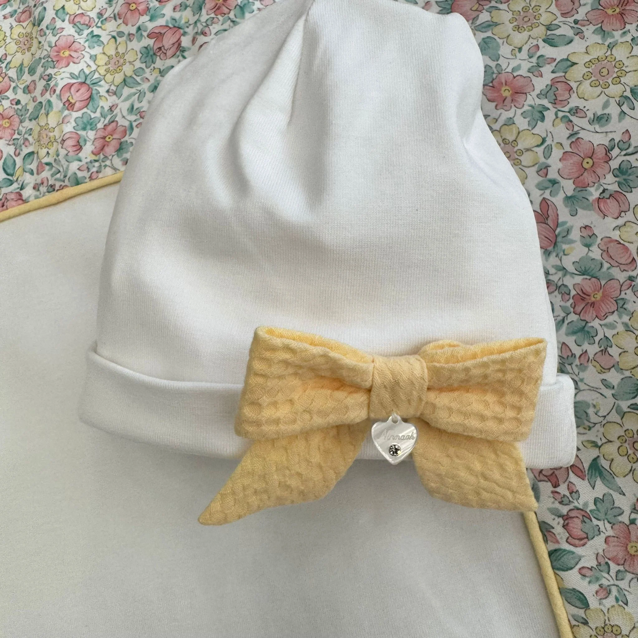 C’è una dolcezza luminosa in questo completo: il bianco puro incontra una romantica stampa floreale nei toni rosa, verde salvia e giallo tenue, impreziosita da fiocchi giallo pastello con piccolo cuore decorativo. Un coordinato raffinato, 100% cotone, pensato per accogliere i primi giorni con eleganza e cura sartoriale.
