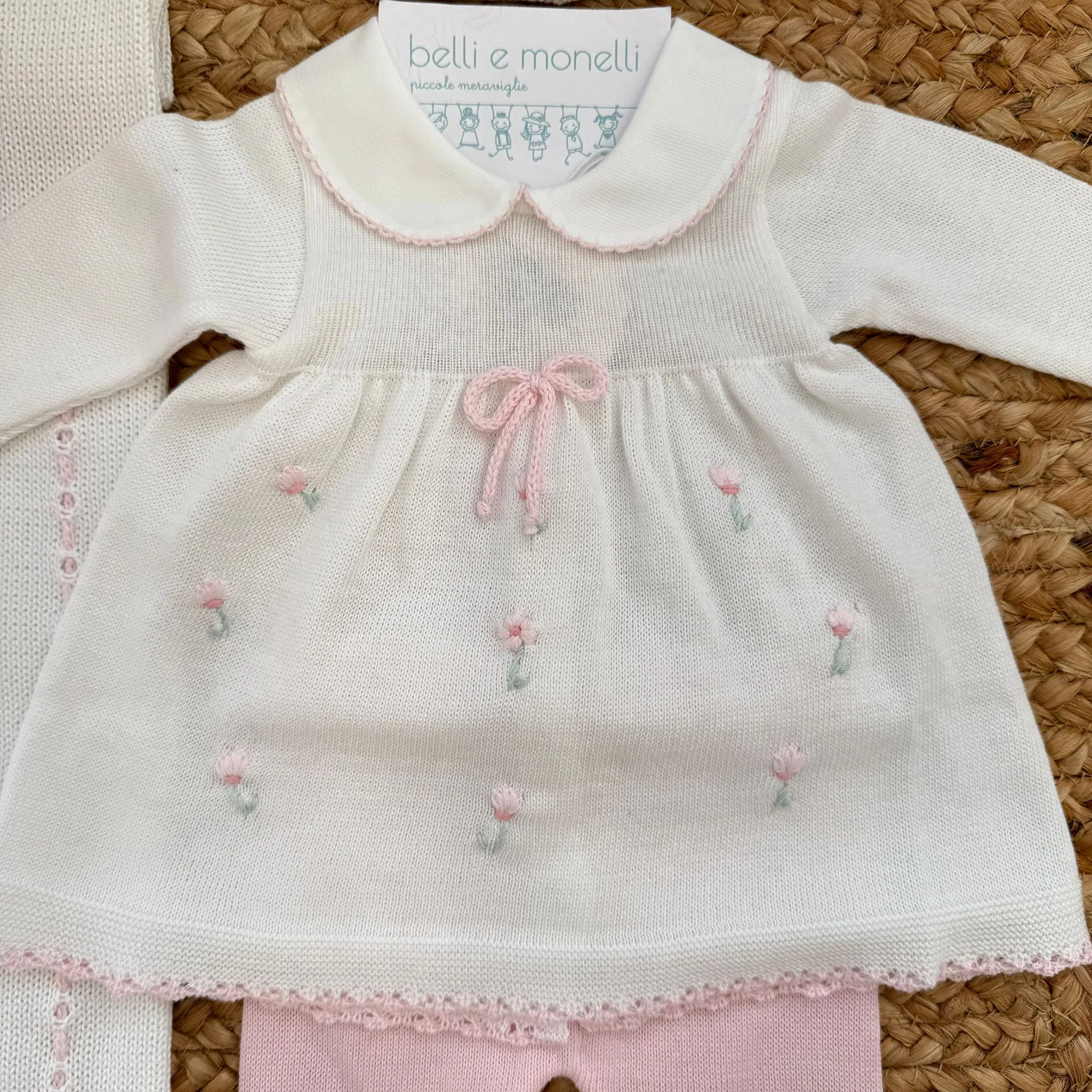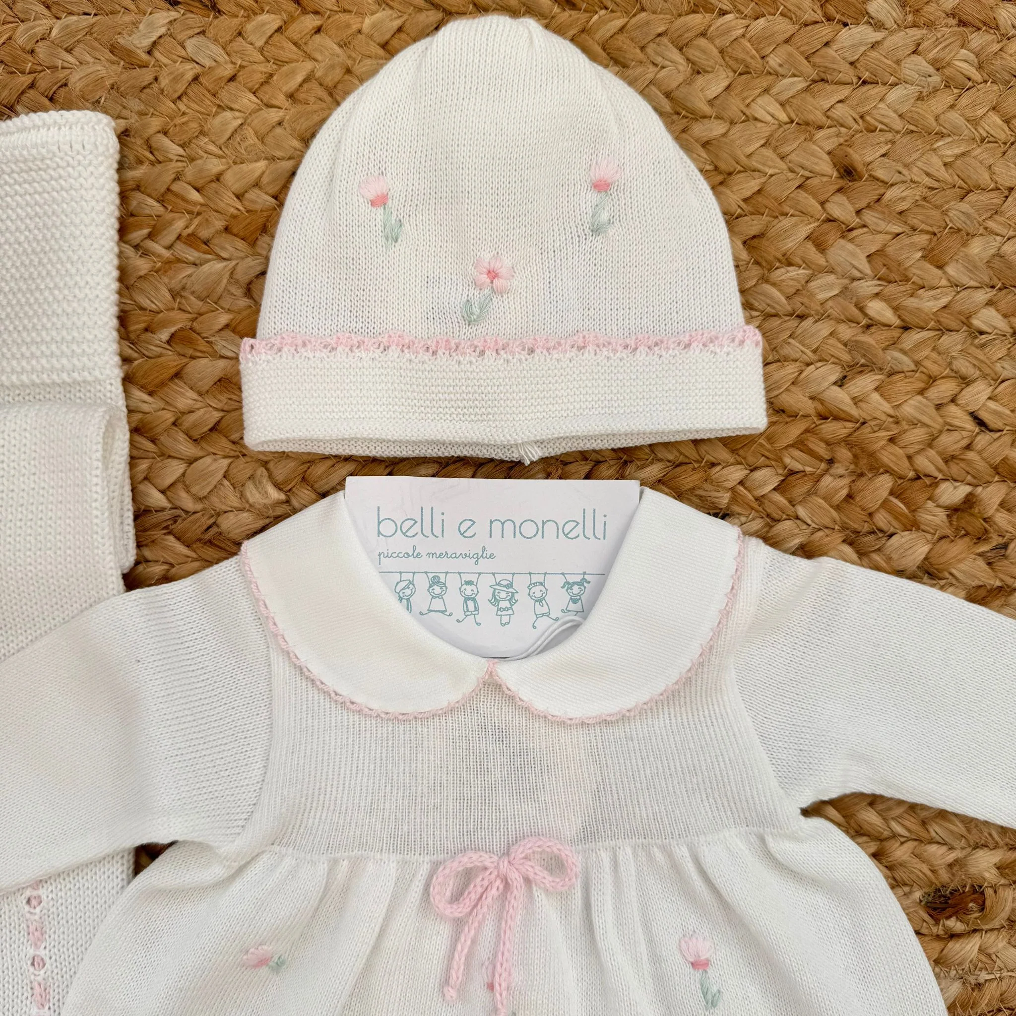 Un’uscita clinica per neonata in 100% filo di cotone, pensata per i primi giorni con delicatezza ed eleganza. Il set comprende tutina, copertina, cappellino, scarpette e lenzuola abbinate, impreziosite da piccoli ricami floreali rosa e finiture sartoriali curate. Un set nascita raffinato, leggero e traspirante(100% filo di cotone).