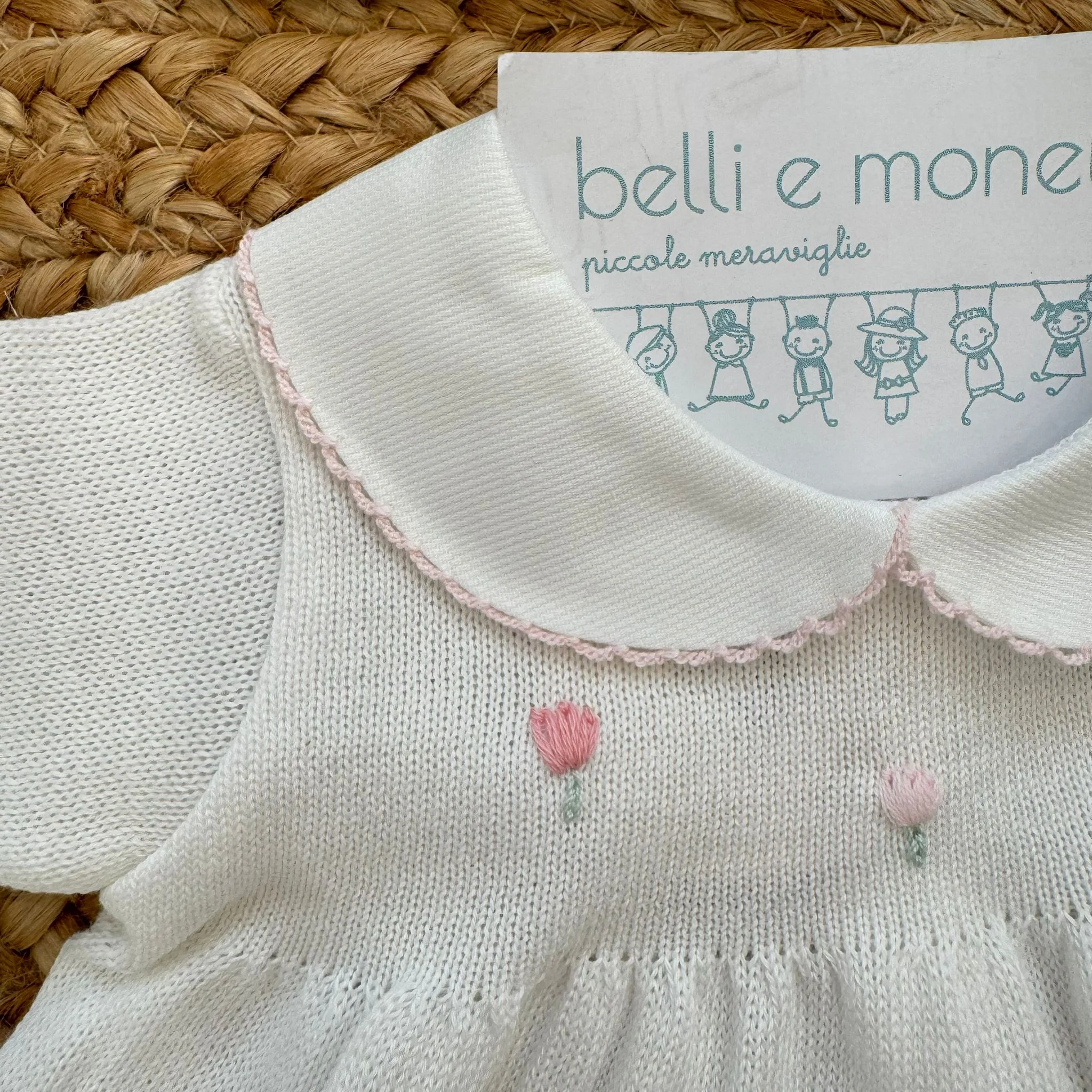 Un’uscita clinica per neonata dal gusto delicato e senza tempo, realizzata in 100% filo di cotone. Il set è composto da copertina coordinata, abito con colletto arrotondato e pantalone, cappellino e scarpette abbinate. I tulipani ricamati a mano nei toni rosa, lilla e bianco decorano con discrezione ogni capo, creando un insieme armonioso e raffinato, pensato per mamme che riconoscono il valore della qualità e dei dettagli sartoriali.