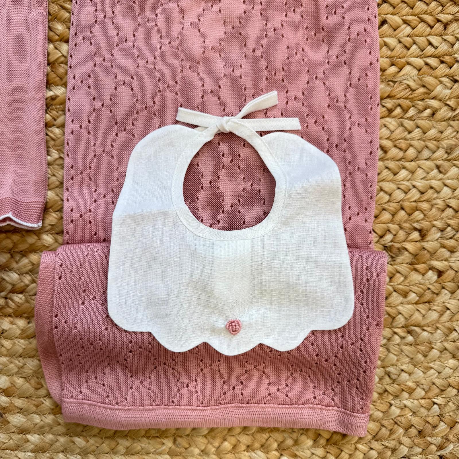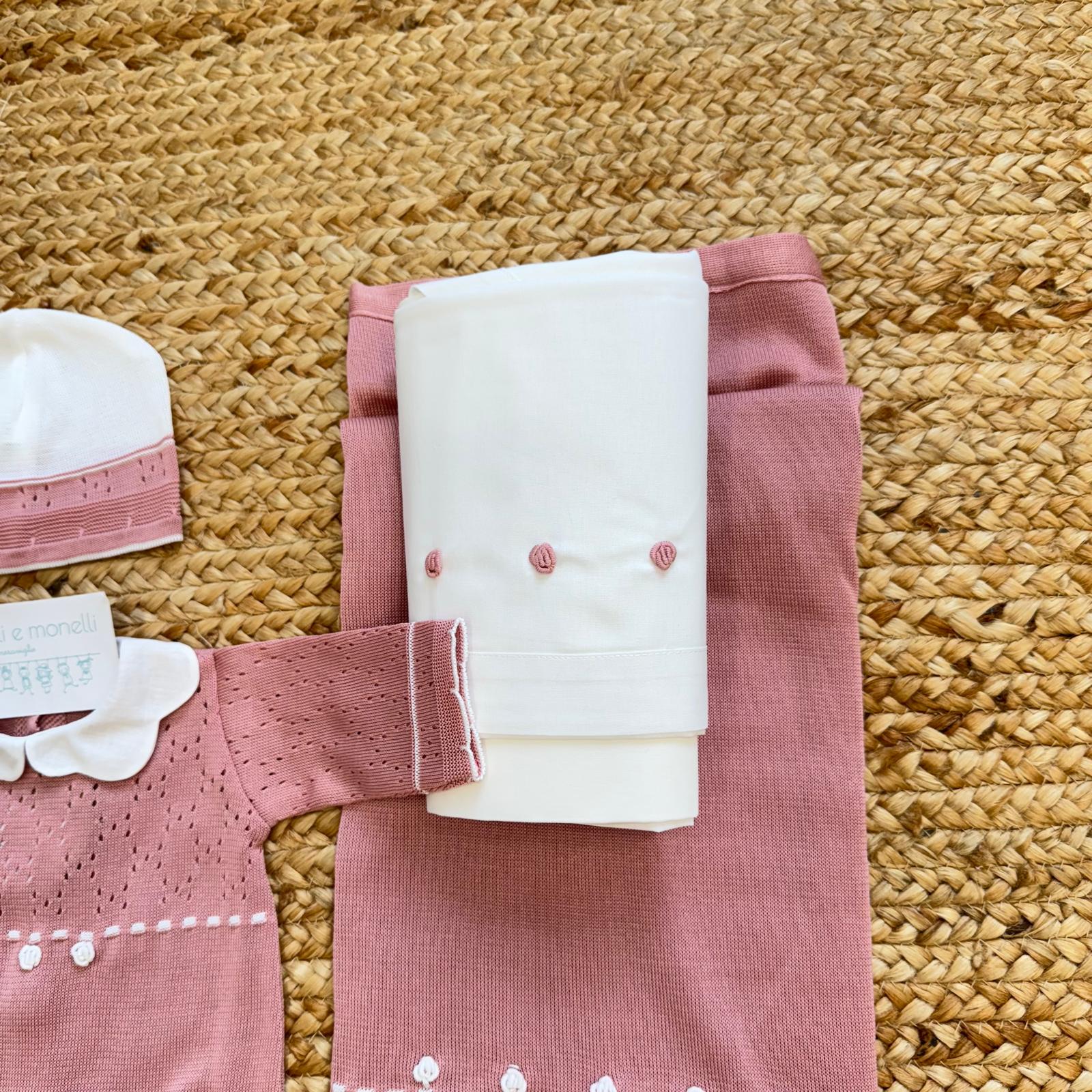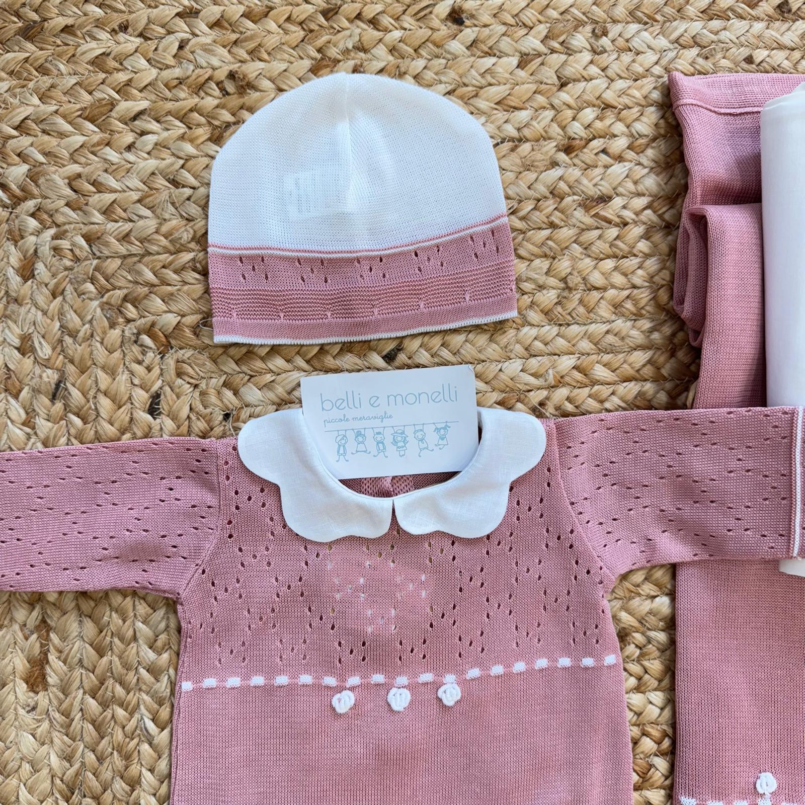 Un corredino nascita elegante e armonioso, pensato per accompagnare la tua bambina nel suo primo giorno speciale con dolcezza, raffinatezza e qualità autentica. Questo set nascita neonata in 100% cotone si distingue per la lavorazione traforata, i dettagli romantici e la delicata tonalità rosa cipria abbinata al panna.