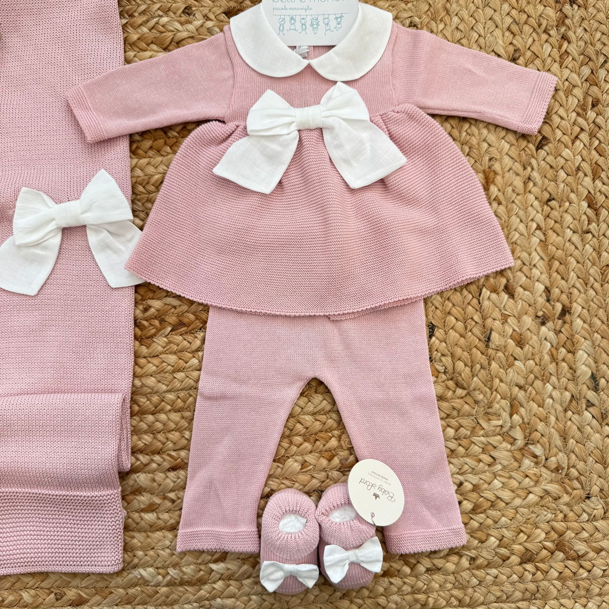 Un coordinato neonata in 100% filo di cotone pensato per le prime uscite e i momenti più dolci. L’abito con colletto bianco e fiocco applicato, il pantalone coordinato, la copertina, il cappellino e le scarpette creano un set nascita elegante, leggero e raffinato, ideale come uscita clinica in cotone per la mezza stagione.
