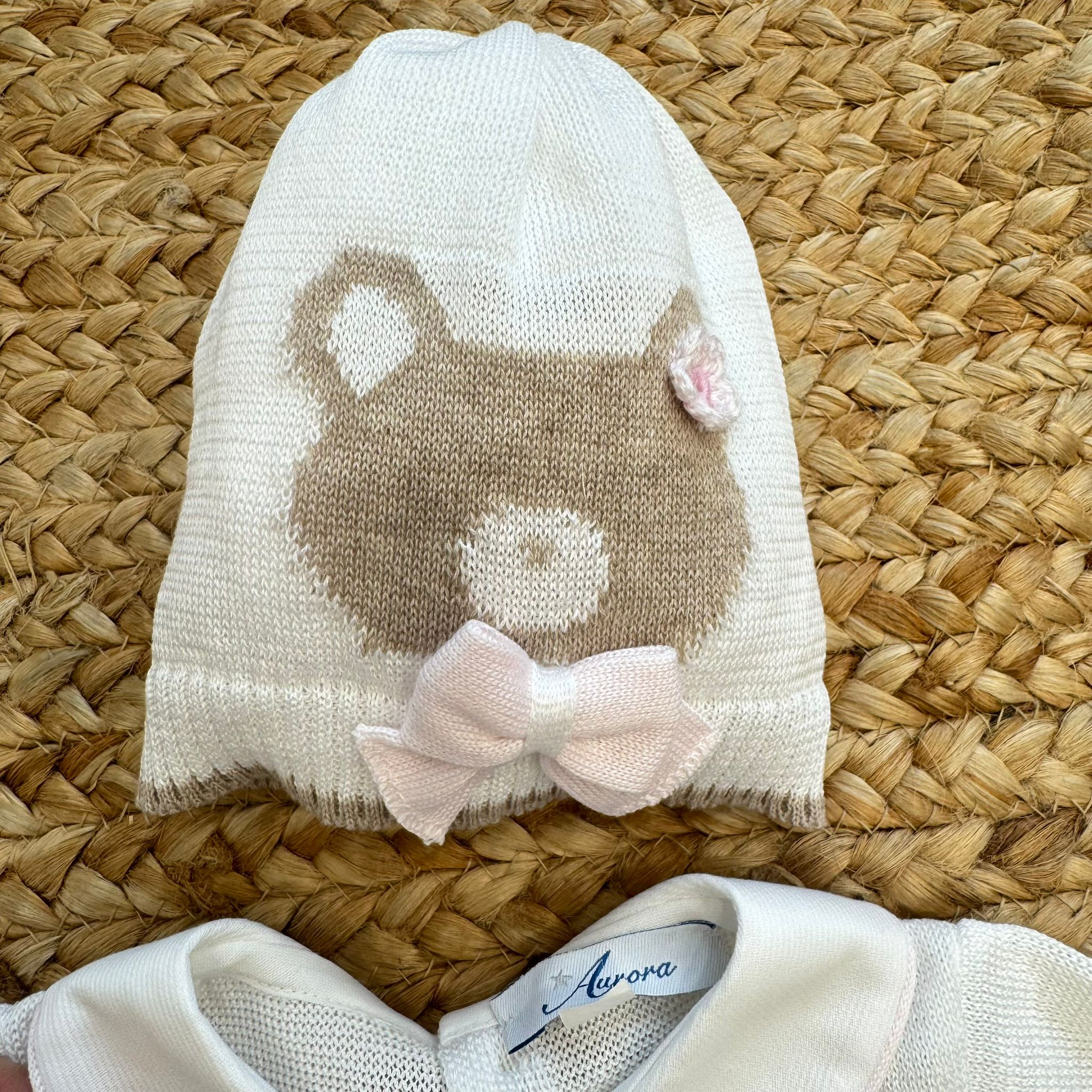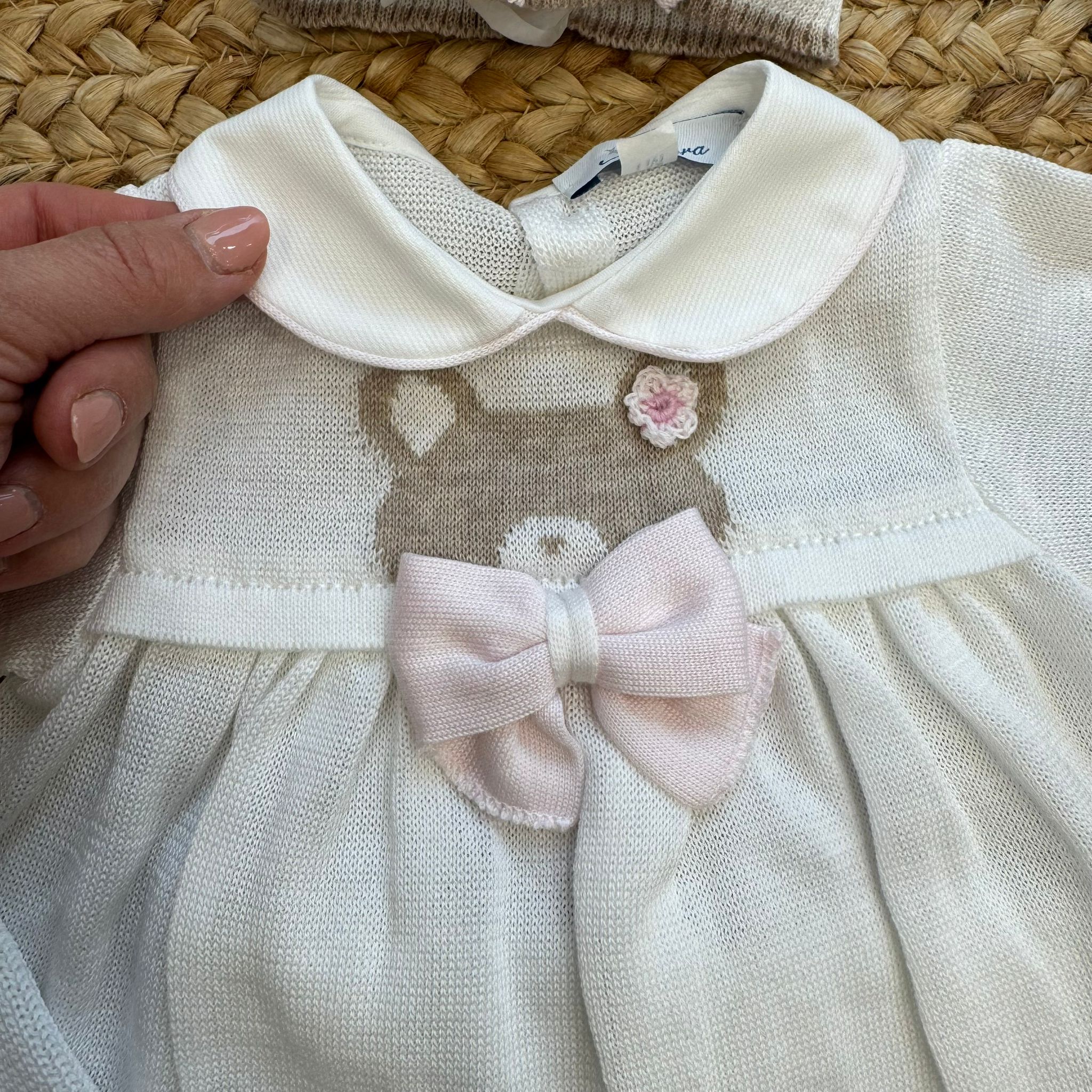 Un’uscita clinica per neonata delicata ed elegante, realizzata in 100% cotone filo di Scozia. Il set è composto da abitino con pantalone coordinato, copertina, cappellino e scarpette. L’orsetto lavorato a maglia, il fiocco rosa e i piccoli fiori ricamati rendono questo completino raffinato e senza tempo.