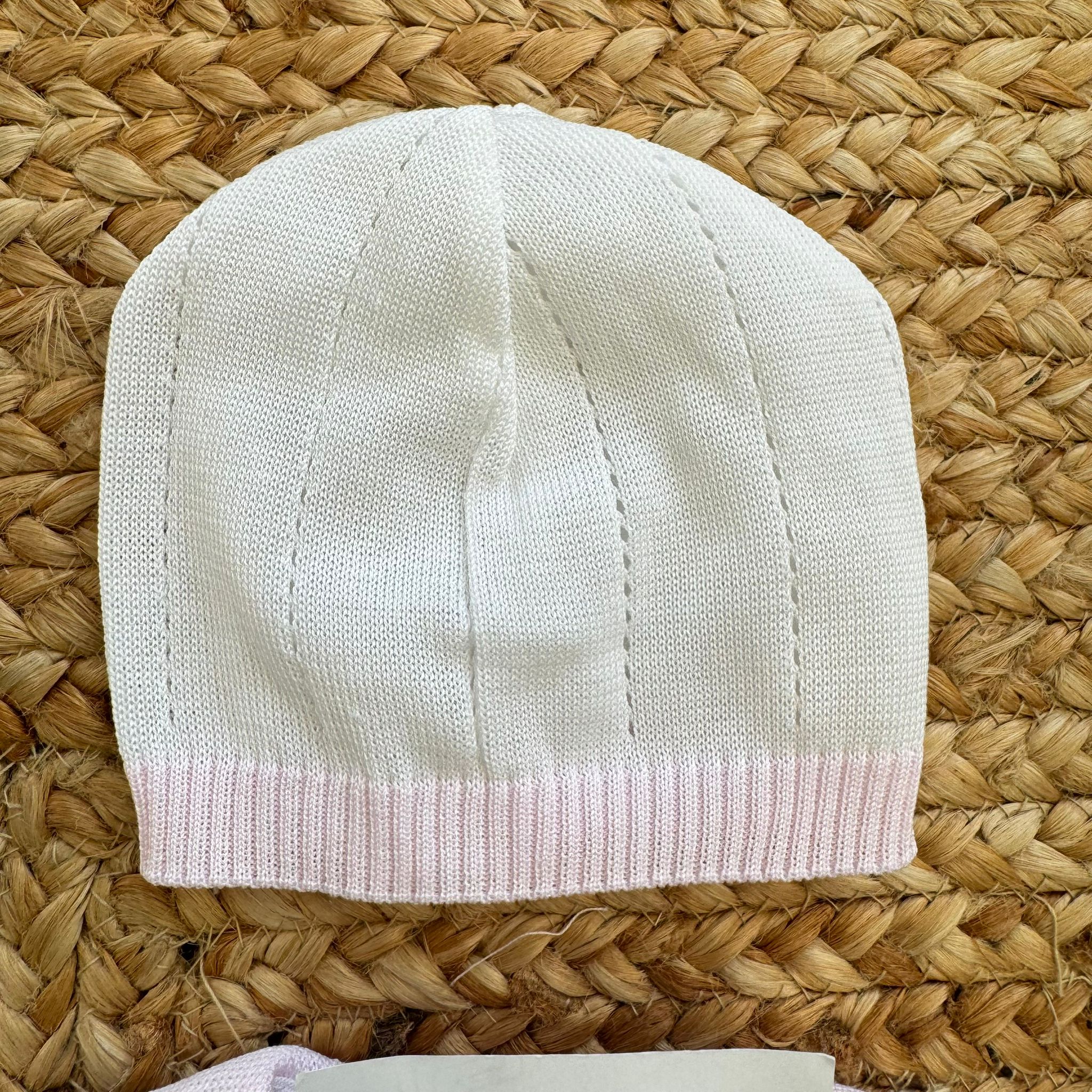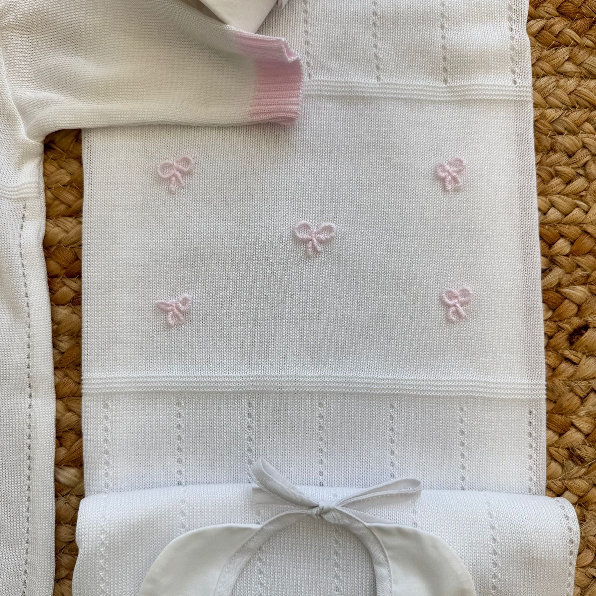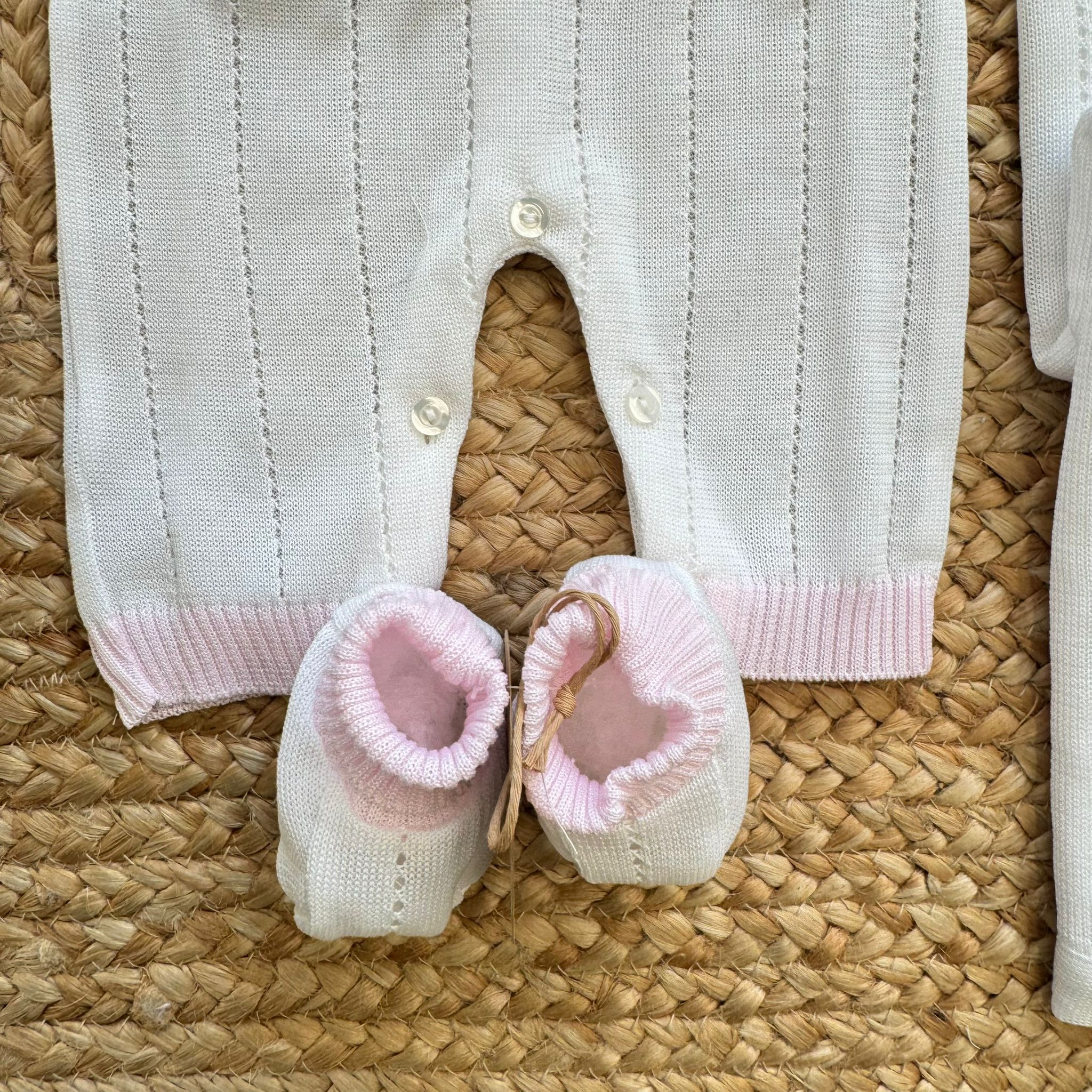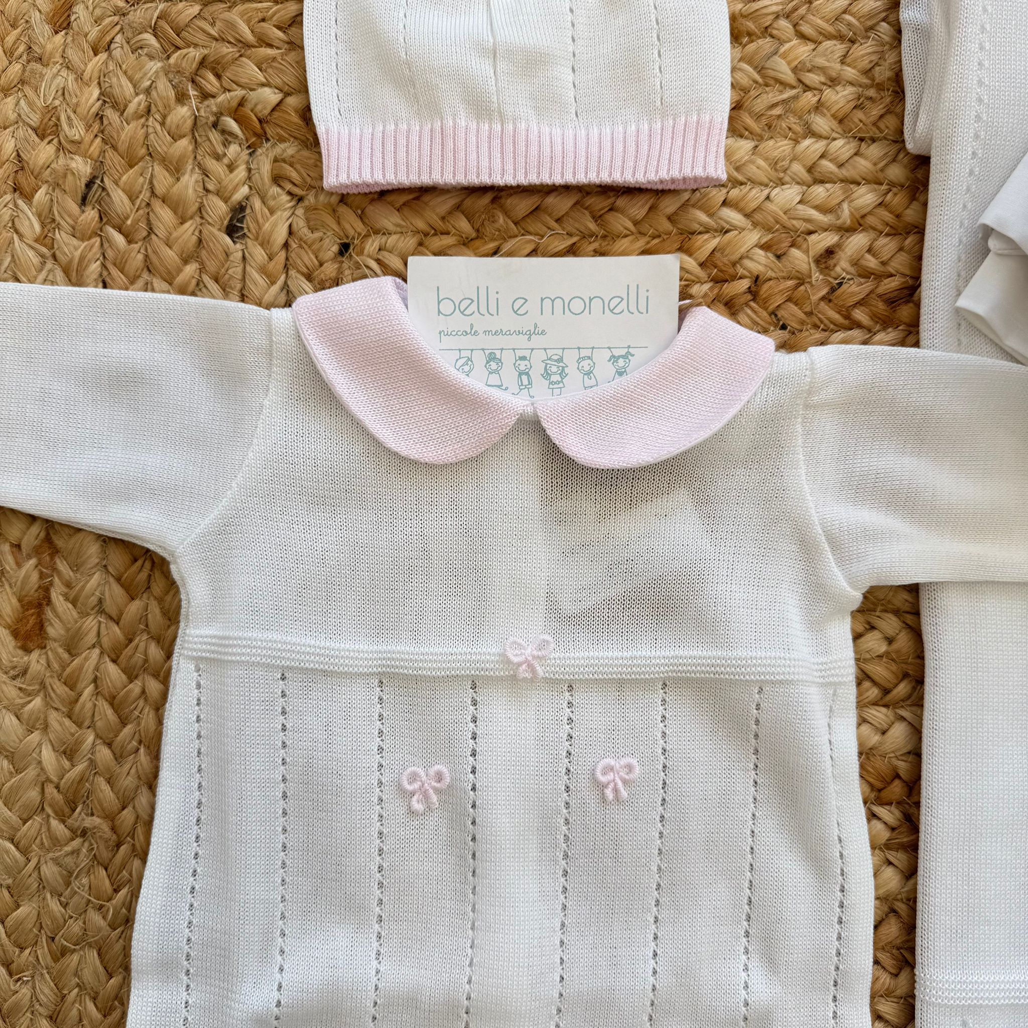 Uscita clinica neonata in 100% cotone composta da tutina intera panna con colletto rosa, cappellino coordinato, scarpine con risvolto rosa, copertina lavorata con fiocchi ricamati, bavetta bianca con fiocco e lenzuolino con ricami rosa. Lavorazione traforata verticale e finiture a contrasto rendono questo set nascita raffinato e prezioso.