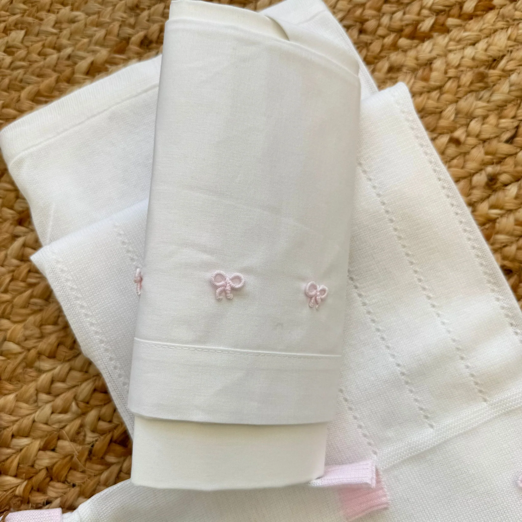 Lenzuolino bianco con piccoli fiocchi rosa ricamati