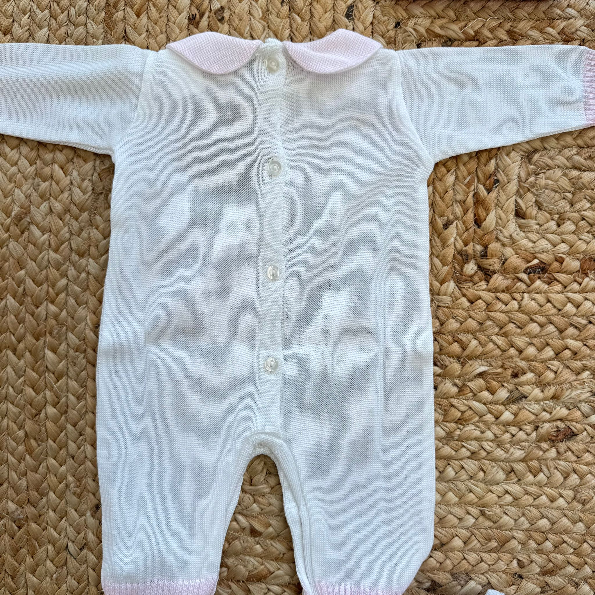 Un candore luminoso impreziosito da piccoli fiocchi rosa ricamati a rilievo: un’uscita clinica che racconta delicatezza, ordine e armonia in ogni dettaglio.