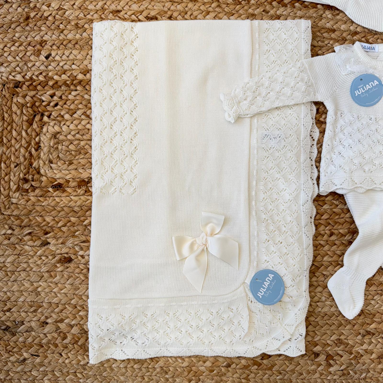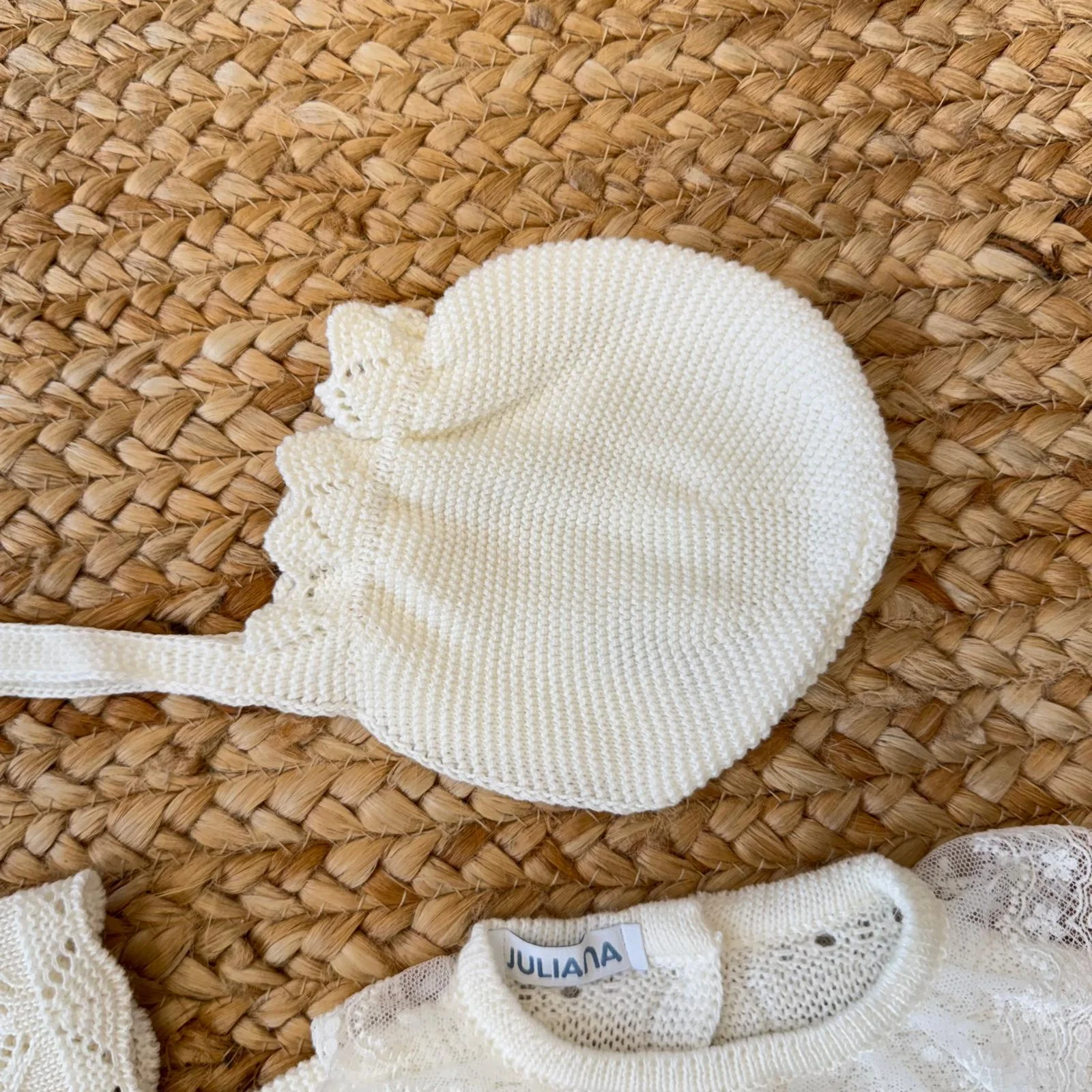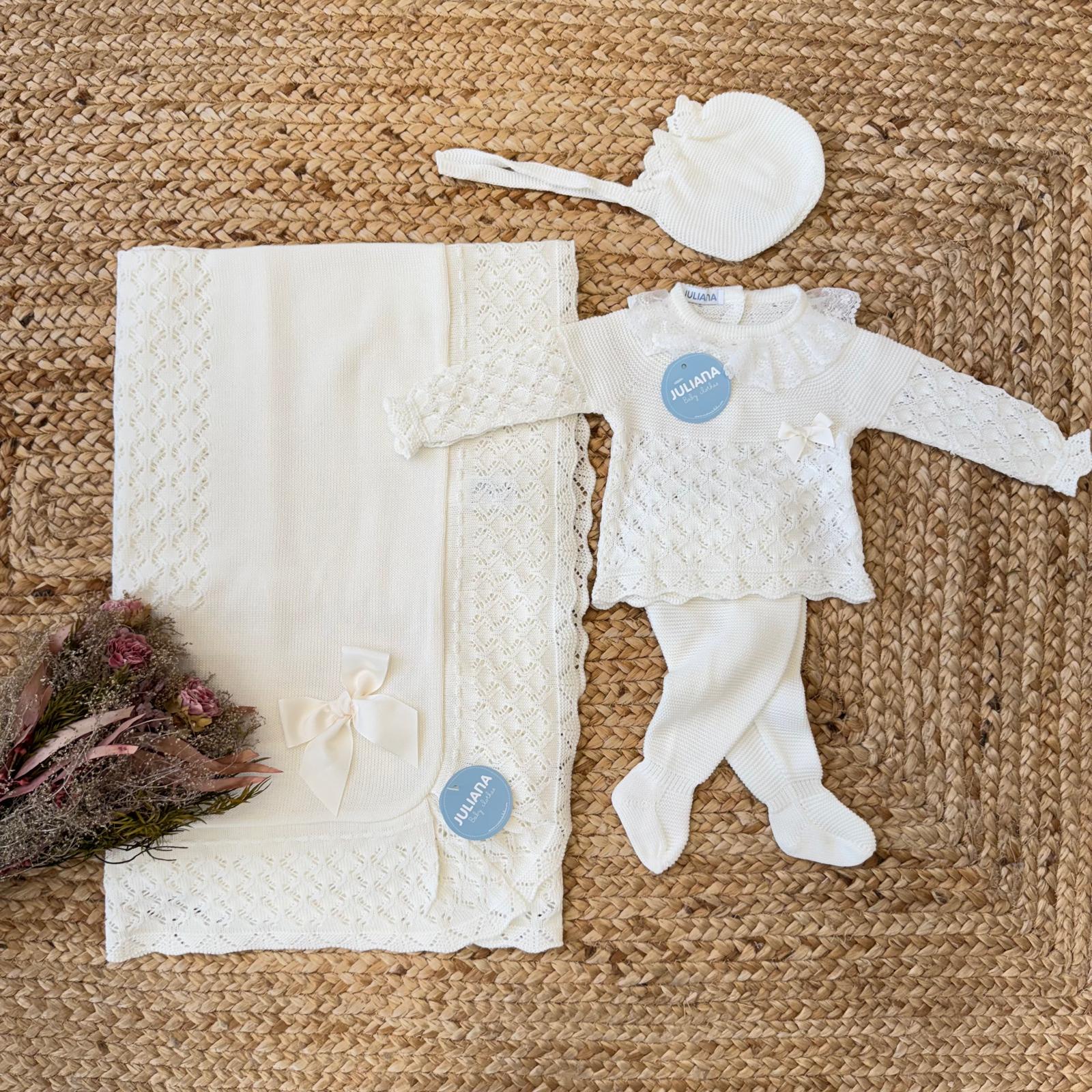 Un’uscita clinica delicata e luminosa nei toni panna, composta da copertina lavorata con fasce traforate, maglia con motivo intrecciato e fiocco applicato, pantalone con piedini e cappellino coordinato. Il colletto in tulle leggero dona un tocco raffinato e romantico. Set nascita elegante, pensato per il primo incontro più emozionante. Che ci crediate o no, i vostri bambini cambieranno il mondo.