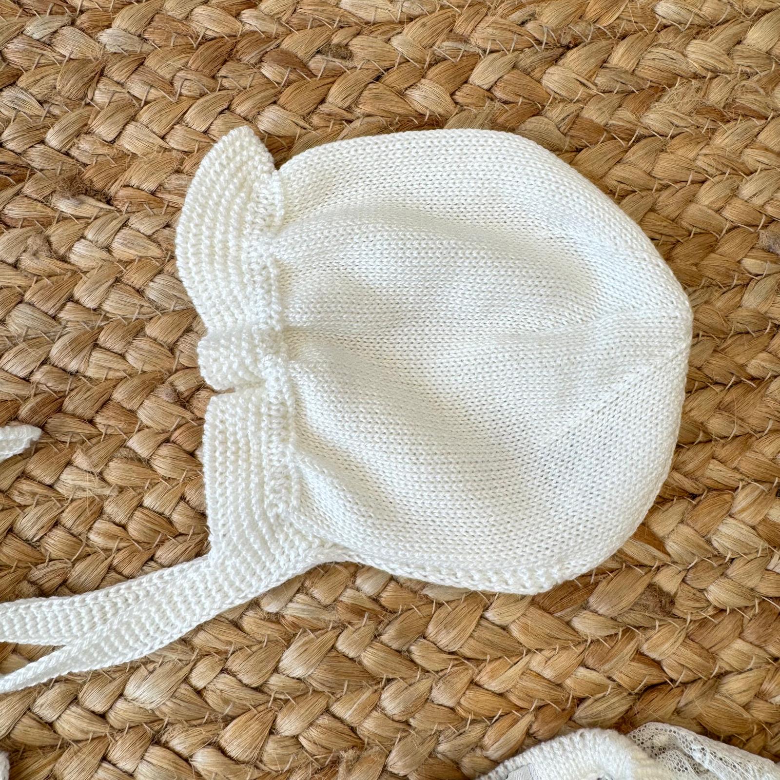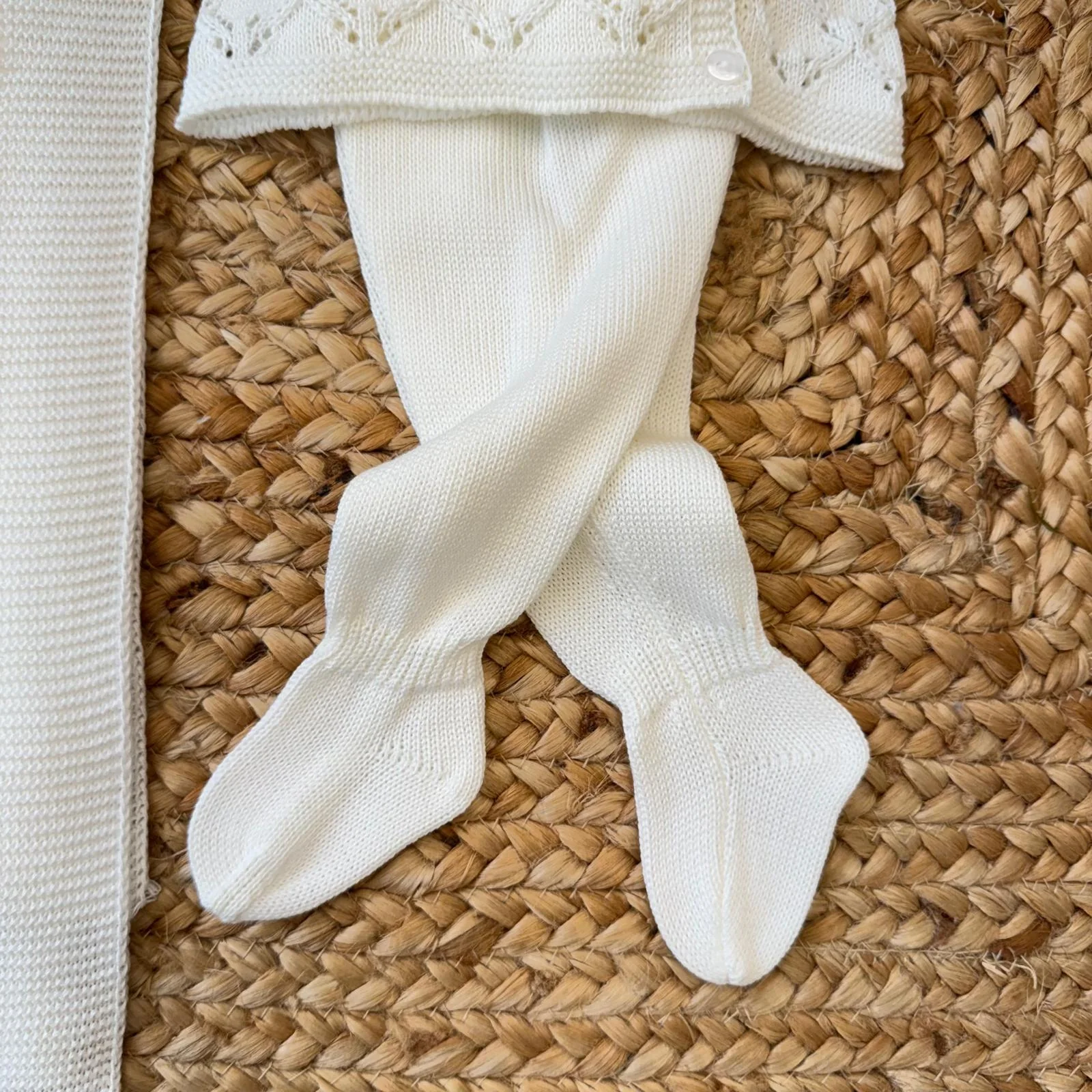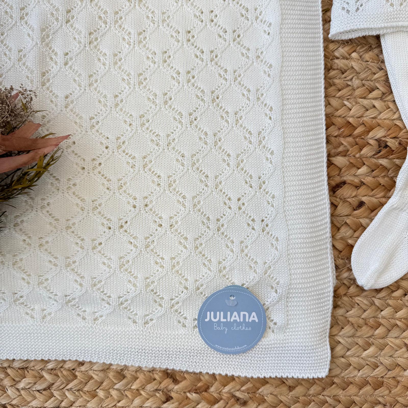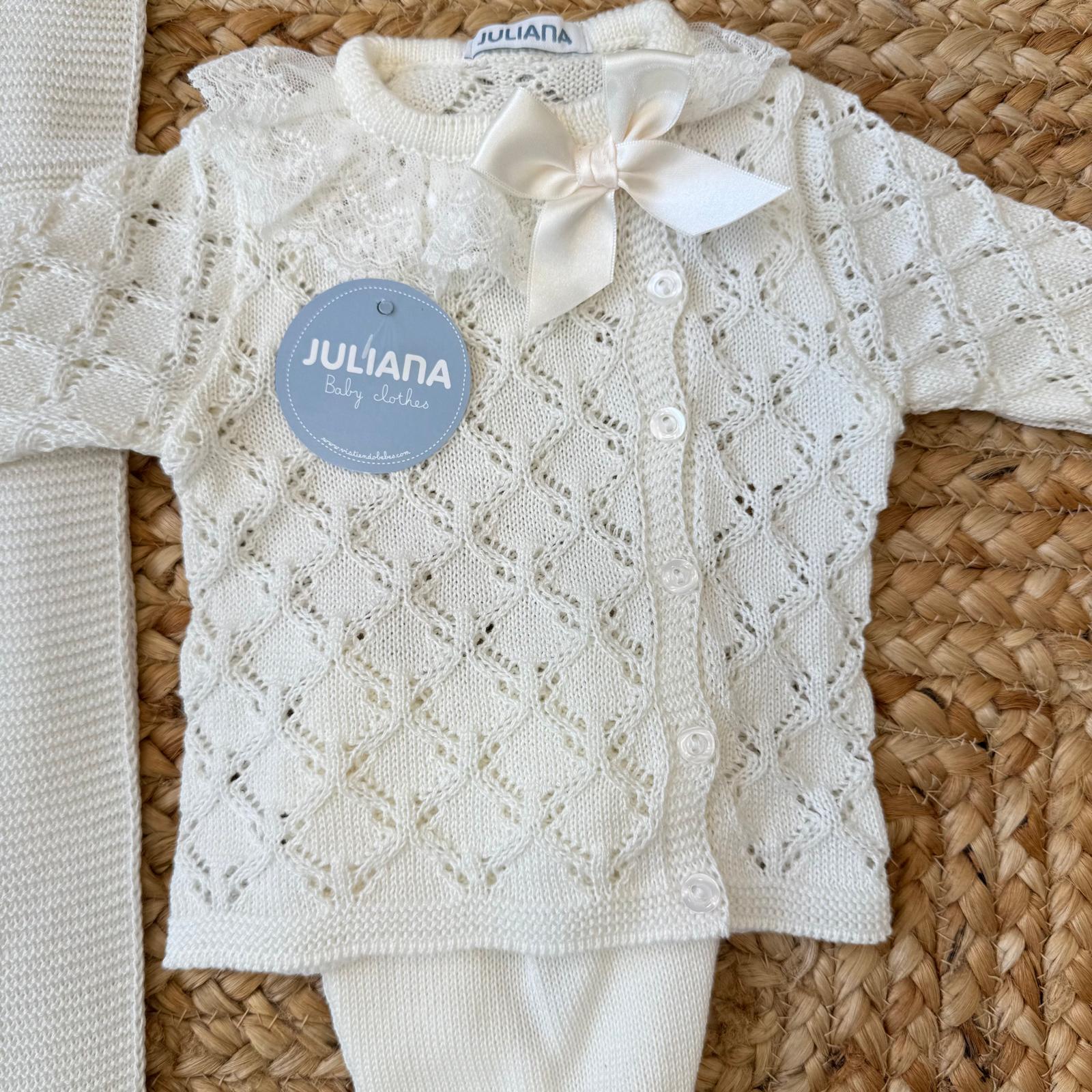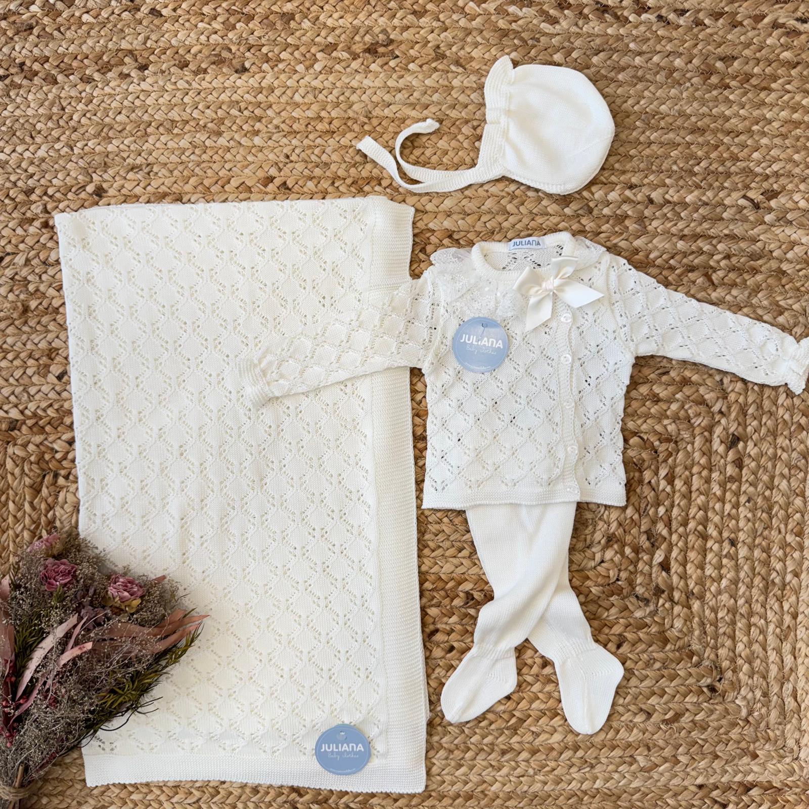 Un’uscita clinica luminosa e senza tempo. La copertina presenta lavorazione traforata centrale e bordo coordinato con fiocco panna applicato. Il completo due pezzi include maglia traforata con colletto in pizzo e fiocco laterale, ghettina coordinata e cappellino abbinato. Un set nascita elegante, perfetto per un ingresso dolce e raffinato.