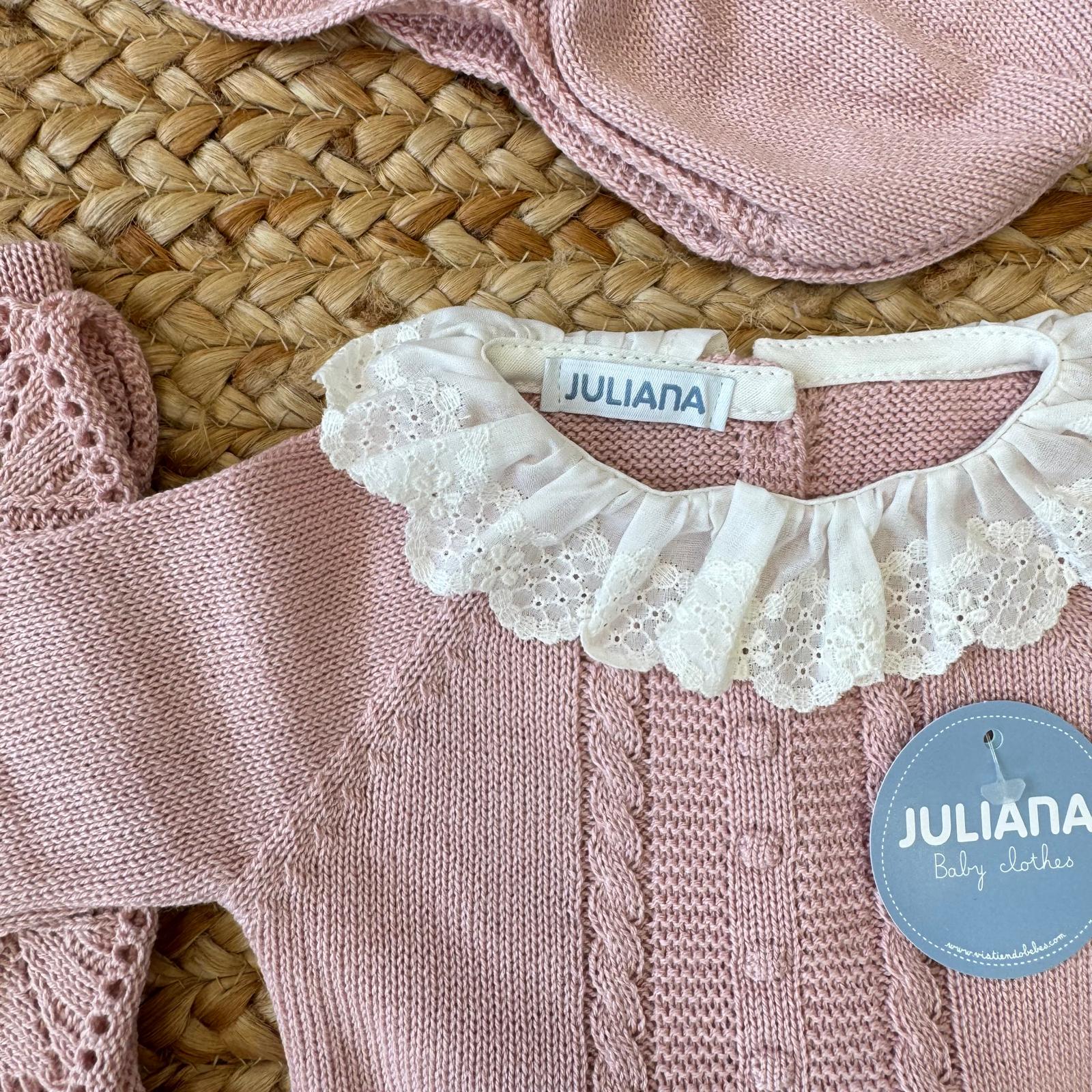 Perfetta come set nascita, completo prima nascita o coordinato uscita ospedale, unisce eleganza classica e funzionalità. Le lavorazioni a maglia traforata e il colletto in pizzo valorizzano l’insieme con uno stile delicato, ideale per le prime fotografie e per un’accoglienza speciale.