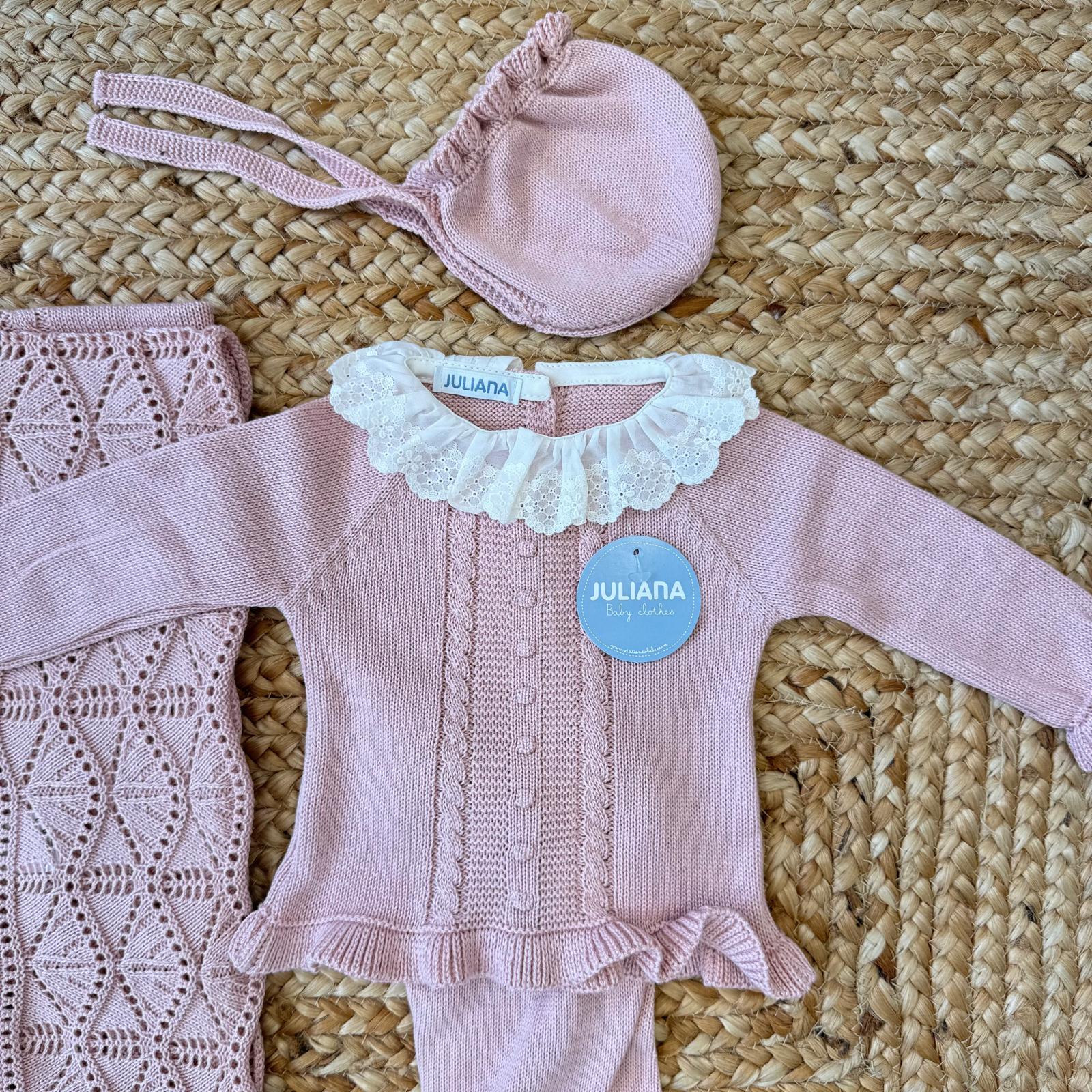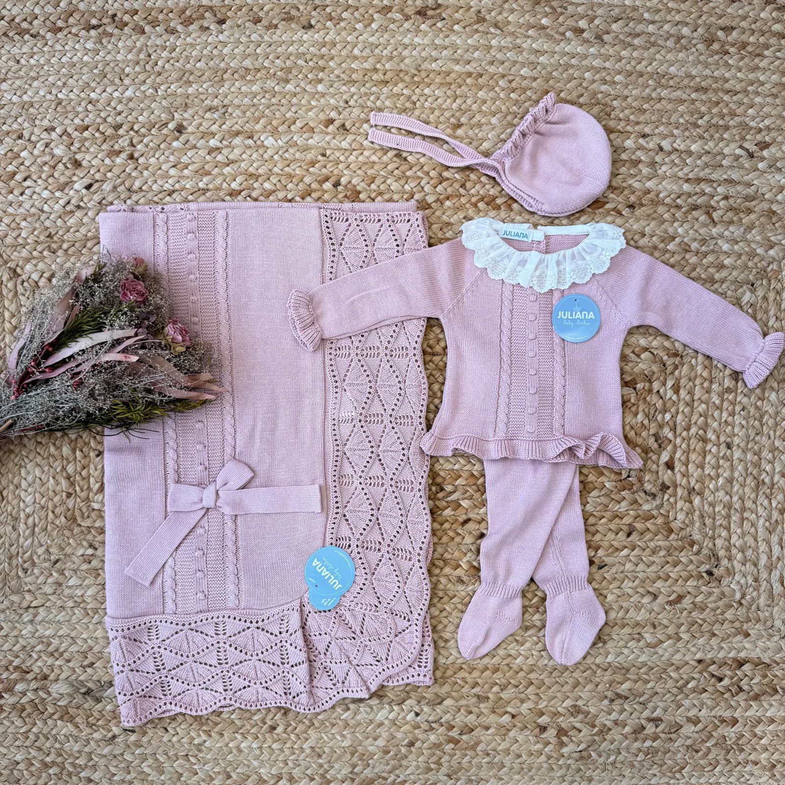 Ci sono uscite clinica che vestono. E poi ci sono quelle che raccontano la dolcezza dei primi giorni. Questo coordinato per neonata, in elegante rosa antico, è pensato per accompagnare il suo primo rientro a casa con equilibrio, raffinatezza e dettagli curati.