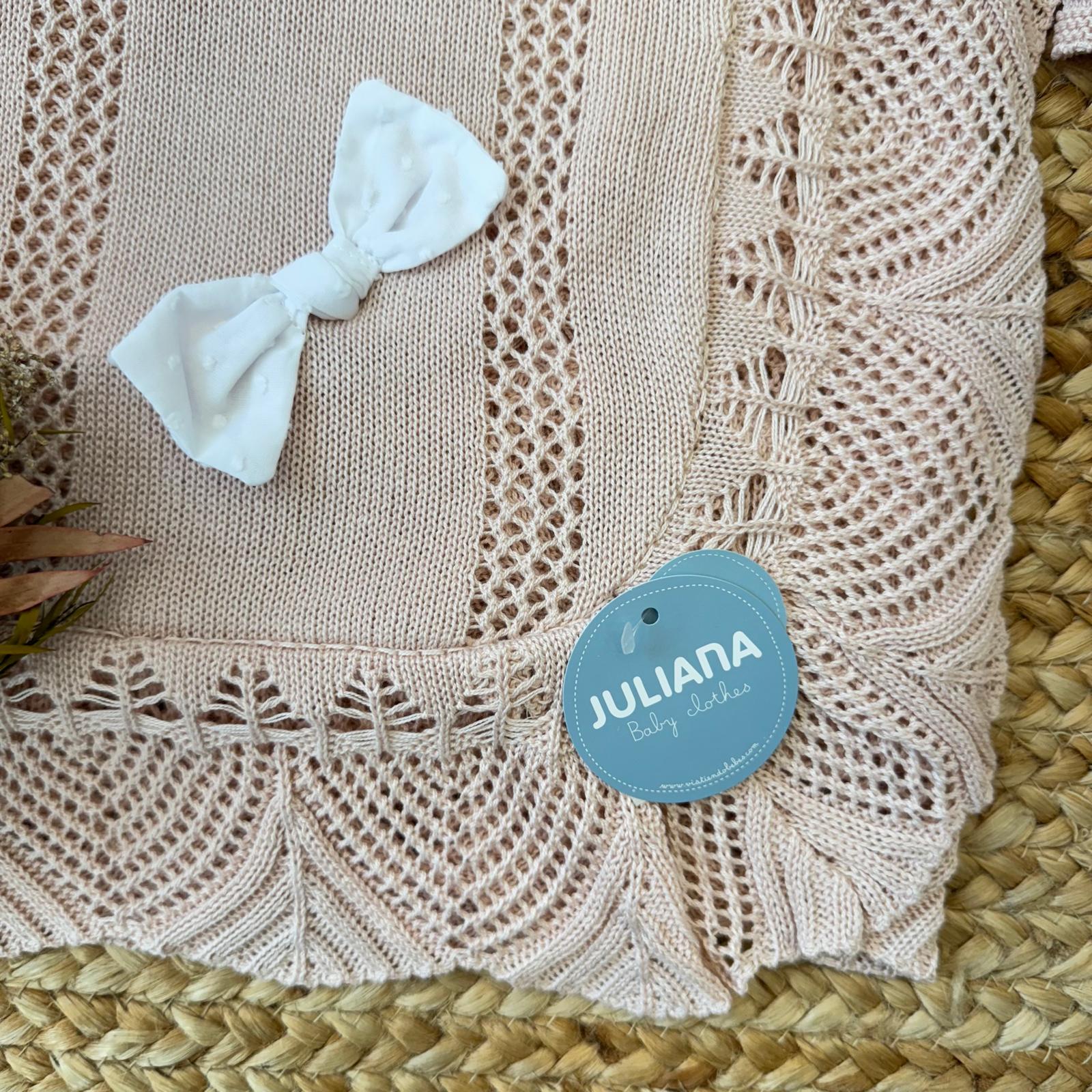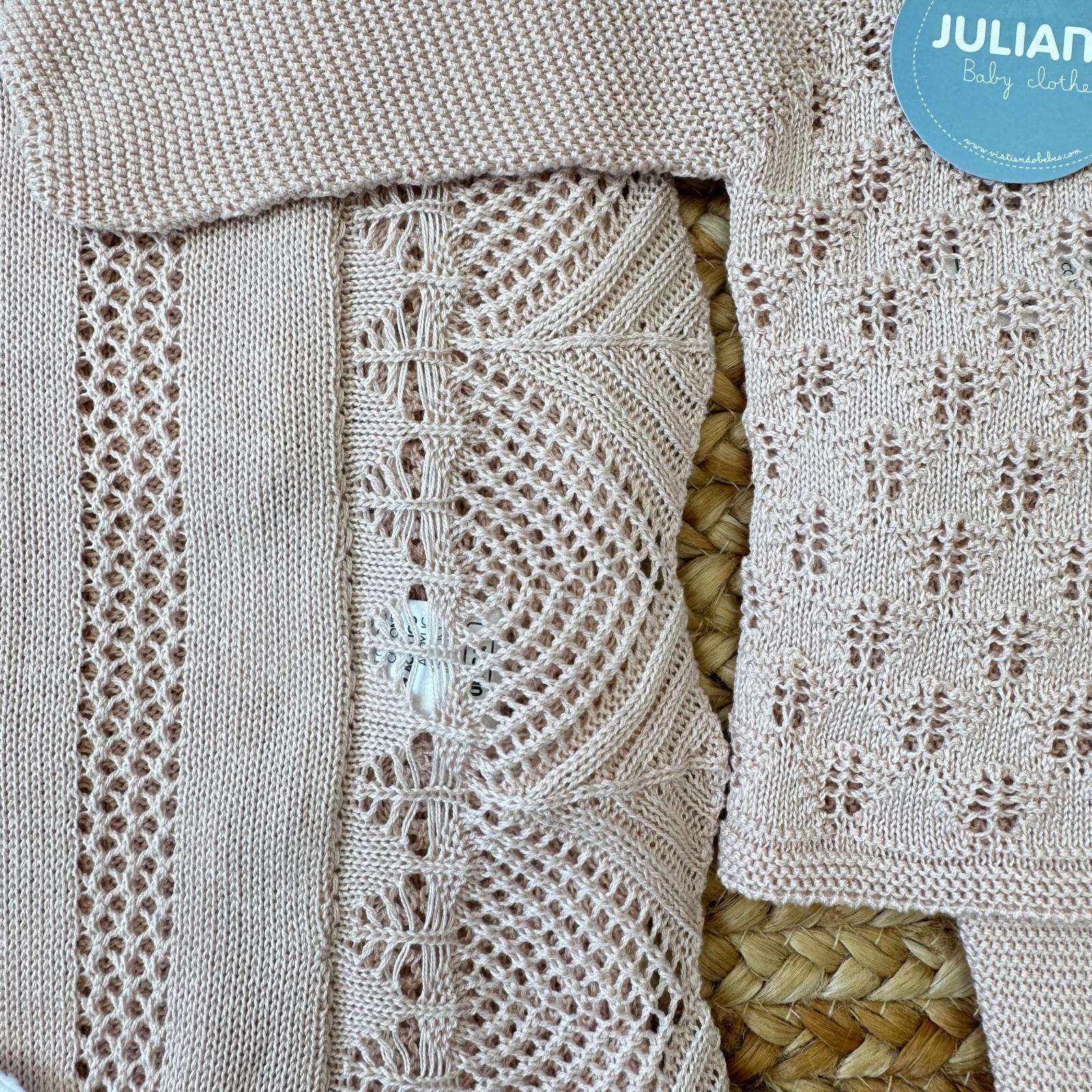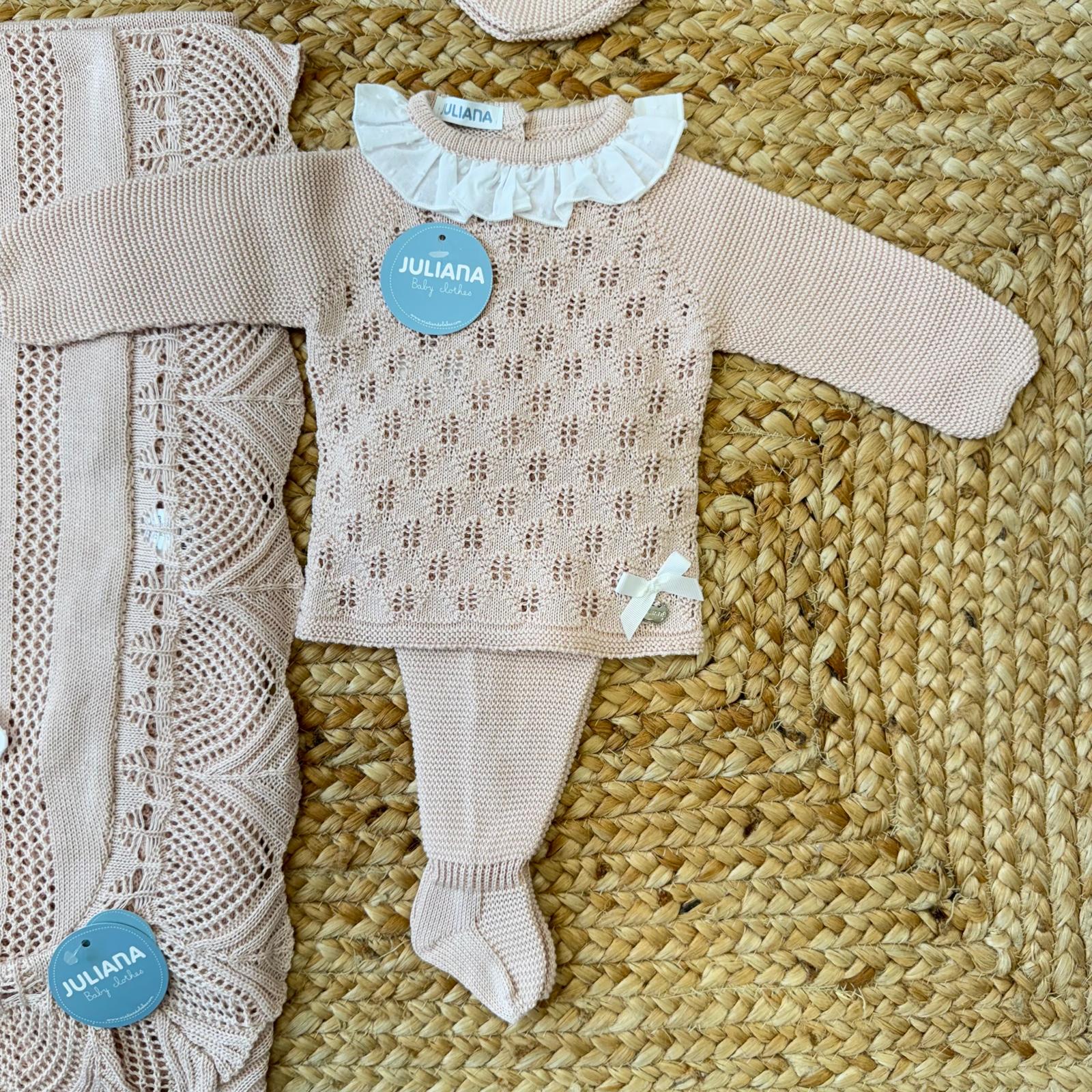 Perfetta come set nascita, coordinato prima nascita o completino per l’uscita clinica, è una scelta equilibrata tra eleganza e praticità. Le lavorazioni a maglia traforata donano leggerezza visiva e raffinatezza, rendendo questo completo ideale per le prime fotografie e per accogliere la neonata con stile.