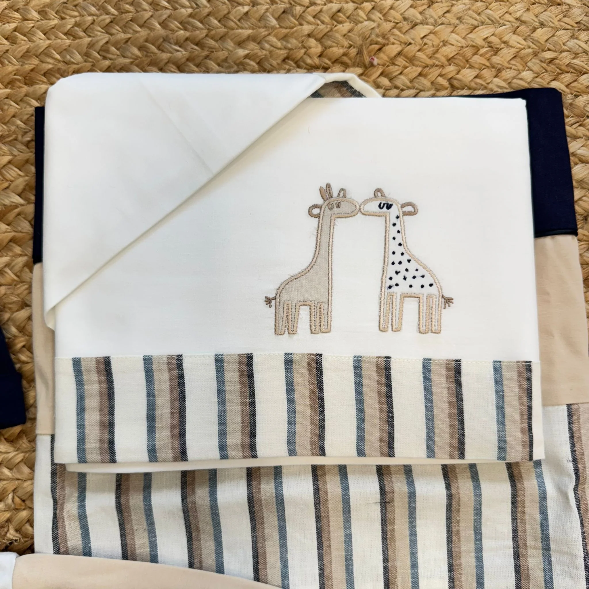 Il coordinato si presenta nei toni panna, beige e blu navy, con delicate righe verticali e tenerissime giraffe ricamate sul davanti della tutina e sulla coperta. Ogni dettaglio è studiato per offrire equilibrio tra stile raffinato e praticità quotidiana.