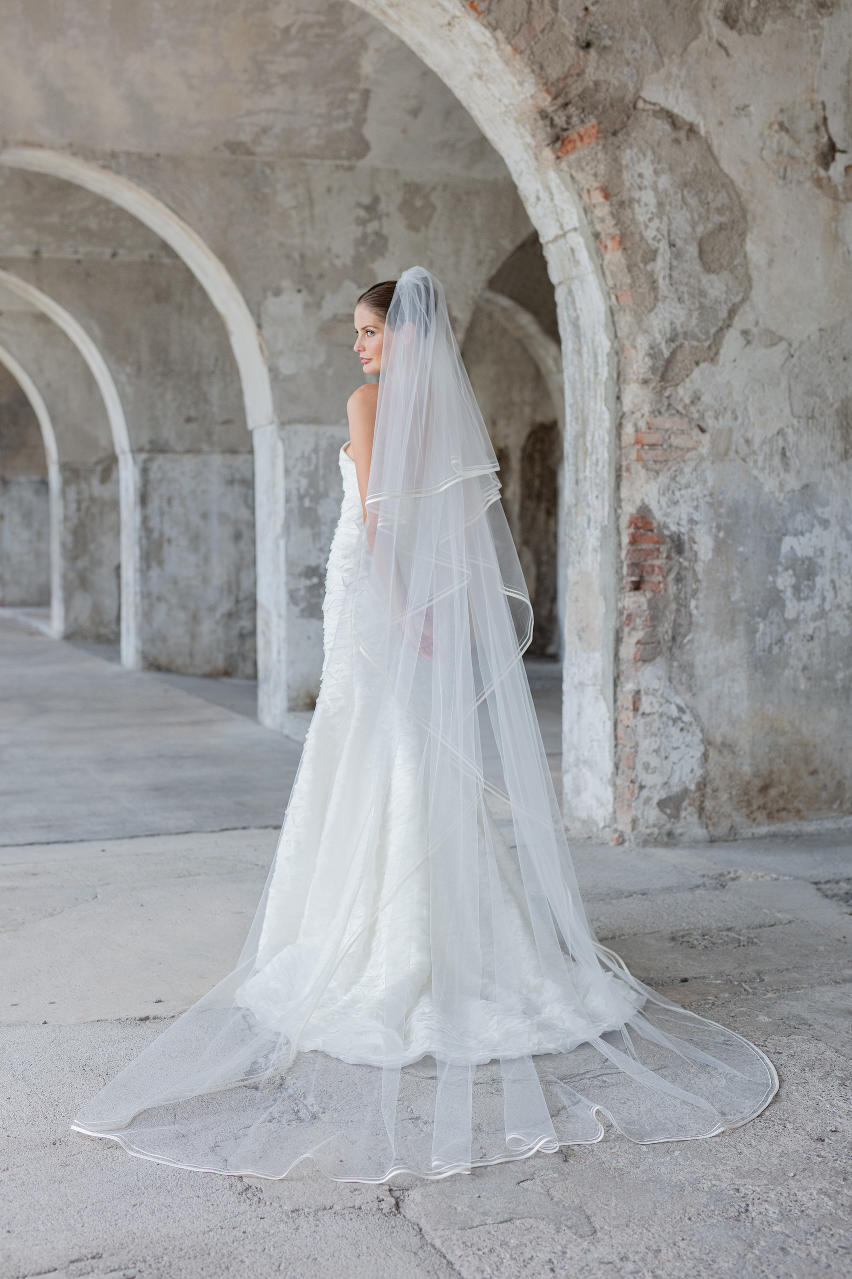 Il velo da sposa Valentina è essenziale ed elegante. La classica forma con calata è impreziosita da un pregiato ricamo con soutage, bordo di seta e cordonetto che lo rendono luminoso ed elegante. Il velo Valentina è versatile e raffinato, perfetto con abiti dal design pulito.