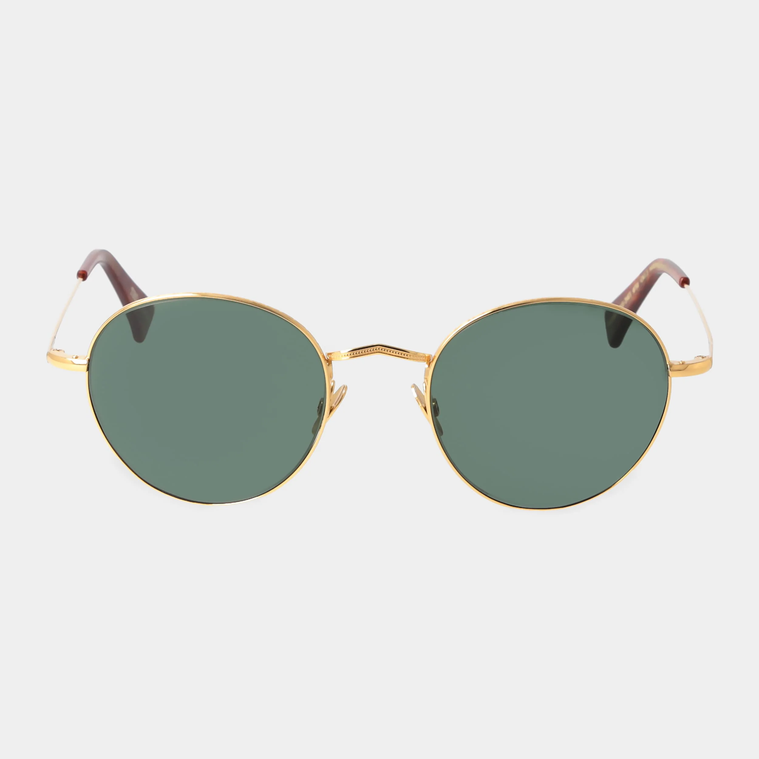 Forma rotonda retrò con l’iconico abbinamento montatura dorata e lente verde bottiglia, perfetto per ogni outfit, sia elegante che casual. Realizzati a mano in italia, bagnati in oro 24k.